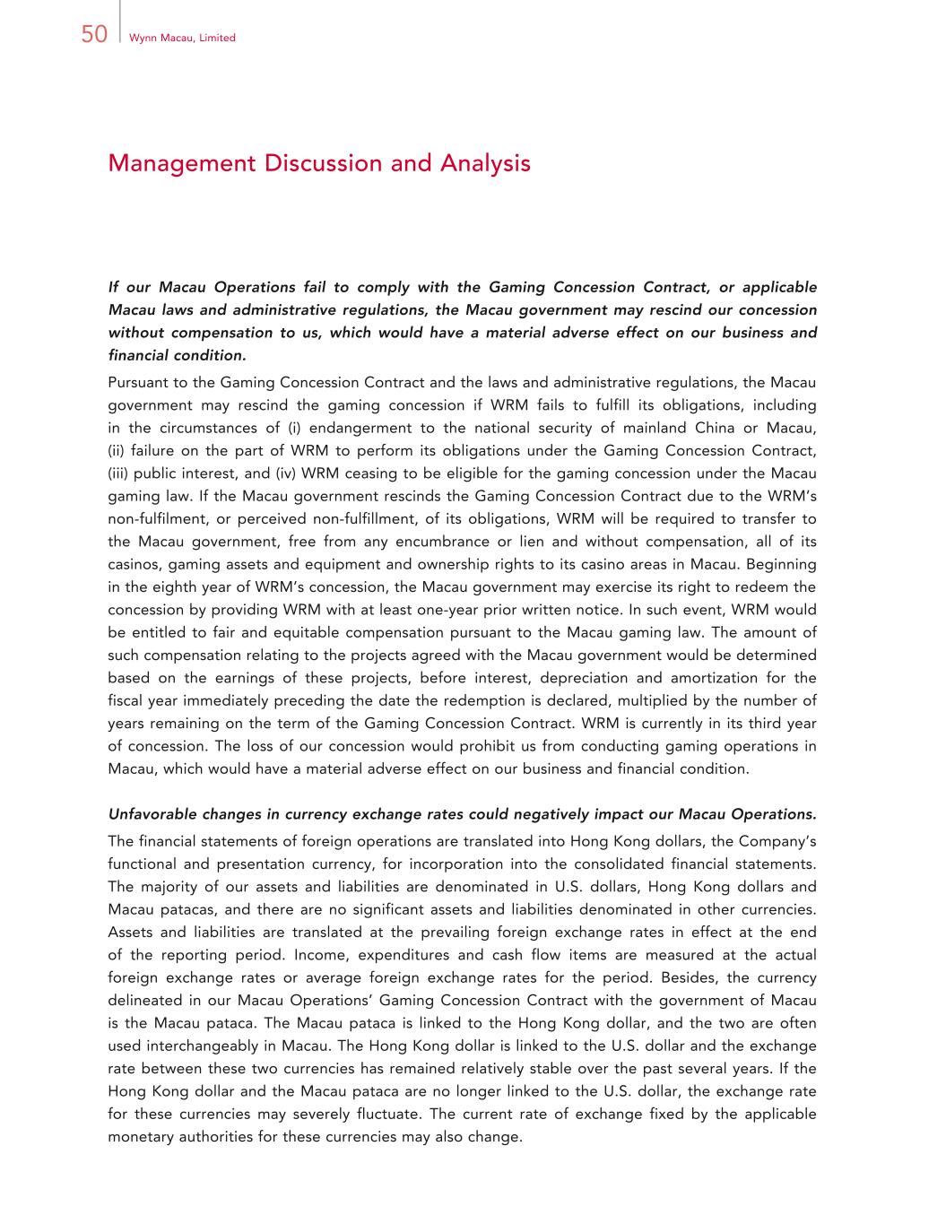 50 Wynn Macau, Limited Management Discussion and Analysis If our Macau Operations fail to comply with the Gaming Concession Contract, or applicable Macau laws and administrative regulations, the Macau government may rescind our concession without compensation to us, which would have a material adverse effect on our business and financial condition. Pursuant to the Gaming Concession Contract and the laws and administrative regulations, the Macau government may rescind the gaming concession if WRM fails to fulfill its obligations, including in the circumstances of (i) endangerment to the national security of mainland China or Macau, (ii) failure on the part of WRM to perform its obligations under the Gaming Concession Contract, (iii) public interest, and (iv) WRM ceasing to be eligible for the gaming concession under the Macau gaming law. If the Macau government rescinds the Gaming Concession Contract due to the WRM’s non-fulfilment, or perceived non-fulfillment, of its obligations, WRM will be required to transfer to the Macau government, free from any encumbrance or lien and without compensation, all of its casinos, gaming assets and equipment and ownership rights to its casino areas in Macau. Beginning in the eighth year of WRM’s concession, the Macau government may exercise its right to redeem the concession by providing WRM with at least one-year prior written notice. In such event, WRM would be entitled to fair and equitable compensation pursuant to the Macau gaming law. The amount of such compensation relating to the projects agreed with the Macau government would be determined based on the earnings of these projects, before interest, depreciation and amortization for the fiscal year immediately preceding the date the redemption is declared, multiplied by the number of years remaining on the term of the Gaming Concession Contract. WRM is currently in its third year of concession. The loss of our concession would prohibit us from conducting gaming operations in Macau, which would have a material adverse effect on our business and financial condition. Unfavorable changes in currency exchange rates could negatively impact our Macau Operations. The financial statements of foreign operations are translated into Hong Kong dollars, the Company’s functional and presentation currency, for incorporation into the consolidated financial statements. The majority of our assets and liabilities are denominated in U.S. dollars, Hong Kong dollars and Macau patacas, and there are no significant assets and liabilities denominated in other currencies. Assets and liabilities are translated at the prevailing foreign exchange rates in effect at the end of the reporting period. Income, expenditures and cash flow items are measured at the actual foreign exchange rates or average foreign exchange rates for the period. Besides, the currency delineated in our Macau Operations’ Gaming Concession Contract with the government of Macau is the Macau pataca. The Macau pataca is linked to the Hong Kong dollar, and the two are often used interchangeably in Macau. The Hong Kong dollar is linked to the U.S. dollar and the exchange rate between these two currencies has remained relatively stable over the past several years. If the Hong Kong dollar and the Macau pataca are no longer linked to the U.S. dollar, the exchange rate for these currencies may severely fluctuate. The current rate of exchange fixed by the applicable monetary authorities for these currencies may also change.