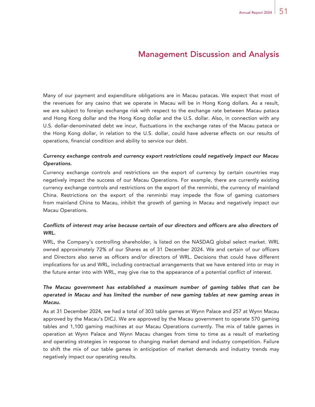51Annual Report 2024 Management Discussion and Analysis Many of our payment and expenditure obligations are in Macau patacas. We expect that most of the revenues for any casino that we operate in Macau will be in Hong Kong dollars. As a result, we are subject to foreign exchange risk with respect to the exchange rate between Macau pataca and Hong Kong dollar and the Hong Kong dollar and the U.S. dollar. Also, in connection with any U.S. dollar-denominated debt we incur, fluctuations in the exchange rates of the Macau pataca or the Hong Kong dollar, in relation to the U.S. dollar, could have adverse effects on our results of operations, financial condition and ability to service our debt. Currency exchange controls and currency export restrictions could negatively impact our Macau Operations. Currency exchange controls and restrictions on the export of currency by certain countries may negatively impact the success of our Macau Operations. For example, there are currently existing currency exchange controls and restrictions on the export of the renminbi, the currency of mainland China. Restrictions on the export of the renminbi may impede the flow of gaming customers from mainland China to Macau, inhibit the growth of gaming in Macau and negatively impact our Macau Operations. Conflicts of interest may arise because certain of our directors and officers are also directors of WRL. WRL, the Company’s controlling shareholder, is listed on the NASDAQ global select market. WRL owned approximately 72% of our Shares as of 31 December 2024. We and certain of our officers and Directors also serve as officers and/or directors of WRL. Decisions that could have different implications for us and WRL, including contractual arrangements that we have entered into or may in the future enter into with WRL, may give rise to the appearance of a potential conflict of interest. The Macau government has established a maximum number of gaming tables that can be operated in Macau and has limited the number of new gaming tables at new gaming areas in Macau. As at 31 December 2024, we had a total of 303 table games at Wynn Palace and 257 at Wynn Macau approved by the Macau’s DICJ. We are approved by the Macau government to operate 570 gaming tables and 1,100 gaming machines at our Macau Operations currently. The mix of table games in operation at Wynn Palace and Wynn Macau changes from time to time as a result of marketing and operating strategies in response to changing market demand and industry competition. Failure to shift the mix of our table games in anticipation of market demands and industry trends may negatively impact our operating results.