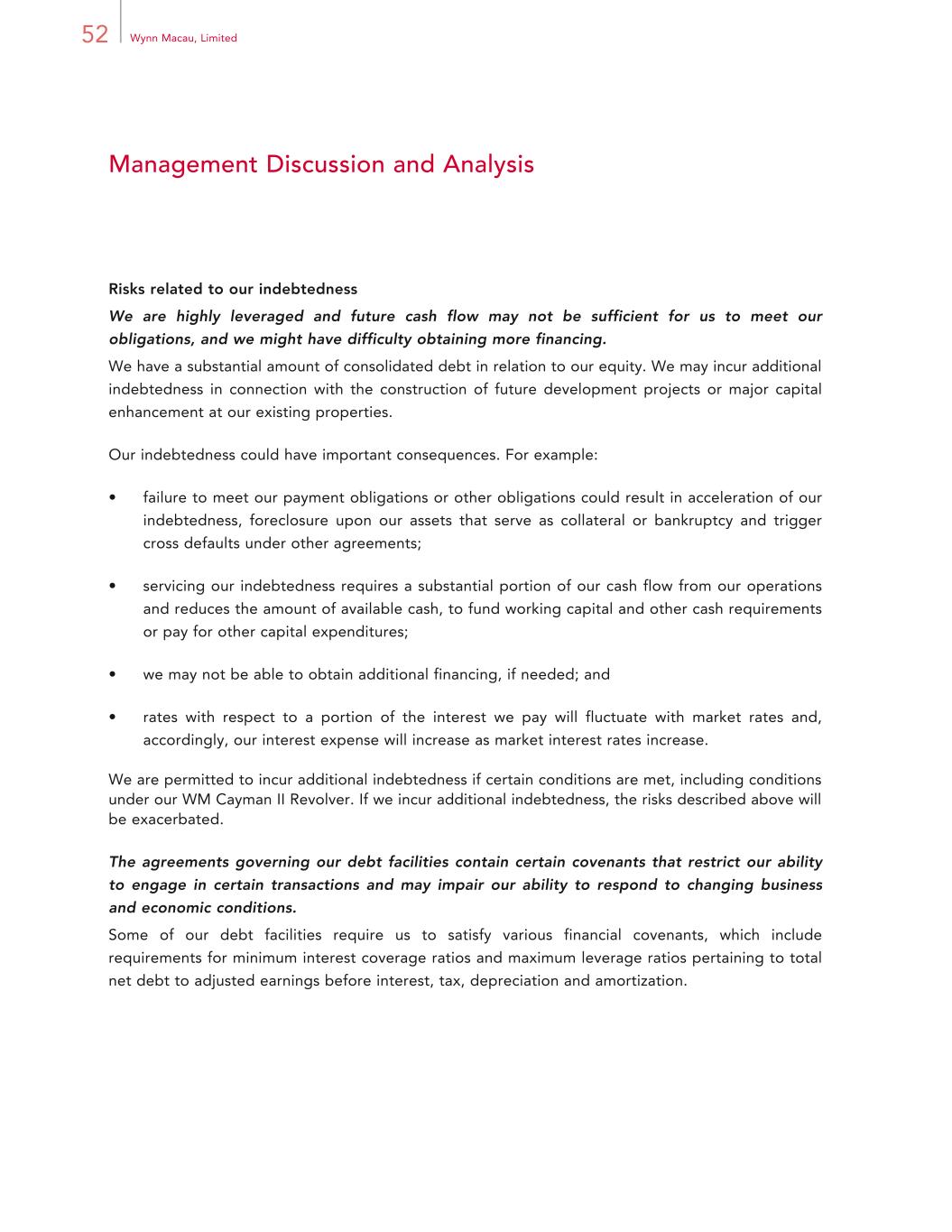 52 Wynn Macau, Limited Management Discussion and Analysis Risks related to our indebtedness We are highly leveraged and future cash flow may not be sufficient for us to meet our obligations, and we might have difficulty obtaining more financing. We have a substantial amount of consolidated debt in relation to our equity. We may incur additional indebtedness in connection with the construction of future development projects or major capital enhancement at our existing properties. Our indebtedness could have important consequences. For example: • failure to meet our payment obligations or other obligations could result in acceleration of our indebtedness, foreclosure upon our assets that serve as collateral or bankruptcy and trigger cross defaults under other agreements; • servicing our indebtedness requires a substantial portion of our cash flow from our operations and reduces the amount of available cash, to fund working capital and other cash requirements or pay for other capital expenditures; • we may not be able to obtain additional financing, if needed; and • rates with respect to a portion of the interest we pay will fluctuate with market rates and, accordingly, our interest expense will increase as market interest rates increase. We are permitted to incur additional indebtedness if certain conditions are met, including conditions under our WM Cayman II Revolver. If we incur additional indebtedness, the risks described above will be exacerbated. The agreements governing our debt facilities contain certain covenants that restrict our ability to engage in certain transactions and may impair our ability to respond to changing business and economic conditions. Some of our debt facilities require us to satisfy various financial covenants, which include requirements for minimum interest coverage ratios and maximum leverage ratios pertaining to total net debt to adjusted earnings before interest, tax, depreciation and amortization.
