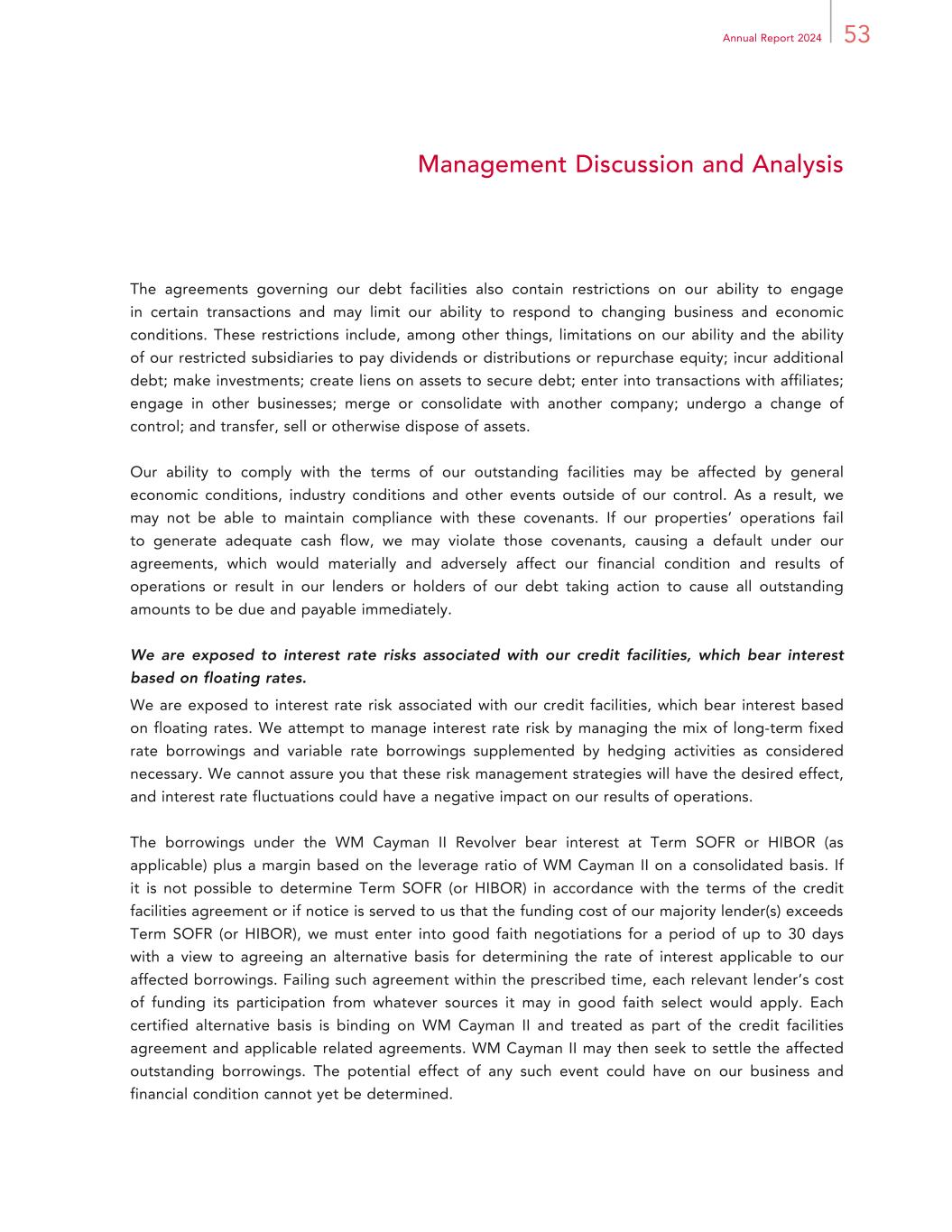 53Annual Report 2024 Management Discussion and Analysis The agreements governing our debt facilities also contain restrictions on our ability to engage in certain transactions and may limit our ability to respond to changing business and economic conditions. These restrictions include, among other things, limitations on our ability and the ability of our restricted subsidiaries to pay dividends or distributions or repurchase equity; incur additional debt; make investments; create liens on assets to secure debt; enter into transactions with affiliates; engage in other businesses; merge or consolidate with another company; undergo a change of control; and transfer, sell or otherwise dispose of assets. Our ability to comply with the terms of our outstanding facilities may be affected by general economic conditions, industry conditions and other events outside of our control. As a result, we may not be able to maintain compliance with these covenants. If our properties’ operations fail to generate adequate cash flow, we may violate those covenants, causing a default under our agreements, which would materially and adversely affect our financial condition and results of operations or result in our lenders or holders of our debt taking action to cause all outstanding amounts to be due and payable immediately. We are exposed to interest rate risks associated with our credit facilities, which bear interest based on floating rates. We are exposed to interest rate risk associated with our credit facilities, which bear interest based on floating rates. We attempt to manage interest rate risk by managing the mix of long-term fixed rate borrowings and variable rate borrowings supplemented by hedging activities as considered necessary. We cannot assure you that these risk management strategies will have the desired effect, and interest rate fluctuations could have a negative impact on our results of operations. The borrowings under the WM Cayman II Revolver bear interest at Term SOFR or HIBOR (as applicable) plus a margin based on the leverage ratio of WM Cayman II on a consolidated basis. If it is not possible to determine Term SOFR (or HIBOR) in accordance with the terms of the credit facilities agreement or if notice is served to us that the funding cost of our majority lender(s) exceeds Term SOFR (or HIBOR), we must enter into good faith negotiations for a period of up to 30 days with a view to agreeing an alternative basis for determining the rate of interest applicable to our affected borrowings. Failing such agreement within the prescribed time, each relevant lender’s cost of funding its participation from whatever sources it may in good faith select would apply. Each certified alternative basis is binding on WM Cayman II and treated as part of the credit facilities agreement and applicable related agreements. WM Cayman II may then seek to settle the affected outstanding borrowings. The potential effect of any such event could have on our business and financial condition cannot yet be determined.