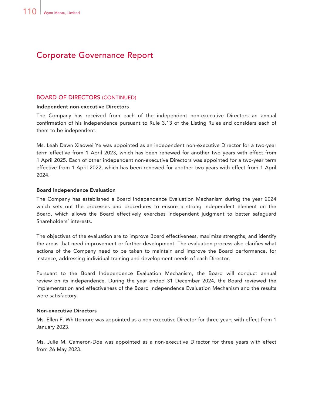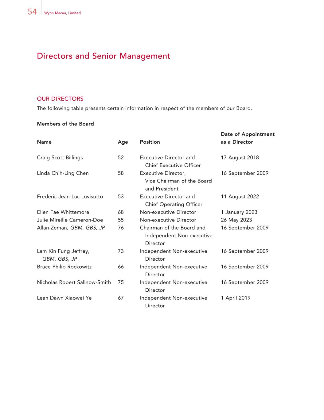 54 Wynn Macau, Limited Directors and Senior Management OUR DIRECTORS The following table presents certain information in respect of the members of our Board. Members of the Board Name Age Position Date of Appointment as a Director Craig Scott Billings 52 Executive Director and Chief Executive Officer 17 August 2018 Linda Chih-Ling Chen 58 Executive Director, Vice Chairman of the Board and President 16 September 2009 Frederic Jean-Luc Luvisutto 53 Executive Director and Chief Operating Officer 11 August 2022 Ellen Fae Whittemore 68 Non-executive Director 1 January 2023 Julie Mireille Cameron-Doe 55 Non-executive Director 26 May 2023 Allan Zeman, GBM, GBS, JP 76 Chairman of the Board and Independent Non-executive Director 16 September 2009 Lam Kin Fung Jeffrey, GBM, GBS, JP 73 Independent Non-executive Director 16 September 2009 Bruce Philip Rockowitz 66 Independent Non-executive Director 16 September 2009 Nicholas Robert Sallnow-Smith 75 Independent Non-executive Director 16 September 2009 Leah Dawn Xiaowei Ye 67 Independent Non-executive Director 1 April 2019