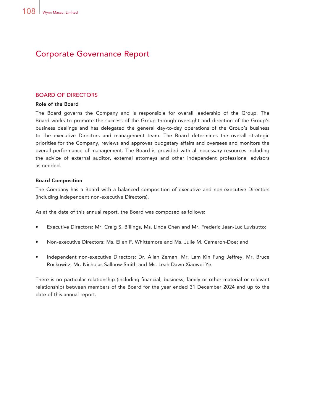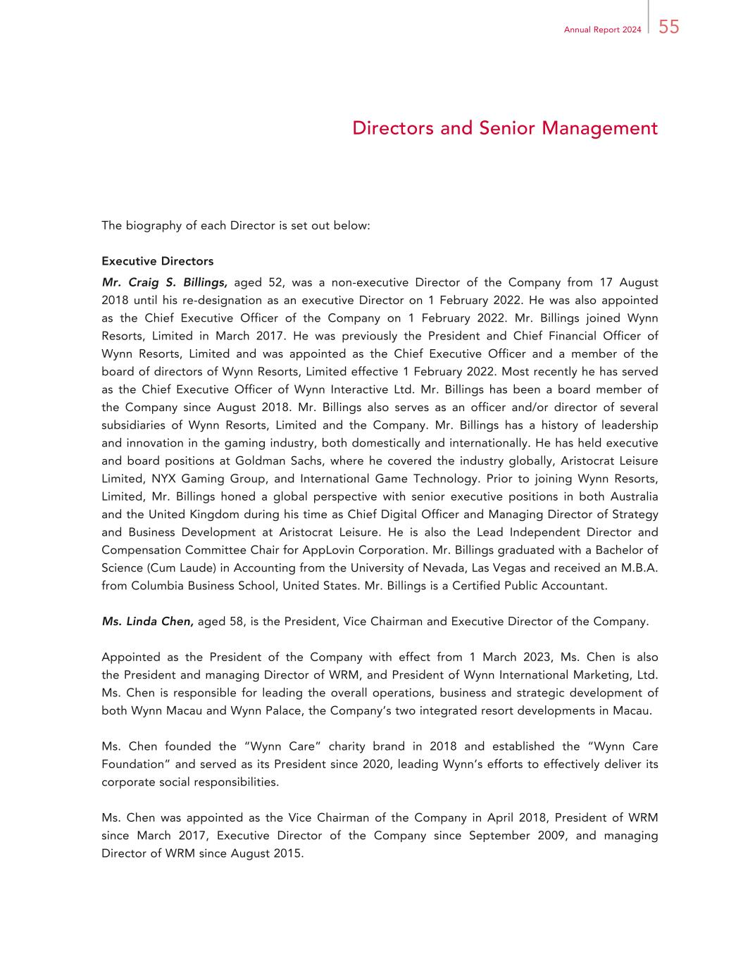 55Annual Report 2024 Directors and Senior Management The biography of each Director is set out below: Executive Directors Mr. Craig S. Billings, aged 52, was a non-executive Director of the Company from 17 August 2018 until his re-designation as an executive Director on 1 February 2022. He was also appointed as the Chief Executive Officer of the Company on 1 February 2022. Mr. Billings joined Wynn Resorts, Limited in March 2017. He was previously the President and Chief Financial Officer of Wynn Resorts, Limited and was appointed as the Chief Executive Officer and a member of the board of directors of Wynn Resorts, Limited effective 1 February 2022. Most recently he has served as the Chief Executive Officer of Wynn Interactive Ltd. Mr. Billings has been a board member of the Company since August 2018. Mr. Billings also serves as an officer and/or director of several subsidiaries of Wynn Resorts, Limited and the Company. Mr. Billings has a history of leadership and innovation in the gaming industry, both domestically and internationally. He has held executive and board positions at Goldman Sachs, where he covered the industry globally, Aristocrat Leisure Limited, NYX Gaming Group, and International Game Technology. Prior to joining Wynn Resorts, Limited, Mr. Billings honed a global perspective with senior executive positions in both Australia and the United Kingdom during his time as Chief Digital Officer and Managing Director of Strategy and Business Development at Aristocrat Leisure. He is also the Lead Independent Director and Compensation Committee Chair for AppLovin Corporation. Mr. Billings graduated with a Bachelor of Science (Cum Laude) in Accounting from the University of Nevada, Las Vegas and received an M.B.A. from Columbia Business School, United States. Mr. Billings is a Certified Public Accountant. Ms. Linda Chen, aged 58, is the President, Vice Chairman and Executive Director of the Company. Appointed as the President of the Company with effect from 1 March 2023, Ms. Chen is also the President and managing Director of WRM, and President of Wynn International Marketing, Ltd. Ms. Chen is responsible for leading the overall operations, business and strategic development of both Wynn Macau and Wynn Palace, the Company’s two integrated resort developments in Macau. Ms. Chen founded the “Wynn Care” charity brand in 2018 and established the “Wynn Care Foundation” and served as its President since 2020, leading Wynn’s efforts to effectively deliver its corporate social responsibilities. Ms. Chen was appointed as the Vice Chairman of the Company in April 2018, President of WRM since March 2017, Executive Director of the Company since September 2009, and managing Director of WRM since August 2015.