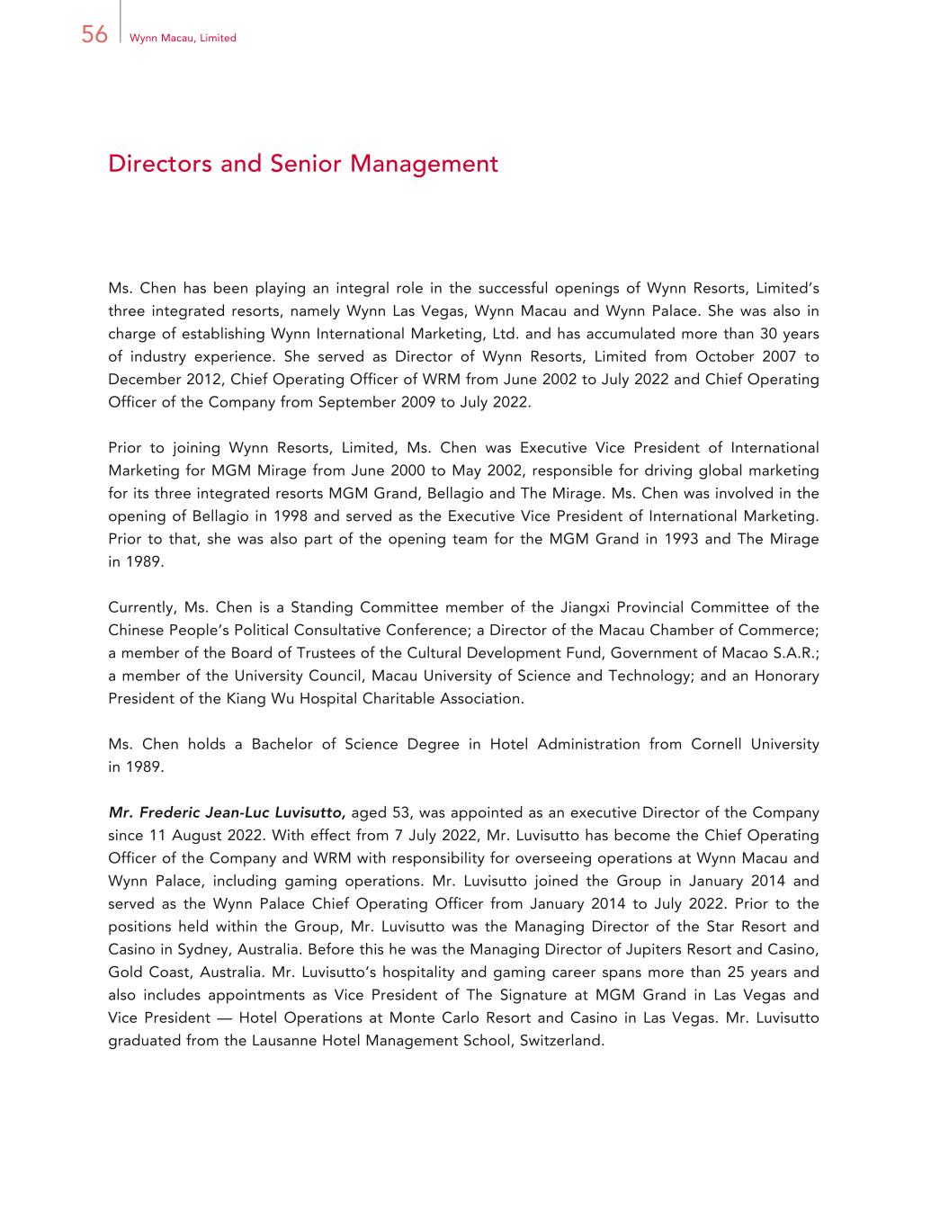56 Wynn Macau, Limited Directors and Senior Management Ms. Chen has been playing an integral role in the successful openings of Wynn Resorts, Limited’s three integrated resorts, namely Wynn Las Vegas, Wynn Macau and Wynn Palace. She was also in charge of establishing Wynn International Marketing, Ltd. and has accumulated more than 30 years of industry experience. She served as Director of Wynn Resorts, Limited from October 2007 to December 2012, Chief Operating Officer of WRM from June 2002 to July 2022 and Chief Operating Officer of the Company from September 2009 to July 2022. Prior to joining Wynn Resorts, Limited, Ms. Chen was Executive Vice President of International Marketing for MGM Mirage from June 2000 to May 2002, responsible for driving global marketing for its three integrated resorts MGM Grand, Bellagio and The Mirage. Ms. Chen was involved in the opening of Bellagio in 1998 and served as the Executive Vice President of International Marketing. Prior to that, she was also part of the opening team for the MGM Grand in 1993 and The Mirage in 1989. Currently, Ms. Chen is a Standing Committee member of the Jiangxi Provincial Committee of the Chinese People’s Political Consultative Conference; a Director of the Macau Chamber of Commerce; a member of the Board of Trustees of the Cultural Development Fund, Government of Macao S.A.R.; a member of the University Council, Macau University of Science and Technology; and an Honorary President of the Kiang Wu Hospital Charitable Association. Ms. Chen holds a Bachelor of Science Degree in Hotel Administration from Cornell University in 1989. Mr. Frederic Jean-Luc Luvisutto, aged 53, was appointed as an executive Director of the Company since 11 August 2022. With effect from 7 July 2022, Mr. Luvisutto has become the Chief Operating Officer of the Company and WRM with responsibility for overseeing operations at Wynn Macau and Wynn Palace, including gaming operations. Mr. Luvisutto joined the Group in January 2014 and served as the Wynn Palace Chief Operating Officer from January 2014 to July 2022. Prior to the positions held within the Group, Mr. Luvisutto was the Managing Director of the Star Resort and Casino in Sydney, Australia. Before this he was the Managing Director of Jupiters Resort and Casino, Gold Coast, Australia. Mr. Luvisutto’s hospitality and gaming career spans more than 25 years and also includes appointments as Vice President of The Signature at MGM Grand in Las Vegas and Vice President — Hotel Operations at Monte Carlo Resort and Casino in Las Vegas. Mr. Luvisutto graduated from the Lausanne Hotel Management School, Switzerland.