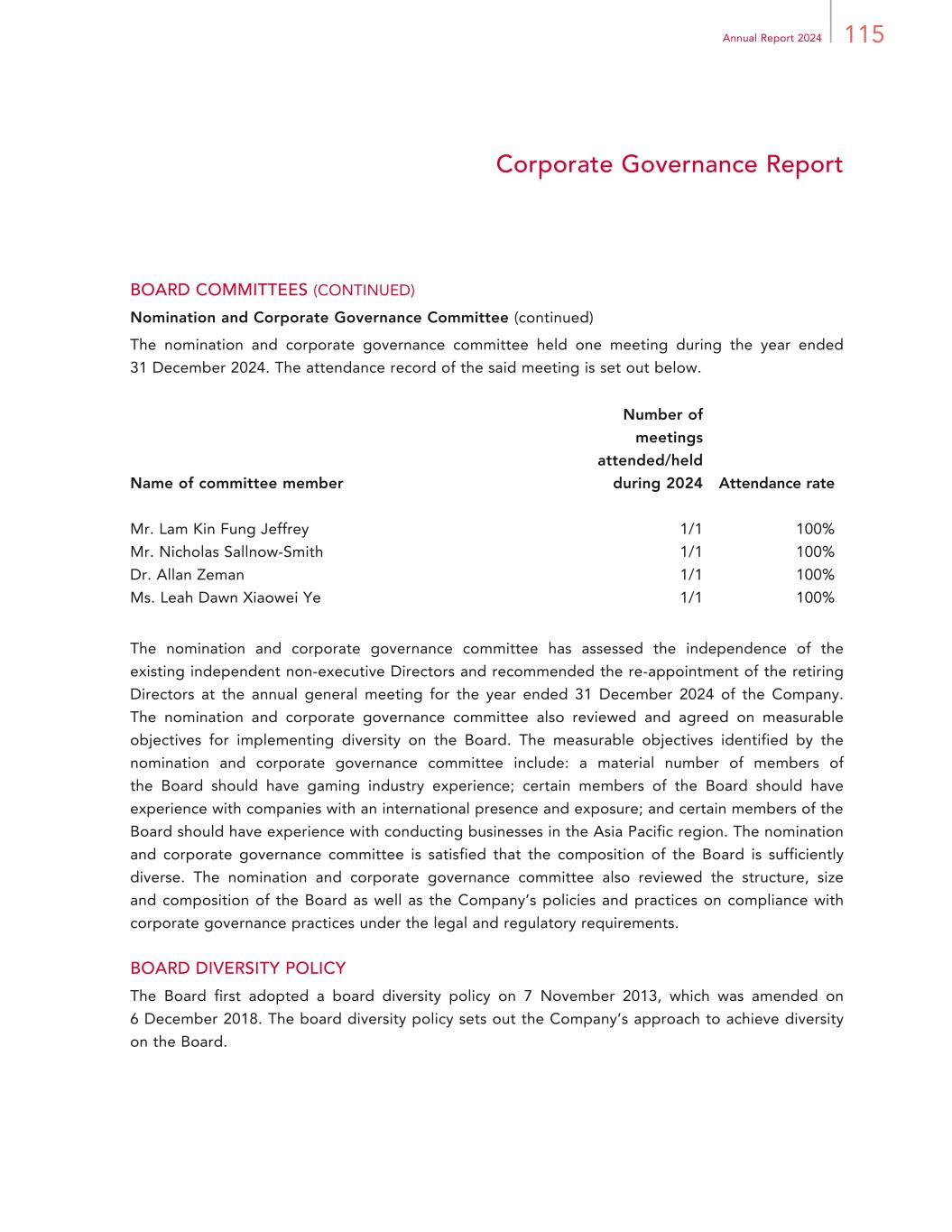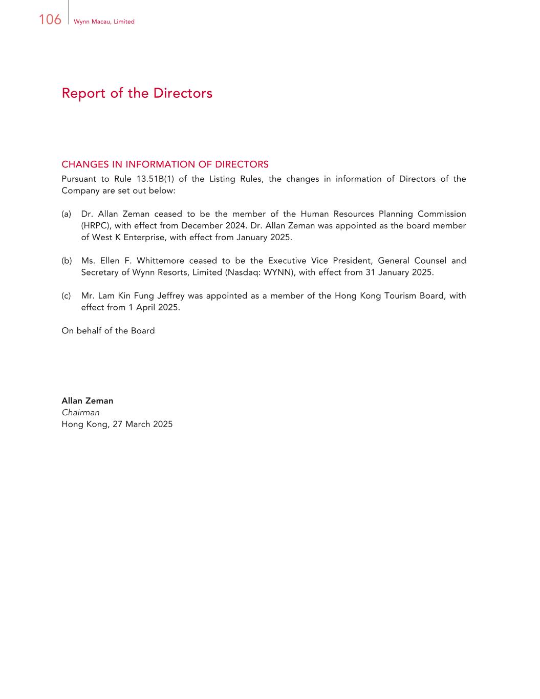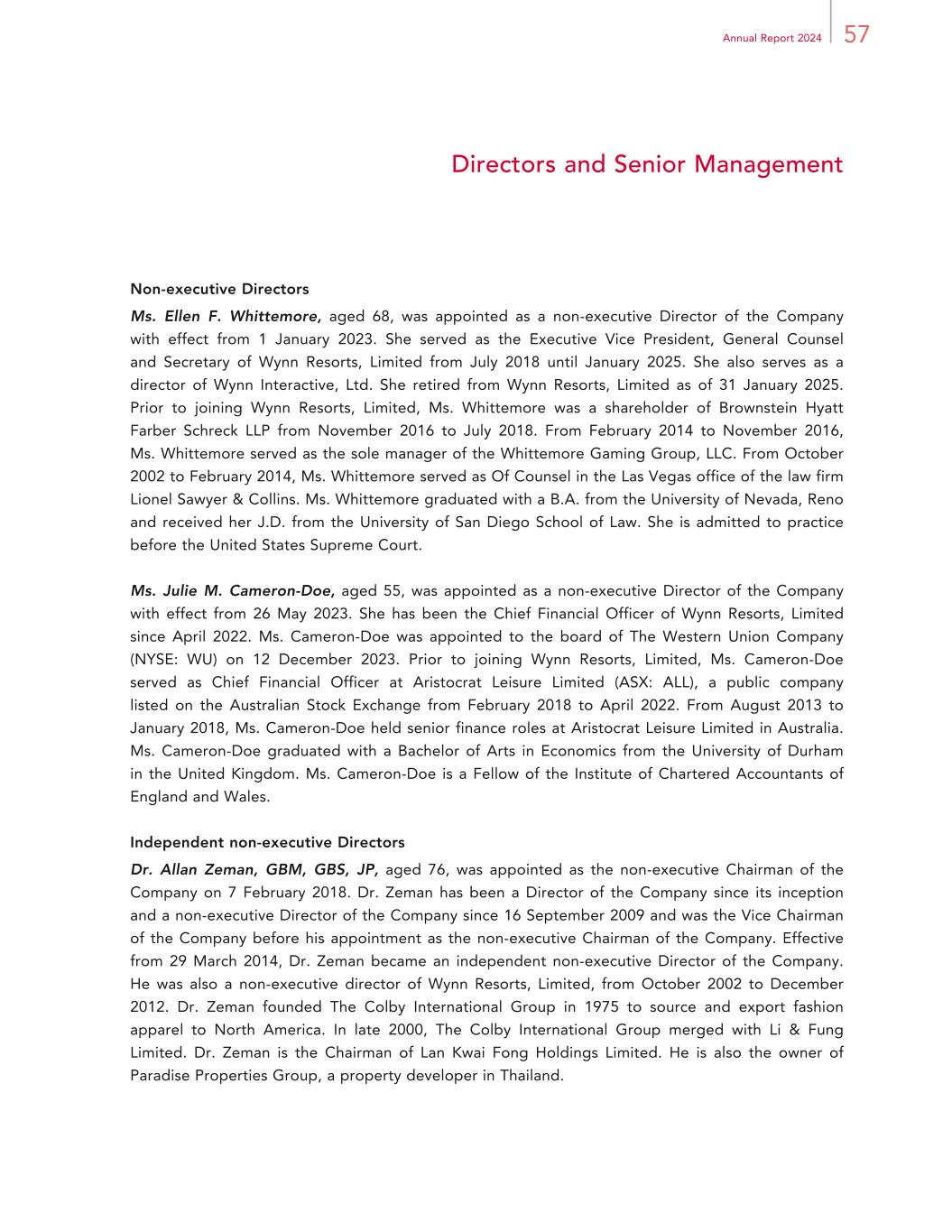 57Annual Report 2024 Directors and Senior Management Non-executive Directors Ms. Ellen F. Whittemore, aged 68, was appointed as a non-executive Director of the Company with effect from 1 January 2023. She served as the Executive Vice President, General Counsel and Secretary of Wynn Resorts, Limited from July 2018 until January 2025. She also serves as a director of Wynn Interactive, Ltd. She retired from Wynn Resorts, Limited as of 31 January 2025. Prior to joining Wynn Resorts, Limited, Ms. Whittemore was a shareholder of Brownstein Hyatt Farber Schreck LLP from November 2016 to July 2018. From February 2014 to November 2016, Ms. Whittemore served as the sole manager of the Whittemore Gaming Group, LLC. From October 2002 to February 2014, Ms. Whittemore served as Of Counsel in the Las Vegas office of the law firm Lionel Sawyer & Collins. Ms. Whittemore graduated with a B.A. from the University of Nevada, Reno and received her J.D. from the University of San Diego School of Law. She is admitted to practice before the United States Supreme Court. Ms. Julie M. Cameron-Doe, aged 55, was appointed as a non-executive Director of the Company with effect from 26 May 2023. She has been the Chief Financial Officer of Wynn Resorts, Limited since April 2022. Ms. Cameron-Doe was appointed to the board of The Western Union Company (NYSE: WU) on 12 December 2023. Prior to joining Wynn Resorts, Limited, Ms. Cameron-Doe served as Chief Financial Officer at Aristocrat Leisure Limited (ASX: ALL), a public company listed on the Australian Stock Exchange from February 2018 to April 2022. From August 2013 to January 2018, Ms. Cameron-Doe held senior finance roles at Aristocrat Leisure Limited in Australia. Ms. Cameron-Doe graduated with a Bachelor of Arts in Economics from the University of Durham in the United Kingdom. Ms. Cameron-Doe is a Fellow of the Institute of Chartered Accountants of England and Wales. Independent non-executive Directors Dr. Allan Zeman, GBM, GBS, JP, aged 76, was appointed as the non-executive Chairman of the Company on 7 February 2018. Dr. Zeman has been a Director of the Company since its inception and a non-executive Director of the Company since 16 September 2009 and was the Vice Chairman of the Company before his appointment as the non-executive Chairman of the Company. Effective from 29 March 2014, Dr. Zeman became an independent non-executive Director of the Company. He was also a non-executive director of Wynn Resorts, Limited, from October 2002 to December 2012. Dr. Zeman founded The Colby International Group in 1975 to source and export fashion apparel to North America. In late 2000, The Colby International Group merged with Li & Fung Limited. Dr. Zeman is the Chairman of Lan Kwai Fong Holdings Limited. He is also the owner of Paradise Properties Group, a property developer in Thailand.