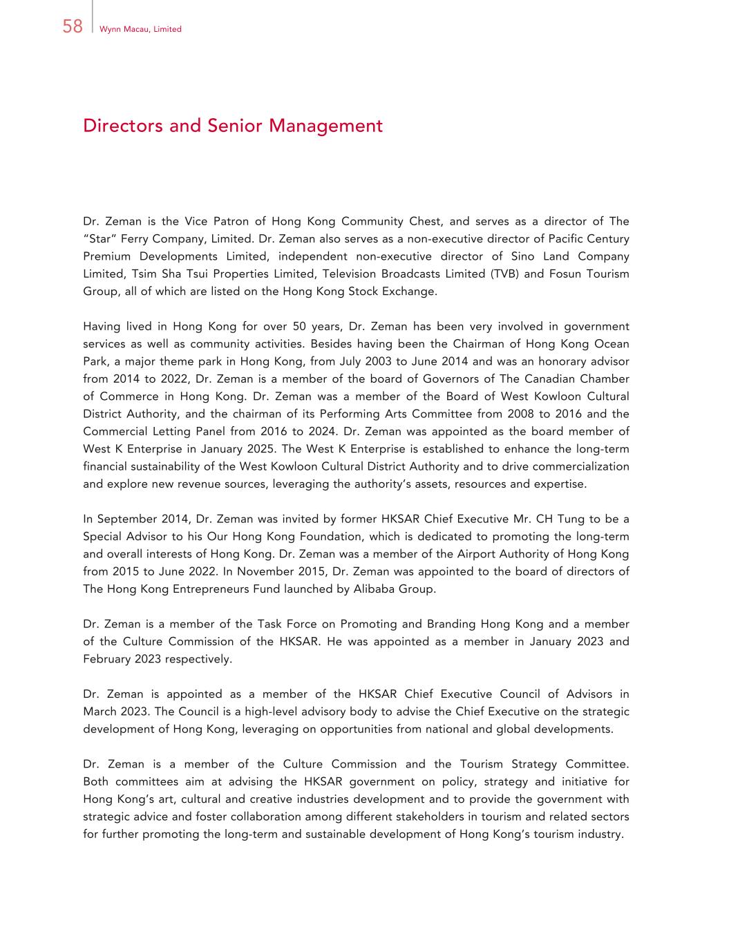 58 Wynn Macau, Limited Directors and Senior Management Dr. Zeman is the Vice Patron of Hong Kong Community Chest, and serves as a director of The “Star” Ferry Company, Limited. Dr. Zeman also serves as a non-executive director of Pacific Century Premium Developments Limited, independent non-executive director of Sino Land Company Limited, Tsim Sha Tsui Properties Limited, Television Broadcasts Limited (TVB) and Fosun Tourism Group, all of which are listed on the Hong Kong Stock Exchange. Having lived in Hong Kong for over 50 years, Dr. Zeman has been very involved in government services as well as community activities. Besides having been the Chairman of Hong Kong Ocean Park, a major theme park in Hong Kong, from July 2003 to June 2014 and was an honorary advisor from 2014 to 2022, Dr. Zeman is a member of the board of Governors of The Canadian Chamber of Commerce in Hong Kong. Dr. Zeman was a member of the Board of West Kowloon Cultural District Authority, and the chairman of its Performing Arts Committee from 2008 to 2016 and the Commercial Letting Panel from 2016 to 2024. Dr. Zeman was appointed as the board member of West K Enterprise in January 2025. The West K Enterprise is established to enhance the long-term financial sustainability of the West Kowloon Cultural District Authority and to drive commercialization and explore new revenue sources, leveraging the authority’s assets, resources and expertise. In September 2014, Dr. Zeman was invited by former HKSAR Chief Executive Mr. CH Tung to be a Special Advisor to his Our Hong Kong Foundation, which is dedicated to promoting the long-term and overall interests of Hong Kong. Dr. Zeman was a member of the Airport Authority of Hong Kong from 2015 to June 2022. In November 2015, Dr. Zeman was appointed to the board of directors of The Hong Kong Entrepreneurs Fund launched by Alibaba Group. Dr. Zeman is a member of the Task Force on Promoting and Branding Hong Kong and a member of the Culture Commission of the HKSAR. He was appointed as a member in January 2023 and February 2023 respectively. Dr. Zeman is appointed as a member of the HKSAR Chief Executive Council of Advisors in March 2023. The Council is a high-level advisory body to advise the Chief Executive on the strategic development of Hong Kong, leveraging on opportunities from national and global developments. Dr. Zeman is a member of the Culture Commission and the Tourism Strategy Committee. Both committees aim at advising the HKSAR government on policy, strategy and initiative for Hong Kong’s art, cultural and creative industries development and to provide the government with strategic advice and foster collaboration among different stakeholders in tourism and related sectors for further promoting the long-term and sustainable development of Hong Kong’s tourism industry.