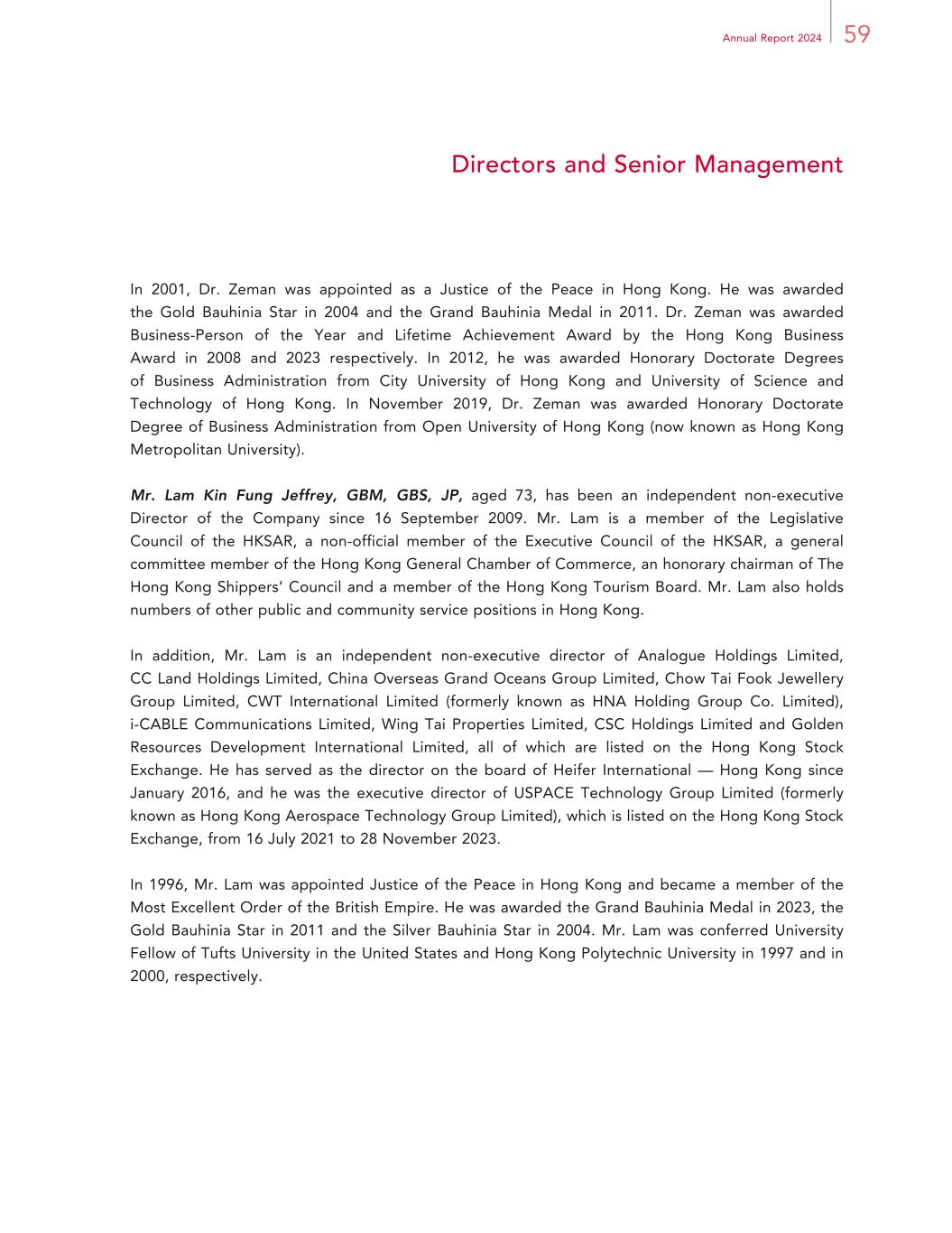 59Annual Report 2024 Directors and Senior Management In 2001, Dr. Zeman was appointed as a Justice of the Peace in Hong Kong. He was awarded the Gold Bauhinia Star in 2004 and the Grand Bauhinia Medal in 2011. Dr. Zeman was awarded Business-Person of the Year and Lifetime Achievement Award by the Hong Kong Business Award in 2008 and 2023 respectively. In 2012, he was awarded Honorary Doctorate Degrees of Business Administration from City University of Hong Kong and University of Science and Technology of Hong Kong. In November 2019, Dr. Zeman was awarded Honorary Doctorate Degree of Business Administration from Open University of Hong Kong (now known as Hong Kong Metropolitan University). Mr. Lam Kin Fung Jeffrey, GBM, GBS, JP, aged 73, has been an independent non-executive Director of the Company since 16 September 2009. Mr. Lam is a member of the Legislative Council of the HKSAR, a non-official member of the Executive Council of the HKSAR, a general committee member of the Hong Kong General Chamber of Commerce, an honorary chairman of The Hong Kong Shippers’ Council and a member of the Hong Kong Tourism Board. Mr. Lam also holds numbers of other public and community service positions in Hong Kong. In addition, Mr. Lam is an independent non-executive director of Analogue Holdings Limited, CC Land Holdings Limited, China Overseas Grand Oceans Group Limited, Chow Tai Fook Jewellery Group Limited, CWT International Limited (formerly known as HNA Holding Group Co. Limited), i-CABLE Communications Limited, Wing Tai Properties Limited, CSC Holdings Limited and Golden Resources Development International Limited, all of which are listed on the Hong Kong Stock Exchange. He has served as the director on the board of Heifer International — Hong Kong since January 2016, and he was the executive director of USPACE Technology Group Limited (formerly known as Hong Kong Aerospace Technology Group Limited), which is listed on the Hong Kong Stock Exchange, from 16 July 2021 to 28 November 2023. In 1996, Mr. Lam was appointed Justice of the Peace in Hong Kong and became a member of the Most Excellent Order of the British Empire. He was awarded the Grand Bauhinia Medal in 2023, the Gold Bauhinia Star in 2011 and the Silver Bauhinia Star in 2004. Mr. Lam was conferred University Fellow of Tufts University in the United States and Hong Kong Polytechnic University in 1997 and in 2000, respectively.