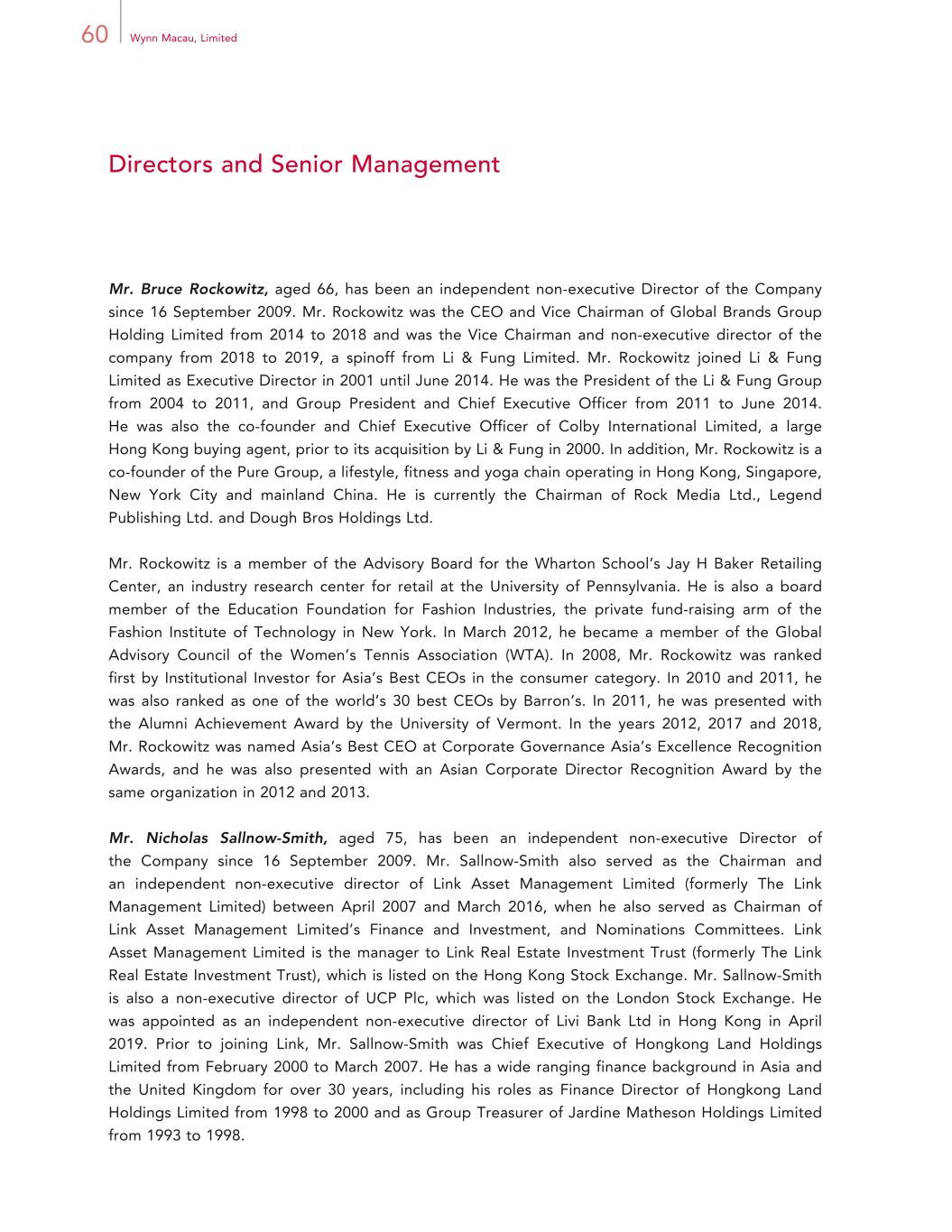 60 Wynn Macau, Limited Directors and Senior Management Mr. Bruce Rockowitz, aged 66, has been an independent non-executive Director of the Company since 16 September 2009. Mr. Rockowitz was the CEO and Vice Chairman of Global Brands Group Holding Limited from 2014 to 2018 and was the Vice Chairman and non-executive director of the company from 2018 to 2019, a spinoff from Li & Fung Limited. Mr. Rockowitz joined Li & Fung Limited as Executive Director in 2001 until June 2014. He was the President of the Li & Fung Group from 2004 to 2011, and Group President and Chief Executive Officer from 2011 to June 2014. He was also the co-founder and Chief Executive Officer of Colby International Limited, a large Hong Kong buying agent, prior to its acquisition by Li & Fung in 2000. In addition, Mr. Rockowitz is a co-founder of the Pure Group, a lifestyle, fitness and yoga chain operating in Hong Kong, Singapore, New York City and mainland China. He is currently the Chairman of Rock Media Ltd., Legend Publishing Ltd. and Dough Bros Holdings Ltd. Mr. Rockowitz is a member of the Advisory Board for the Wharton School’s Jay H Baker Retailing Center, an industry research center for retail at the University of Pennsylvania. He is also a board member of the Education Foundation for Fashion Industries, the private fund-raising arm of the Fashion Institute of Technology in New York. In March 2012, he became a member of the Global Advisory Council of the Women’s Tennis Association (WTA). In 2008, Mr. Rockowitz was ranked first by Institutional Investor for Asia’s Best CEOs in the consumer category. In 2010 and 2011, he was also ranked as one of the world’s 30 best CEOs by Barron’s. In 2011, he was presented with the Alumni Achievement Award by the University of Vermont. In the years 2012, 2017 and 2018, Mr. Rockowitz was named Asia’s Best CEO at Corporate Governance Asia’s Excellence Recognition Awards, and he was also presented with an Asian Corporate Director Recognition Award by the same organization in 2012 and 2013. Mr. Nicholas Sallnow-Smith, aged 75, has been an independent non-executive Director of the Company since 16 September 2009. Mr. Sallnow-Smith also served as the Chairman and an independent non-executive director of Link Asset Management Limited (formerly The Link Management Limited) between April 2007 and March 2016, when he also served as Chairman of Link Asset Management Limited’s Finance and Investment, and Nominations Committees. Link Asset Management Limited is the manager to Link Real Estate Investment Trust (formerly The Link Real Estate Investment Trust), which is listed on the Hong Kong Stock Exchange. Mr. Sallnow-Smith is also a non-executive director of UCP Plc, which was listed on the London Stock Exchange. He was appointed as an independent non-executive director of Livi Bank Ltd in Hong Kong in April 2019. Prior to joining Link, Mr. Sallnow-Smith was Chief Executive of Hongkong Land Holdings Limited from February 2000 to March 2007. He has a wide ranging finance background in Asia and the United Kingdom for over 30 years, including his roles as Finance Director of Hongkong Land Holdings Limited from 1998 to 2000 and as Group Treasurer of Jardine Matheson Holdings Limited from 1993 to 1998.