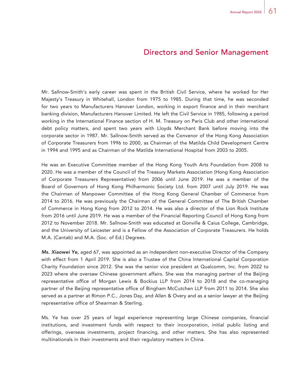 61Annual Report 2024 Directors and Senior Management Mr. Sallnow-Smith’s early career was spent in the British Civil Service, where he worked for Her Majesty’s Treasury in Whitehall, London from 1975 to 1985. During that time, he was seconded for two years to Manufacturers Hanover London, working in export finance and in their merchant banking division, Manufacturers Hanover Limited. He left the Civil Service in 1985, following a period working in the International Finance section of H. M. Treasury on Paris Club and other international debt policy matters, and spent two years with Lloyds Merchant Bank before moving into the corporate sector in 1987. Mr. Sallnow-Smith served as the Convenor of the Hong Kong Association of Corporate Treasurers from 1996 to 2000, as Chairman of the Matilda Child Development Centre in 1994 and 1995 and as Chairman of the Matilda International Hospital from 2003 to 2005. He was an Executive Committee member of the Hong Kong Youth Arts Foundation from 2008 to 2020. He was a member of the Council of the Treasury Markets Association (Hong Kong Association of Corporate Treasurers Representative) from 2006 until June 2019. He was a member of the Board of Governors of Hong Kong Philharmonic Society Ltd. from 2007 until July 2019. He was the Chairman of Manpower Committee of the Hong Kong General Chamber of Commerce from 2014 to 2016. He was previously the Chairman of the General Committee of The British Chamber of Commerce in Hong Kong from 2012 to 2014. He was also a director of the Lion Rock Institute from 2016 until June 2019. He was a member of the Financial Reporting Council of Hong Kong from 2012 to November 2018. Mr. Sallnow-Smith was educated at Gonville & Caius College, Cambridge, and the University of Leicester and is a Fellow of the Association of Corporate Treasurers. He holds M.A. (Cantab) and M.A. (Soc. of Ed.) Degrees. Ms. Xiaowei Ye, aged 67, was appointed as an independent non-executive Director of the Company with effect from 1 April 2019. She is also a Trustee of the China International Capital Corporation Charity Foundation since 2012. She was the senior vice president at Qualcomm, Inc. from 2022 to 2023 where she oversaw Chinese government affairs. She was the managing partner of the Beijing representative office of Morgan Lewis & Bockius LLP from 2014 to 2018 and the co-managing partner of the Beijing representative office of Bingham McCutchen LLP from 2011 to 2014. She also served as a partner at Rimon P.C., Jones Day, and Allen & Overy and as a senior lawyer at the Beijing representative office of Shearman & Sterling. Ms. Ye has over 25 years of legal experience representing large Chinese companies, financial institutions, and investment funds with respect to their incorporation, initial public listing and offerings, overseas investments, project financing, and other matters. She has also represented multinationals in their investments and their regulatory matters in China.