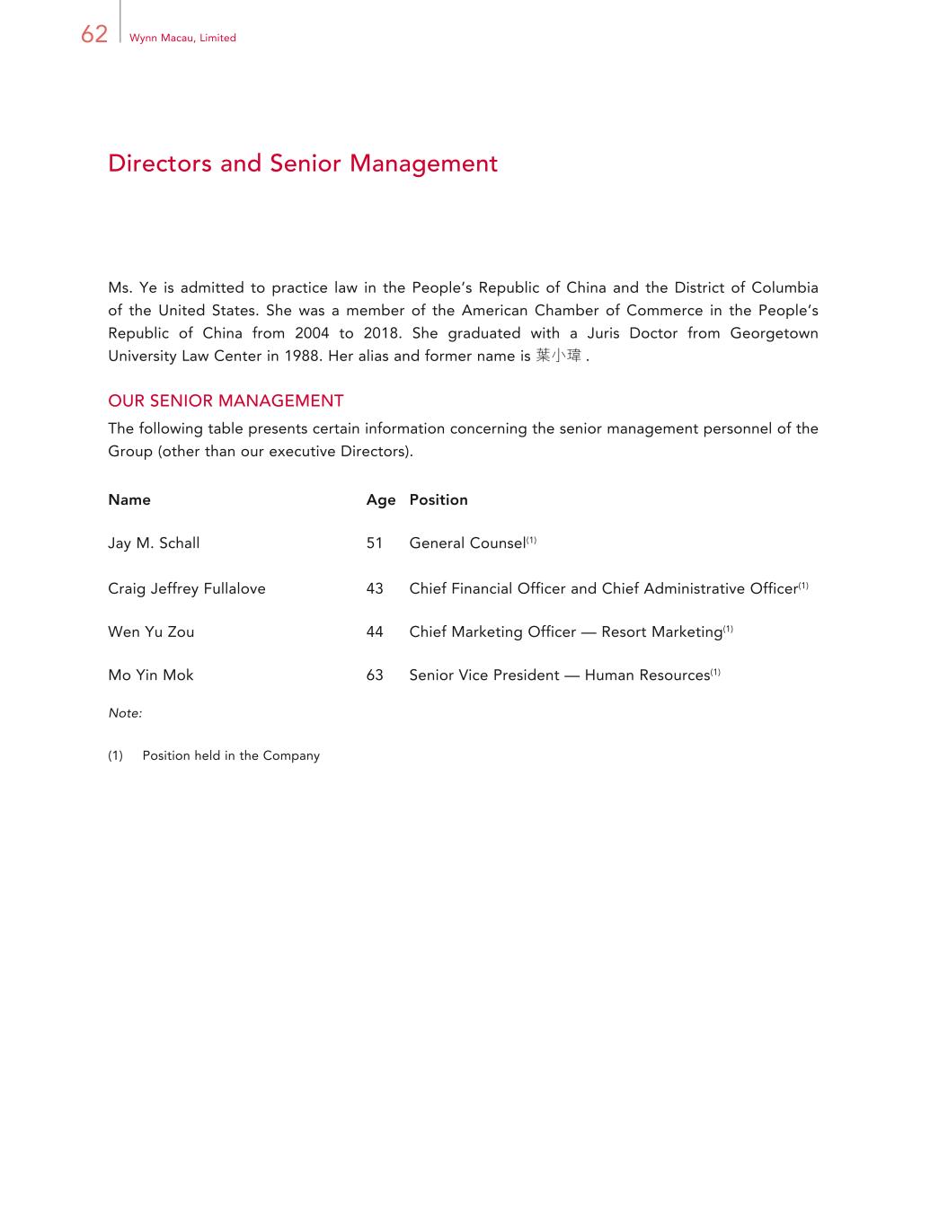 62 Wynn Macau, Limited Directors and Senior Management Ms. Ye is admitted to practice law in the People’s Republic of China and the District of Columbia of the United States. She was a member of the American Chamber of Commerce in the People’s Republic of China from 2004 to 2018. She graduated with a Juris Doctor from Georgetown University Law Center in 1988. Her alias and former name is 葉小瑋 . OUR SENIOR MANAGEMENT The following table presents certain information concerning the senior management personnel of the Group (other than our executive Directors). Name Age Position Jay M. Schall 51 General Counsel(1) Craig Jeffrey Fullalove 43 Chief Financial Officer and Chief Administrative Officer(1) Wen Yu Zou 44 Chief Marketing Officer — Resort Marketing(1) Mo Yin Mok 63 Senior Vice President — Human Resources(1) Note: (1) Position held in the Company