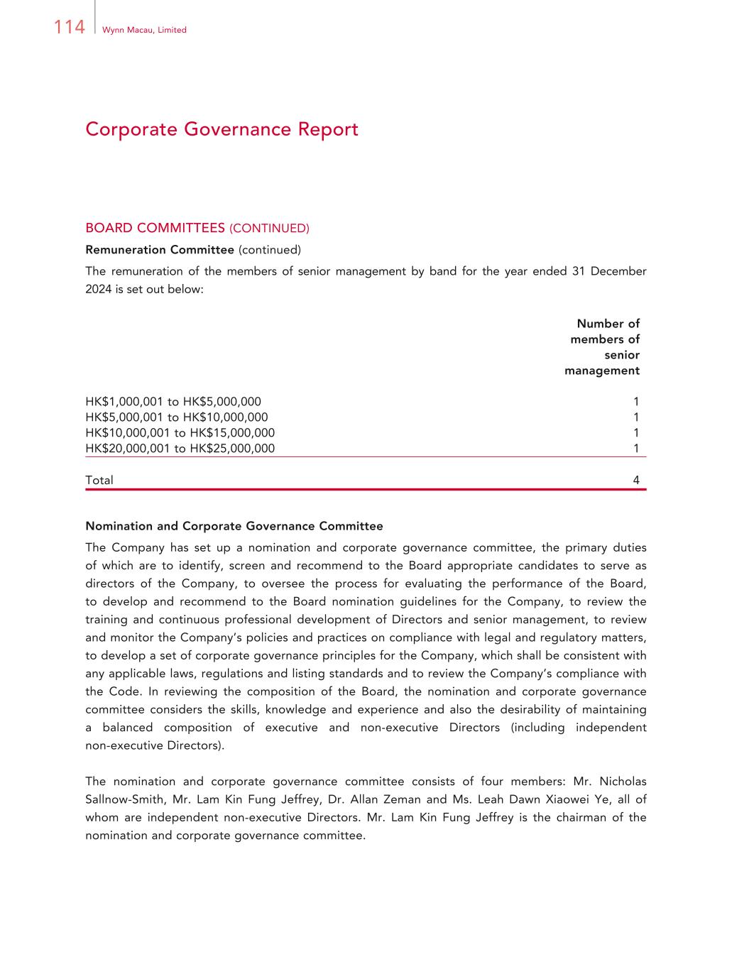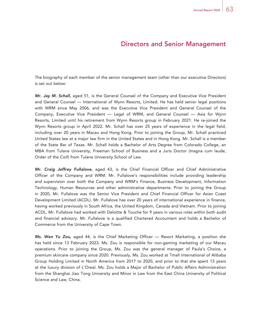 63Annual Report 2024 Directors and Senior Management The biography of each member of the senior management team (other than our executive Directors) is set out below: Mr. Jay M. Schall, aged 51, is the General Counsel of the Company and Executive Vice President and General Counsel — International of Wynn Resorts, Limited. He has held senior legal positions with WRM since May 2006, and was the Executive Vice President and General Counsel of the Company, Executive Vice President — Legal of WRM, and General Counsel — Asia for Wynn Resorts, Limited until his retirement from Wynn Resorts group in February 2021. He re-joined the Wynn Resorts group in April 2022. Mr. Schall has over 25 years of experience in the legal field, including over 20 years in Macau and Hong Kong. Prior to joining the Group, Mr. Schall practiced United States law at a major law firm in the United States and in Hong Kong. Mr. Schall is a member of the State Bar of Texas. Mr. Schall holds a Bachelor of Arts Degree from Colorado College, an MBA from Tulane University, Freeman School of Business and a Juris Doctor (magna cum laude, Order of the Coif) from Tulane University School of Law. Mr. Craig Jeffrey Fullalove, aged 43, is the Chief Financial Officer and Chief Administrative Officer of the Company and WRM. Mr. Fullalove’s responsibilities include providing leadership and supervision over both the Company and WRM’s Finance, Business Development, Information Technology, Human Resources and other administrative departments. Prior to joining the Group in 2020, Mr. Fullalove was the Senior Vice President and Chief Financial Officer for Asian Coast Development Limited (ACDL). Mr. Fullalove has over 20 years of international experience in finance, having worked previously in South Africa, the United Kingdom, Canada and Vietnam. Prior to joining ACDL, Mr. Fullalove had worked with Deloitte & Touche for 9 years in various roles within both audit and financial advisory. Mr. Fullalove is a qualified Chartered Accountant and holds a Bachelor of Commerce from the University of Cape Town. Ms. Wen Yu Zou, aged 44, is the Chief Marketing Officer — Resort Marketing, a position she has held since 13 February 2023. Ms. Zou is responsible for non-gaming marketing of our Macau operations. Prior to joining the Group, Ms. Zou was the general manager of Paula’s Choice, a premium skincare company since 2020. Previously, Ms. Zou worked at Tmall International of Alibaba Group Holding Limited in North America from 2017 to 2020, and prior to that she spent 13 years at the luxury division of L’Oreal. Ms. Zou holds a Major of Bachelor of Public Affairs Administration from the Shanghai Jiao Tong University and Minor in Law from the East China University of Political Science and Law, China.