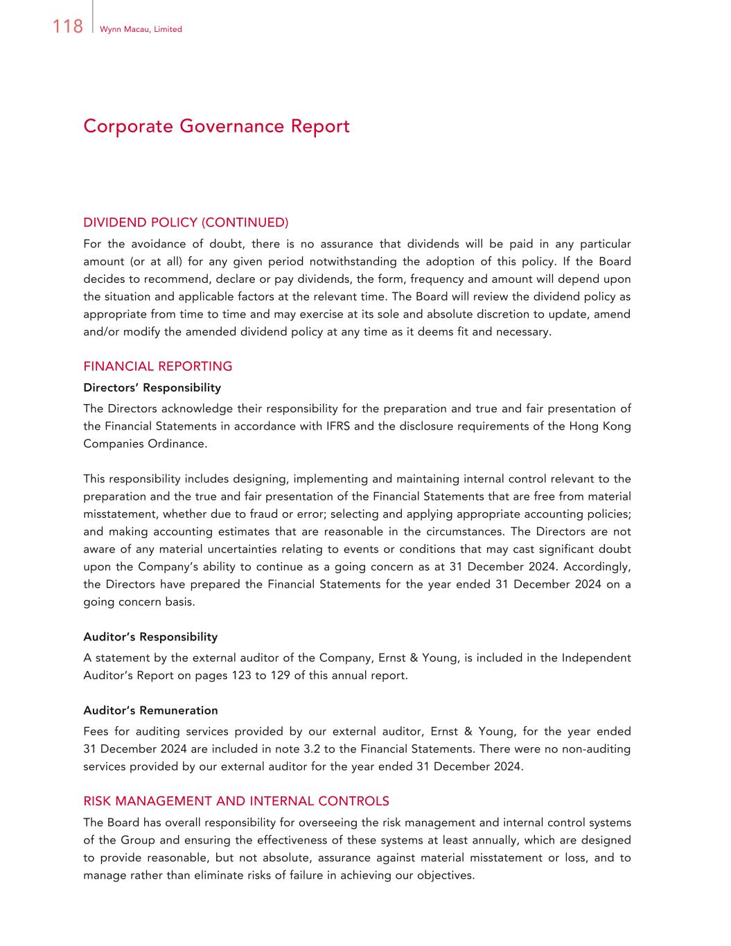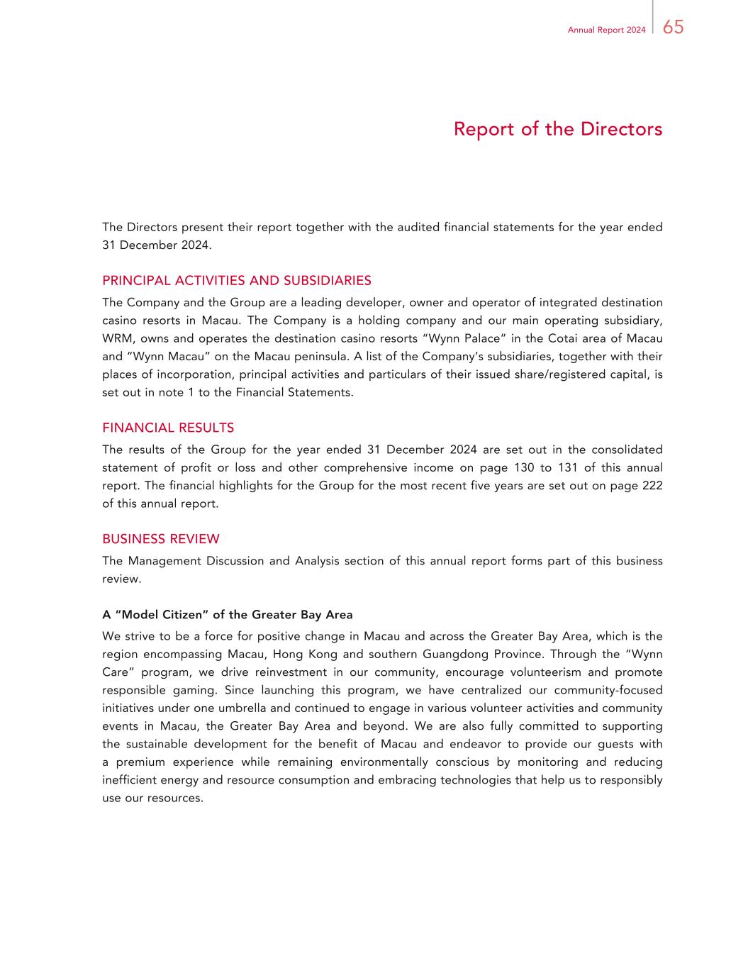 65Annual Report 2024 Report of the Directors The Directors present their report together with the audited financial statements for the year ended 31 December 2024. PRINCIPAL ACTIVITIES AND SUBSIDIARIES The Company and the Group are a leading developer, owner and operator of integrated destination casino resorts in Macau. The Company is a holding company and our main operating subsidiary, WRM, owns and operates the destination casino resorts “Wynn Palace” in the Cotai area of Macau and “Wynn Macau” on the Macau peninsula. A list of the Company’s subsidiaries, together with their places of incorporation, principal activities and particulars of their issued share/registered capital, is set out in note 1 to the Financial Statements. FINANCIAL RESULTS The results of the Group for the year ended 31 December 2024 are set out in the consolidated statement of profit or loss and other comprehensive income on page 130 to 131 of this annual report. The financial highlights for the Group for the most recent five years are set out on page 222 of this annual report. BUSINESS REVIEW The Management Discussion and Analysis section of this annual report forms part of this business review. A “Model Citizen” of the Greater Bay Area We strive to be a force for positive change in Macau and across the Greater Bay Area, which is the region encompassing Macau, Hong Kong and southern Guangdong Province. Through the “Wynn Care” program, we drive reinvestment in our community, encourage volunteerism and promote responsible gaming. Since launching this program, we have centralized our community-focused initiatives under one umbrella and continued to engage in various volunteer activities and community events in Macau, the Greater Bay Area and beyond. We are also fully committed to supporting the sustainable development for the benefit of Macau and endeavor to provide our guests with a premium experience while remaining environmentally conscious by monitoring and reducing inefficient energy and resource consumption and embracing technologies that help us to responsibly use our resources.