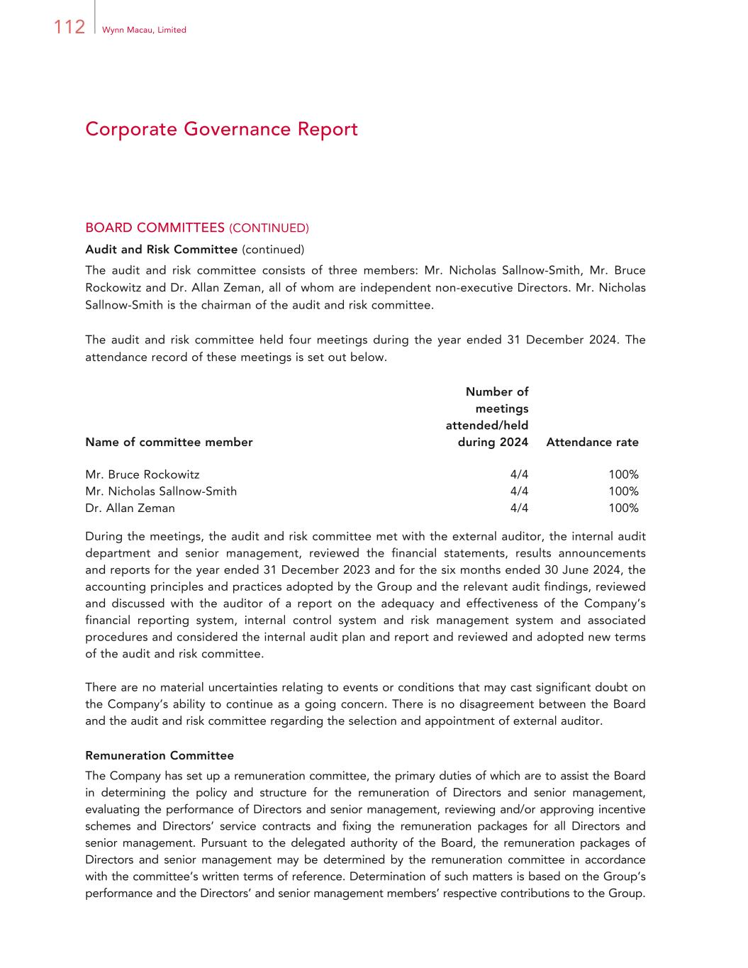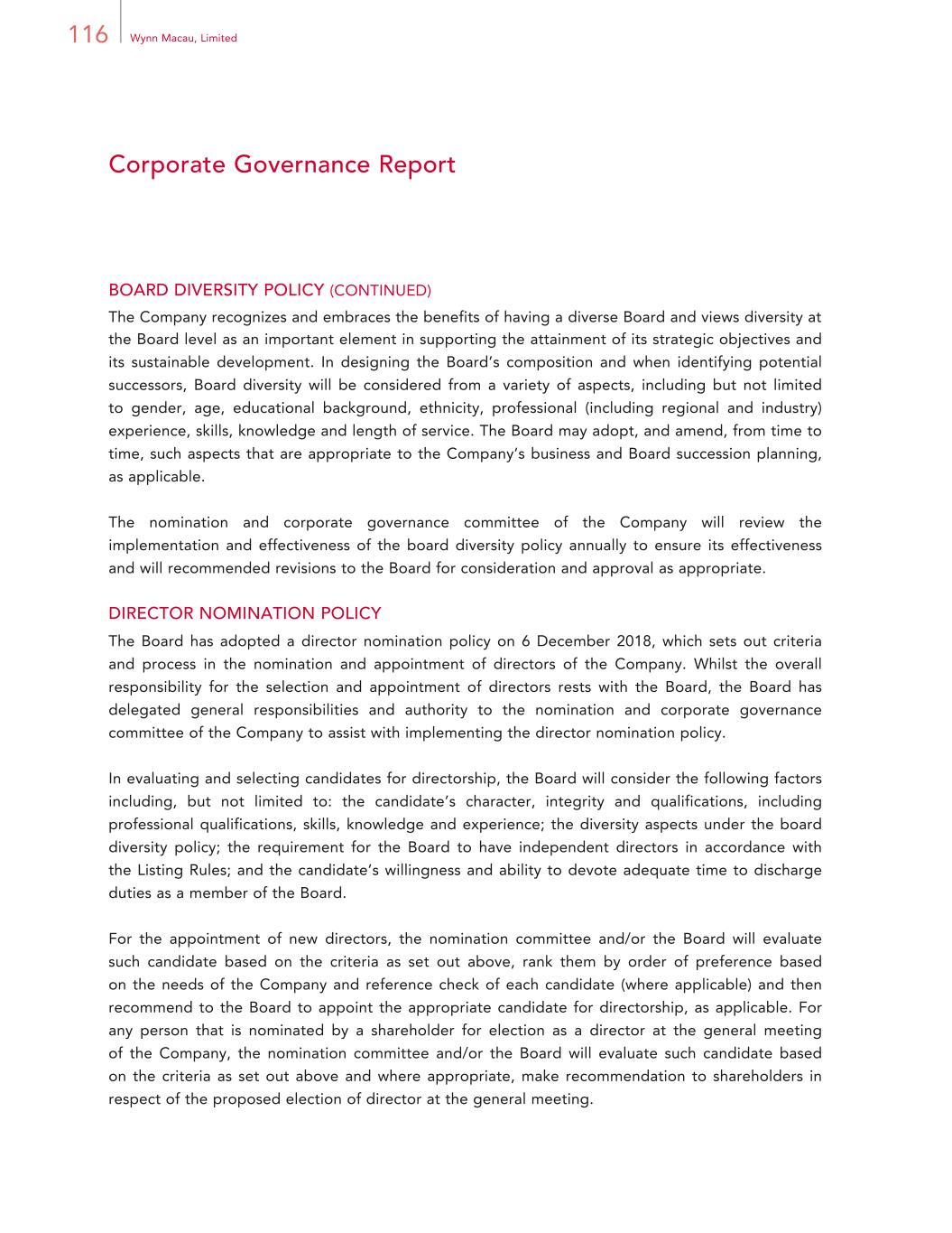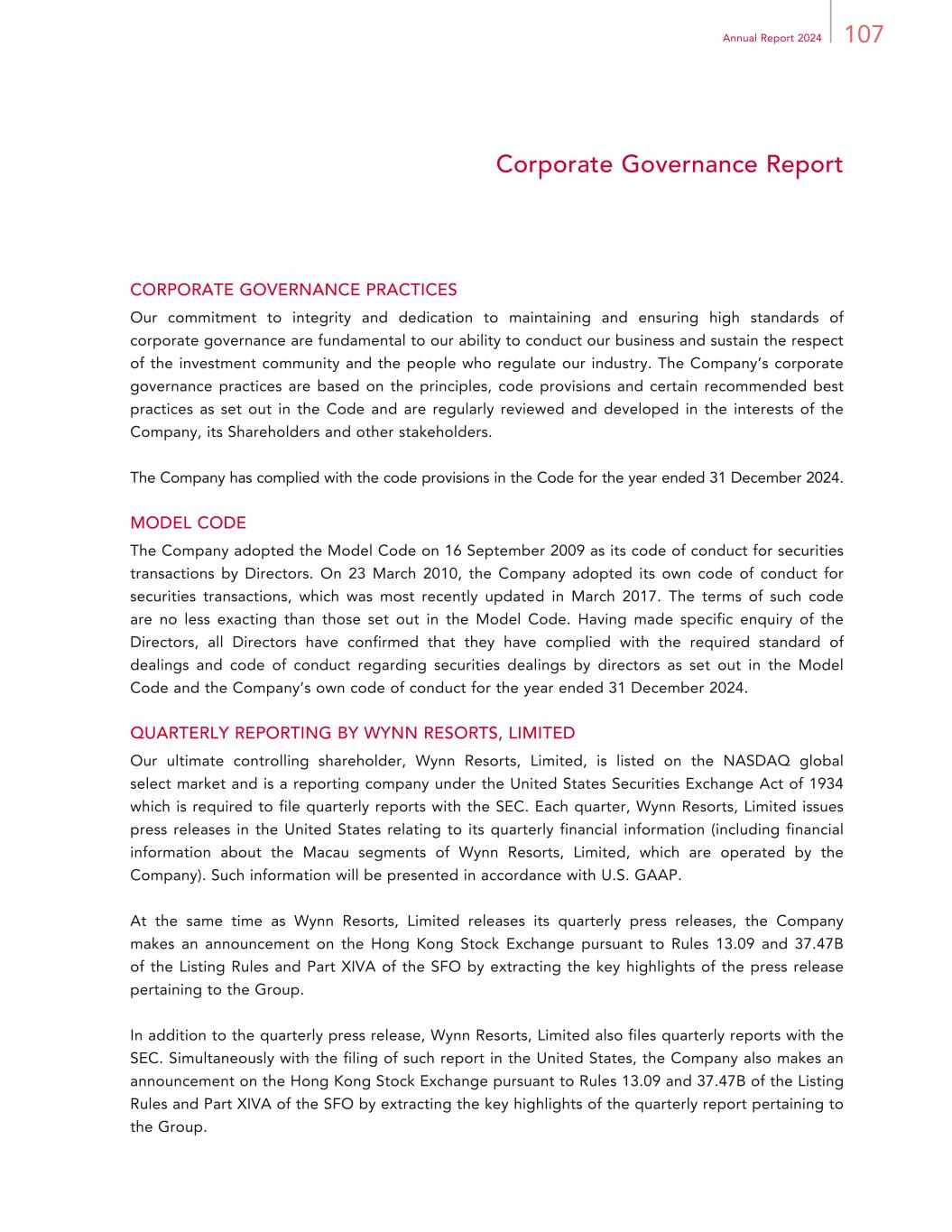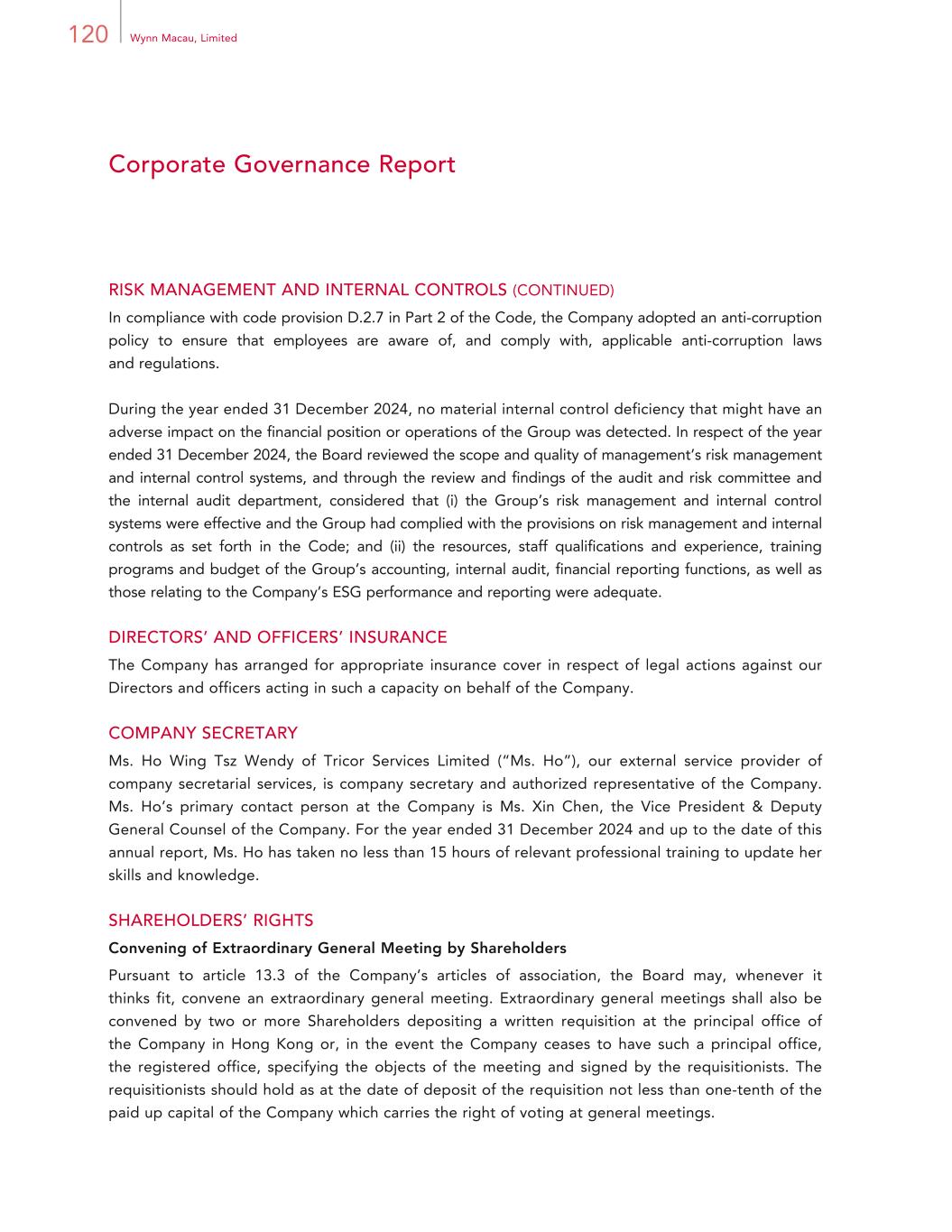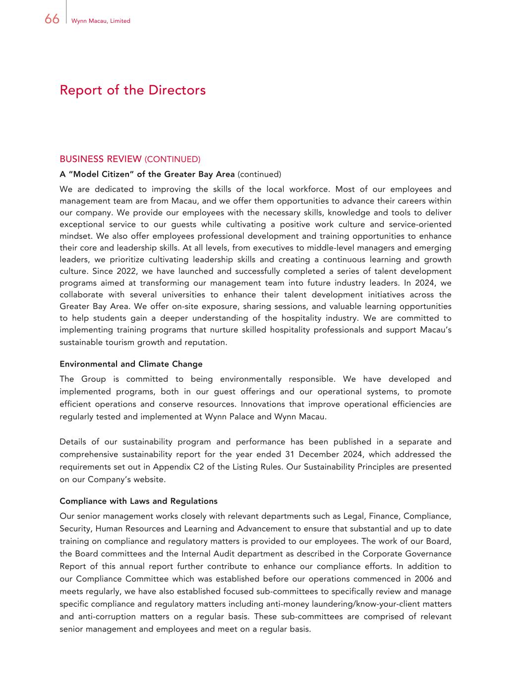 66 Wynn Macau, Limited Report of the Directors BUSINESS REVIEW (CONTINUED) A “Model Citizen” of the Greater Bay Area (continued) We are dedicated to improving the skills of the local workforce. Most of our employees and management team are from Macau, and we offer them opportunities to advance their careers within our company. We provide our employees with the necessary skills, knowledge and tools to deliver exceptional service to our guests while cultivating a positive work culture and service-oriented mindset. We also offer employees professional development and training opportunities to enhance their core and leadership skills. At all levels, from executives to middle-level managers and emerging leaders, we prioritize cultivating leadership skills and creating a continuous learning and growth culture. Since 2022, we have launched and successfully completed a series of talent development programs aimed at transforming our management team into future industry leaders. In 2024, we collaborate with several universities to enhance their talent development initiatives across the Greater Bay Area. We offer on-site exposure, sharing sessions, and valuable learning opportunities to help students gain a deeper understanding of the hospitality industry. We are committed to implementing training programs that nurture skilled hospitality professionals and support Macau’s sustainable tourism growth and reputation. Environmental and Climate Change The Group is committed to being environmentally responsible. We have developed and implemented programs, both in our guest offerings and our operational systems, to promote efficient operations and conserve resources. Innovations that improve operational efficiencies are regularly tested and implemented at Wynn Palace and Wynn Macau. Details of our sustainability program and performance has been published in a separate and comprehensive sustainability report for the year ended 31 December 2024, which addressed the requirements set out in Appendix C2 of the Listing Rules. Our Sustainability Principles are presented on our Company’s website. Compliance with Laws and Regulations Our senior management works closely with relevant departments such as Legal, Finance, Compliance, Security, Human Resources and Learning and Advancement to ensure that substantial and up to date training on compliance and regulatory matters is provided to our employees. The work of our Board, the Board committees and the Internal Audit department as described in the Corporate Governance Report of this annual report further contribute to enhance our compliance efforts. In addition to our Compliance Committee which was established before our operations commenced in 2006 and meets regularly, we have also established focused sub-committees to specifically review and manage specific compliance and regulatory matters including anti-money laundering/know-your-client matters and anti-corruption matters on a regular basis. These sub-committees are comprised of relevant senior management and employees and meet on a regular basis.