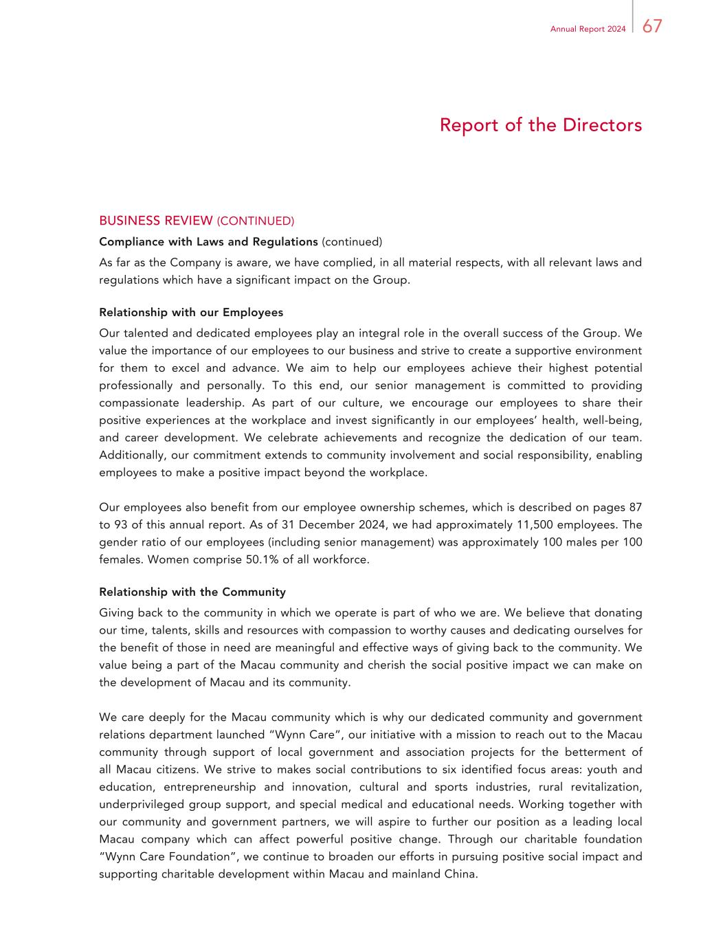 67Annual Report 2024 Report of the Directors BUSINESS REVIEW (CONTINUED) Compliance with Laws and Regulations (continued) As far as the Company is aware, we have complied, in all material respects, with all relevant laws and regulations which have a significant impact on the Group. Relationship with our Employees Our talented and dedicated employees play an integral role in the overall success of the Group. We value the importance of our employees to our business and strive to create a supportive environment for them to excel and advance. We aim to help our employees achieve their highest potential professionally and personally. To this end, our senior management is committed to providing compassionate leadership. As part of our culture, we encourage our employees to share their positive experiences at the workplace and invest significantly in our employees’ health, well-being, and career development. We celebrate achievements and recognize the dedication of our team. Additionally, our commitment extends to community involvement and social responsibility, enabling employees to make a positive impact beyond the workplace. Our employees also benefit from our employee ownership schemes, which is described on pages 87 to 93 of this annual report. As of 31 December 2024, we had approximately 11,500 employees. The gender ratio of our employees (including senior management) was approximately 100 males per 100 females. Women comprise 50.1% of all workforce. Relationship with the Community Giving back to the community in which we operate is part of who we are. We believe that donating our time, talents, skills and resources with compassion to worthy causes and dedicating ourselves for the benefit of those in need are meaningful and effective ways of giving back to the community. We value being a part of the Macau community and cherish the social positive impact we can make on the development of Macau and its community. We care deeply for the Macau community which is why our dedicated community and government relations department launched “Wynn Care”, our initiative with a mission to reach out to the Macau community through support of local government and association projects for the betterment of all Macau citizens. We strive to makes social contributions to six identified focus areas: youth and education, entrepreneurship and innovation, cultural and sports industries, rural revitalization, underprivileged group support, and special medical and educational needs. Working together with our community and government partners, we will aspire to further our position as a leading local Macau company which can affect powerful positive change. Through our charitable foundation “Wynn Care Foundation”, we continue to broaden our efforts in pursuing positive social impact and supporting charitable development within Macau and mainland China.