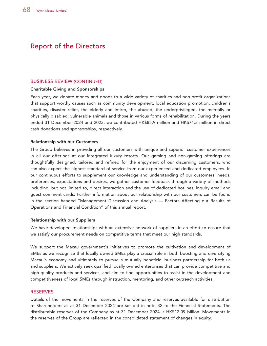68 Wynn Macau, Limited Report of the Directors BUSINESS REVIEW (CONTINUED) Charitable Giving and Sponsorships Each year, we donate money and goods to a wide variety of charities and non-profit organizations that support worthy causes such as community development, local education promotion, children’s charities, disaster relief, the elderly and infirm, the abused, the underprivileged, the mentally or physically disabled, vulnerable animals and those in various forms of rehabilitation. During the years ended 31 December 2024 and 2023, we contributed HK$85.9 million and HK$74.3 million in direct cash donations and sponsorships, respectively. Relationship with our Customers The Group believes in providing all our customers with unique and superior customer experiences in all our offerings at our integrated luxury resorts. Our gaming and non-gaming offerings are thoughtfully designed, tailored and refined for the enjoyment of our discerning customers, who can also expect the highest standard of service from our experienced and dedicated employees. In our continuous efforts to supplement our knowledge and understanding of our customers’ needs, preferences, expectations and desires, we gather customer feedback through a variety of methods including, but not limited to, direct interaction and the use of dedicated hotlines, inquiry email and guest comment cards. Further information about our relationship with our customers can be found in the section headed “Management Discussion and Analysis — Factors Affecting our Results of Operations and Financial Condition” of this annual report. Relationship with our Suppliers We have developed relationships with an extensive network of suppliers in an effort to ensure that we satisfy our procurement needs on competitive terms that meet our high standards. We support the Macau government’s initiatives to promote the cultivation and development of SMEs as we recognize that locally owned SMEs play a crucial role in both boosting and diversifying Macau’s economy and ultimately to pursue a mutually beneficial business partnership for both us and suppliers. We actively seek qualified locally owned enterprises that can provide competitive and high-quality products and services, and aim to find opportunities to assist in the development and competitiveness of local SMEs through instruction, mentoring, and other outreach activities. RESERVES Details of the movements in the reserves of the Company and reserves available for distribution to Shareholders as at 31 December 2024 are set out in note 32 to the Financial Statements. The distributable reserves of the Company as at 31 December 2024 is HK$12.09 billion. Movements in the reserves of the Group are reflected in the consolidated statement of changes in equity.
