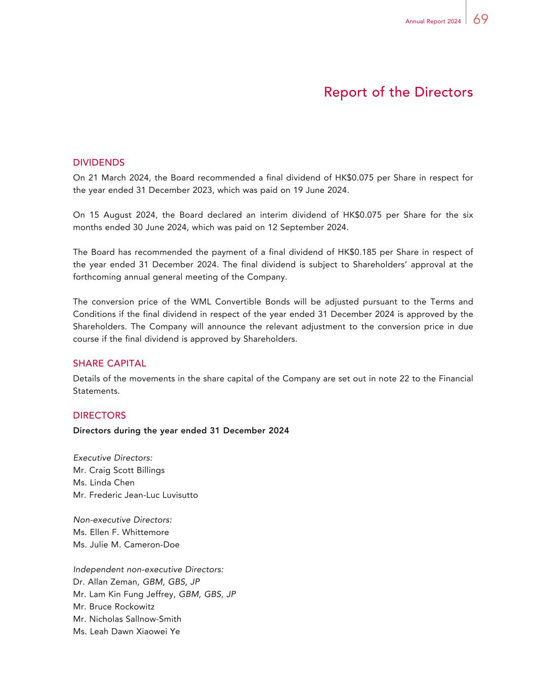 69Annual Report 2024 Report of the Directors DIVIDENDS On 21 March 2024, the Board recommended a final dividend of HK$0.075 per Share in respect for the year ended 31 December 2023, which was paid on 19 June 2024. On 15 August 2024, the Board declared an interim dividend of HK$0.075 per Share for the six months ended 30 June 2024, which was paid on 12 September 2024. The Board has recommended the payment of a final dividend of HK$0.185 per Share in respect of the year ended 31 December 2024. The final dividend is subject to Shareholders’ approval at the forthcoming annual general meeting of the Company. The conversion price of the WML Convertible Bonds will be adjusted pursuant to the Terms and Conditions if the final dividend in respect of the year ended 31 December 2024 is approved by the Shareholders. The Company will announce the relevant adjustment to the conversion price in due course if the final dividend is approved by Shareholders. SHARE CAPITAL Details of the movements in the share capital of the Company are set out in note 22 to the Financial Statements. DIRECTORS Directors during the year ended 31 December 2024 Executive Directors: Mr. Craig Scott Billings Ms. Linda Chen Mr. Frederic Jean-Luc Luvisutto Non-executive Directors: Ms. Ellen F. Whittemore Ms. Julie M. Cameron-Doe Independent non-executive Directors: Dr. Allan Zeman, GBM, GBS, JP Mr. Lam Kin Fung Jeffrey, GBM, GBS, JP Mr. Bruce Rockowitz Mr. Nicholas Sallnow-Smith Ms. Leah Dawn Xiaowei Ye