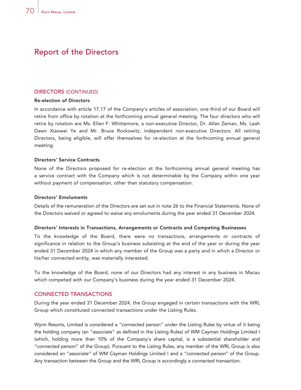 70 Wynn Macau, Limited Report of the Directors DIRECTORS (CONTINUED) Re-election of Directors In accordance with article 17.17 of the Company’s articles of association, one third of our Board will retire from office by rotation at the forthcoming annual general meeting. The four directors who will retire by rotation are Ms. Ellen F. Whittemore, a non-executive Director, Dr. Allan Zeman, Ms. Leah Dawn Xiaowei Ye and Mr. Bruce Rockowitz, independent non-executive Directors. All retiring Directors, being eligible, will offer themselves for re-election at the forthcoming annual general meeting. Directors’ Service Contracts None of the Directors proposed for re-election at the forthcoming annual general meeting has a service contract with the Company which is not determinable by the Company within one year without payment of compensation, other than statutory compensation. Directors’ Emoluments Details of the remuneration of the Directors are set out in note 26 to the Financial Statements. None of the Directors waived or agreed to waive any emoluments during the year ended 31 December 2024. Directors’ Interests in Transactions, Arrangements or Contracts and Competing Businesses To the knowledge of the Board, there were no transactions, arrangements or contracts of significance in relation to the Group’s business subsisting at the end of the year or during the year ended 31 December 2024 in which any member of the Group was a party and in which a Director or his/her connected entity, was materially interested. To the knowledge of the Board, none of our Directors had any interest in any business in Macau which competed with our Company’s business during the year ended 31 December 2024. CONNECTED TRANSACTIONS During the year ended 31 December 2024, the Group engaged in certain transactions with the WRL Group which constituted connected transactions under the Listing Rules. Wynn Resorts, Limited is considered a “connected person” under the Listing Rules by virtue of it being the holding company (an “associate” as defined in the Listing Rules) of WM Cayman Holdings Limited I (which, holding more than 10% of the Company’s share capital, is a substantial shareholder and “connected person” of the Group). Pursuant to the Listing Rules, any member of the WRL Group is also considered an “associate” of WM Cayman Holdings Limited I and a “connected person” of the Group. Any transaction between the Group and the WRL Group is accordingly a connected transaction.