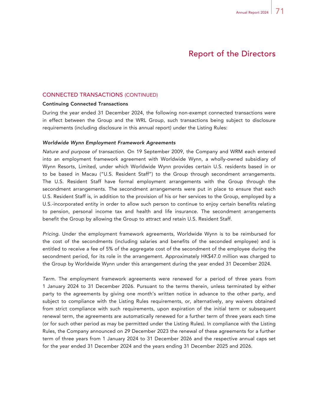 71Annual Report 2024 Report of the Directors CONNECTED TRANSACTIONS (CONTINUED) Continuing Connected Transactions During the year ended 31 December 2024, the following non-exempt connected transactions were in effect between the Group and the WRL Group, such transactions being subject to disclosure requirements (including disclosure in this annual report) under the Listing Rules: Worldwide Wynn Employment Framework Agreements Nature and purpose of transaction. On 19 September 2009, the Company and WRM each entered into an employment framework agreement with Worldwide Wynn, a wholly-owned subsidiary of Wynn Resorts, Limited, under which Worldwide Wynn provides certain U.S. residents based in or to be based in Macau (“U.S. Resident Staff”) to the Group through secondment arrangements. The U.S. Resident Staff have formal employment arrangements with the Group through the secondment arrangements. The secondment arrangements were put in place to ensure that each U.S. Resident Staff is, in addition to the provision of his or her services to the Group, employed by a U.S.-incorporated entity in order to allow such person to continue to enjoy certain benefits relating to pension, personal income tax and health and life insurance. The secondment arrangements benefit the Group by allowing the Group to attract and retain U.S. Resident Staff. Pricing. Under the employment framework agreements, Worldwide Wynn is to be reimbursed for the cost of the secondments (including salaries and benefits of the seconded employee) and is entitled to receive a fee of 5% of the aggregate cost of the secondment of the employee during the secondment period, for its role in the arrangement. Approximately HK$47.0 million was charged to the Group by Worldwide Wynn under this arrangement during the year ended 31 December 2024. Term. The employment framework agreements were renewed for a period of three years from 1 January 2024 to 31 December 2026. Pursuant to the terms therein, unless terminated by either party to the agreements by giving one month’s written notice in advance to the other party, and subject to compliance with the Listing Rules requirements, or, alternatively, any waivers obtained from strict compliance with such requirements, upon expiration of the initial term or subsequent renewal term, the agreements are automatically renewed for a further term of three years each time (or for such other period as may be permitted under the Listing Rules). In compliance with the Listing Rules, the Company announced on 29 December 2023 the renewal of these agreements for a further term of three years from 1 January 2024 to 31 December 2026 and the respective annual caps set for the year ended 31 December 2024 and the years ending 31 December 2025 and 2026.