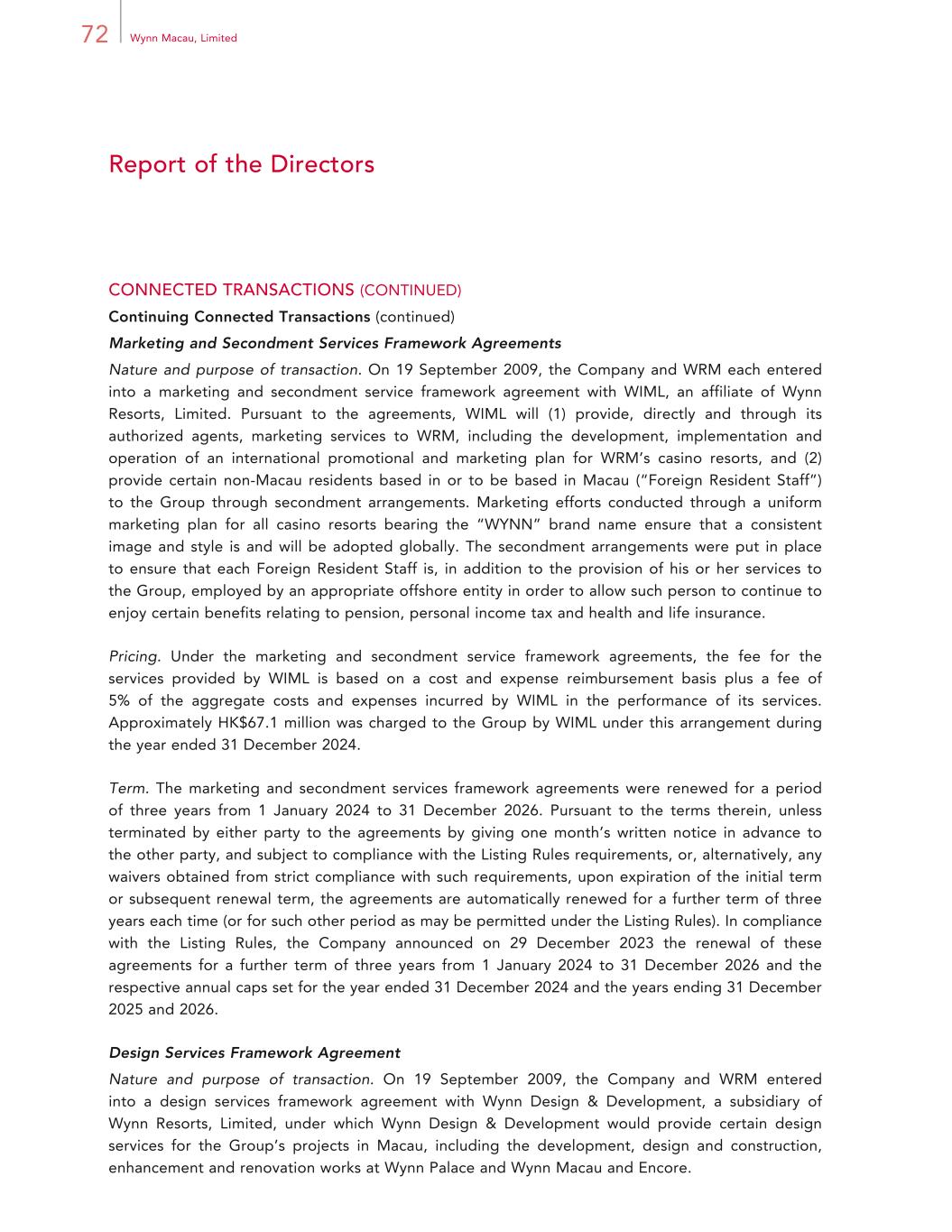 72 Wynn Macau, Limited Report of the Directors CONNECTED TRANSACTIONS (CONTINUED) Continuing Connected Transactions (continued) Marketing and Secondment Services Framework Agreements Nature and purpose of transaction. On 19 September 2009, the Company and WRM each entered into a marketing and secondment service framework agreement with WIML, an affiliate of Wynn Resorts, Limited. Pursuant to the agreements, WIML will (1) provide, directly and through its authorized agents, marketing services to WRM, including the development, implementation and operation of an international promotional and marketing plan for WRM’s casino resorts, and (2) provide certain non-Macau residents based in or to be based in Macau (“Foreign Resident Staff”) to the Group through secondment arrangements. Marketing efforts conducted through a uniform marketing plan for all casino resorts bearing the “WYNN” brand name ensure that a consistent image and style is and will be adopted globally. The secondment arrangements were put in place to ensure that each Foreign Resident Staff is, in addition to the provision of his or her services to the Group, employed by an appropriate offshore entity in order to allow such person to continue to enjoy certain benefits relating to pension, personal income tax and health and life insurance. Pricing. Under the marketing and secondment service framework agreements, the fee for the services provided by WIML is based on a cost and expense reimbursement basis plus a fee of 5% of the aggregate costs and expenses incurred by WIML in the performance of its services. Approximately HK$67.1 million was charged to the Group by WIML under this arrangement during the year ended 31 December 2024. Term. The marketing and secondment services framework agreements were renewed for a period of three years from 1 January 2024 to 31 December 2026. Pursuant to the terms therein, unless terminated by either party to the agreements by giving one month’s written notice in advance to the other party, and subject to compliance with the Listing Rules requirements, or, alternatively, any waivers obtained from strict compliance with such requirements, upon expiration of the initial term or subsequent renewal term, the agreements are automatically renewed for a further term of three years each time (or for such other period as may be permitted under the Listing Rules). In compliance with the Listing Rules, the Company announced on 29 December 2023 the renewal of these agreements for a further term of three years from 1 January 2024 to 31 December 2026 and the respective annual caps set for the year ended 31 December 2024 and the years ending 31 December 2025 and 2026. Design Services Framework Agreement Nature and purpose of transaction. On 19 September 2009, the Company and WRM entered into a design services framework agreement with Wynn Design & Development, a subsidiary of Wynn Resorts, Limited, under which Wynn Design & Development would provide certain design services for the Group’s projects in Macau, including the development, design and construction, enhancement and renovation works at Wynn Palace and Wynn Macau and Encore.