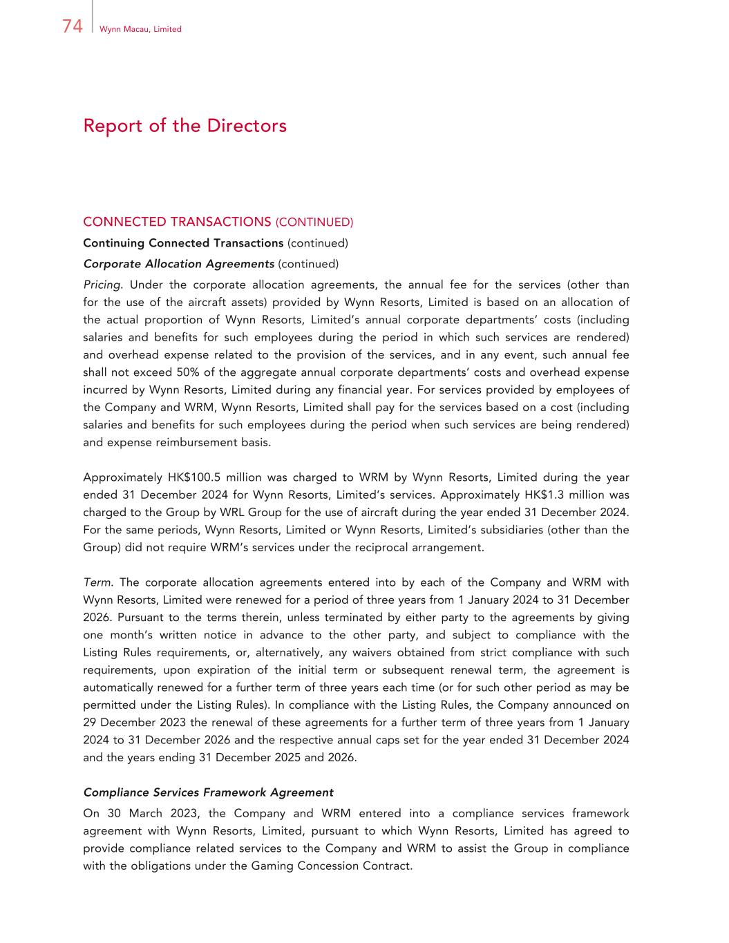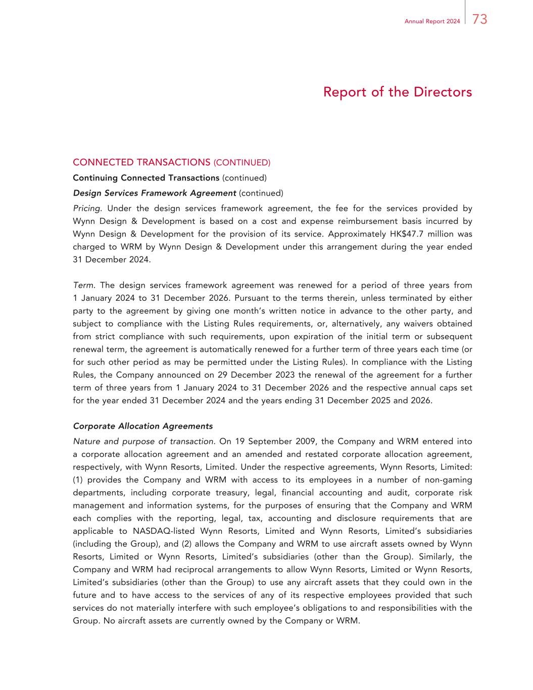 73Annual Report 2024 Report of the Directors CONNECTED TRANSACTIONS (CONTINUED) Continuing Connected Transactions (continued) Design Services Framework Agreement (continued) Pricing. Under the design services framework agreement, the fee for the services provided by Wynn Design & Development is based on a cost and expense reimbursement basis incurred by Wynn Design & Development for the provision of its service. Approximately HK$47.7 million was charged to WRM by Wynn Design & Development under this arrangement during the year ended 31 December 2024. Term. The design services framework agreement was renewed for a period of three years from 1 January 2024 to 31 December 2026. Pursuant to the terms therein, unless terminated by either party to the agreement by giving one month’s written notice in advance to the other party, and subject to compliance with the Listing Rules requirements, or, alternatively, any waivers obtained from strict compliance with such requirements, upon expiration of the initial term or subsequent renewal term, the agreement is automatically renewed for a further term of three years each time (or for such other period as may be permitted under the Listing Rules). In compliance with the Listing Rules, the Company announced on 29 December 2023 the renewal of the agreement for a further term of three years from 1 January 2024 to 31 December 2026 and the respective annual caps set for the year ended 31 December 2024 and the years ending 31 December 2025 and 2026. Corporate Allocation Agreements Nature and purpose of transaction. On 19 September 2009, the Company and WRM entered into a corporate allocation agreement and an amended and restated corporate allocation agreement, respectively, with Wynn Resorts, Limited. Under the respective agreements, Wynn Resorts, Limited: (1) provides the Company and WRM with access to its employees in a number of non-gaming departments, including corporate treasury, legal, financial accounting and audit, corporate risk management and information systems, for the purposes of ensuring that the Company and WRM each complies with the reporting, legal, tax, accounting and disclosure requirements that are applicable to NASDAQ-listed Wynn Resorts, Limited and Wynn Resorts, Limited’s subsidiaries (including the Group), and (2) allows the Company and WRM to use aircraft assets owned by Wynn Resorts, Limited or Wynn Resorts, Limited’s subsidiaries (other than the Group). Similarly, the Company and WRM had reciprocal arrangements to allow Wynn Resorts, Limited or Wynn Resorts, Limited’s subsidiaries (other than the Group) to use any aircraft assets that they could own in the future and to have access to the services of any of its respective employees provided that such services do not materially interfere with such employee’s obligations to and responsibilities with the Group. No aircraft assets are currently owned by the Company or WRM.