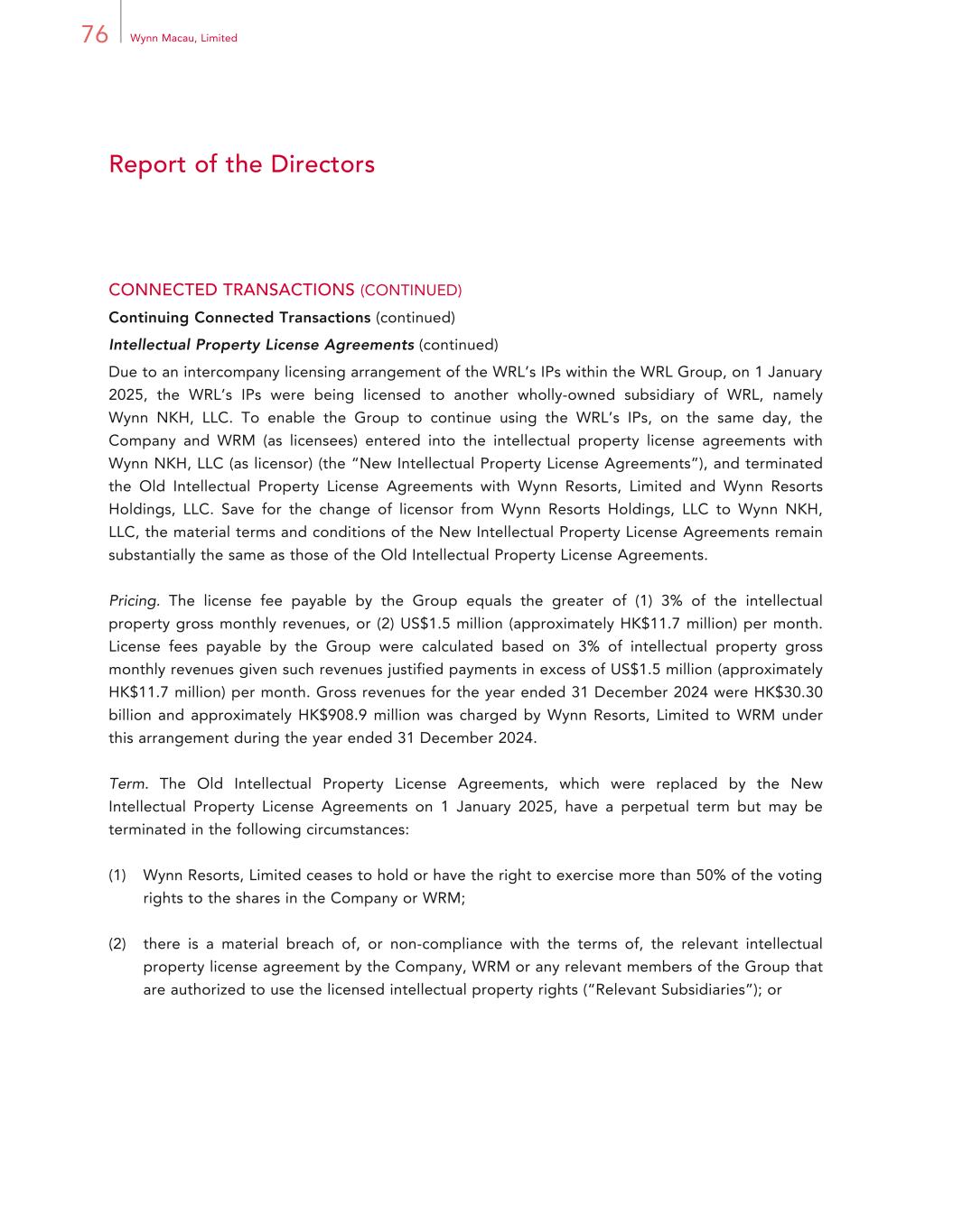 76 Wynn Macau, Limited Report of the Directors CONNECTED TRANSACTIONS (CONTINUED) Continuing Connected Transactions (continued) Intellectual Property License Agreements (continued) Due to an intercompany licensing arrangement of the WRL’s IPs within the WRL Group, on 1 January 2025, the WRL’s IPs were being licensed to another wholly-owned subsidiary of WRL, namely Wynn NKH, LLC. To enable the Group to continue using the WRL’s IPs, on the same day, the Company and WRM (as licensees) entered into the intellectual property license agreements with Wynn NKH, LLC (as licensor) (the “New Intellectual Property License Agreements”), and terminated the Old Intellectual Property License Agreements with Wynn Resorts, Limited and Wynn Resorts Holdings, LLC. Save for the change of licensor from Wynn Resorts Holdings, LLC to Wynn NKH, LLC, the material terms and conditions of the New Intellectual Property License Agreements remain substantially the same as those of the Old Intellectual Property License Agreements. Pricing. The license fee payable by the Group equals the greater of (1) 3% of the intellectual property gross monthly revenues, or (2) US$1.5 million (approximately HK$11.7 million) per month. License fees payable by the Group were calculated based on 3% of intellectual property gross monthly revenues given such revenues justified payments in excess of US$1.5 million (approximately HK$11.7 million) per month. Gross revenues for the year ended 31 December 2024 were HK$30.30 billion and approximately HK$908.9 million was charged by Wynn Resorts, Limited to WRM under this arrangement during the year ended 31 December 2024. Term. The Old Intellectual Property License Agreements, which were replaced by the New Intellectual Property License Agreements on 1 January 2025, have a perpetual term but may be terminated in the following circumstances: (1) Wynn Resorts, Limited ceases to hold or have the right to exercise more than 50% of the voting rights to the shares in the Company or WRM; (2) there is a material breach of, or non-compliance with the terms of, the relevant intellectual property license agreement by the Company, WRM or any relevant members of the Group that are authorized to use the licensed intellectual property rights (“Relevant Subsidiaries”); or