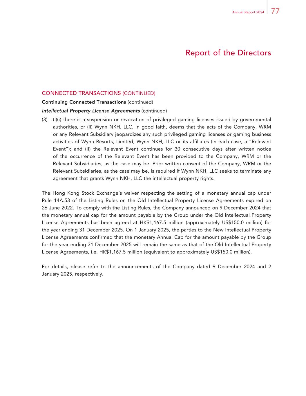 77Annual Report 2024 Report of the Directors CONNECTED TRANSACTIONS (CONTINUED) Continuing Connected Transactions (continued) Intellectual Property License Agreements (continued) (3) (I)(i) there is a suspension or revocation of privileged gaming licenses issued by governmental authorities, or (ii) Wynn NKH, LLC, in good faith, deems that the acts of the Company, WRM or any Relevant Subsidiary jeopardizes any such privileged gaming licenses or gaming business activities of Wynn Resorts, Limited, Wynn NKH, LLC or its affiliates (in each case, a “Relevant Event”); and (II) the Relevant Event continues for 30 consecutive days after written notice of the occurrence of the Relevant Event has been provided to the Company, WRM or the Relevant Subsidiaries, as the case may be. Prior written consent of the Company, WRM or the Relevant Subsidiaries, as the case may be, is required if Wynn NKH, LLC seeks to terminate any agreement that grants Wynn NKH, LLC the intellectual property rights. The Hong Kong Stock Exchange’s waiver respecting the setting of a monetary annual cap under Rule 14A.53 of the Listing Rules on the Old Intellectual Property License Agreements expired on 26 June 2022. To comply with the Listing Rules, the Company announced on 9 December 2024 that the monetary annual cap for the amount payable by the Group under the Old Intellectual Property License Agreements has been agreed at HK$1,167.5 million (approximately US$150.0 million) for the year ending 31 December 2025. On 1 January 2025, the parties to the New Intellectual Property License Agreements confirmed that the monetary Annual Cap for the amount payable by the Group for the year ending 31 December 2025 will remain the same as that of the Old Intellectual Property License Agreements, i.e. HK$1,167.5 million (equivalent to approximately US$150.0 million). For details, please refer to the announcements of the Company dated 9 December 2024 and 2 January 2025, respectively.