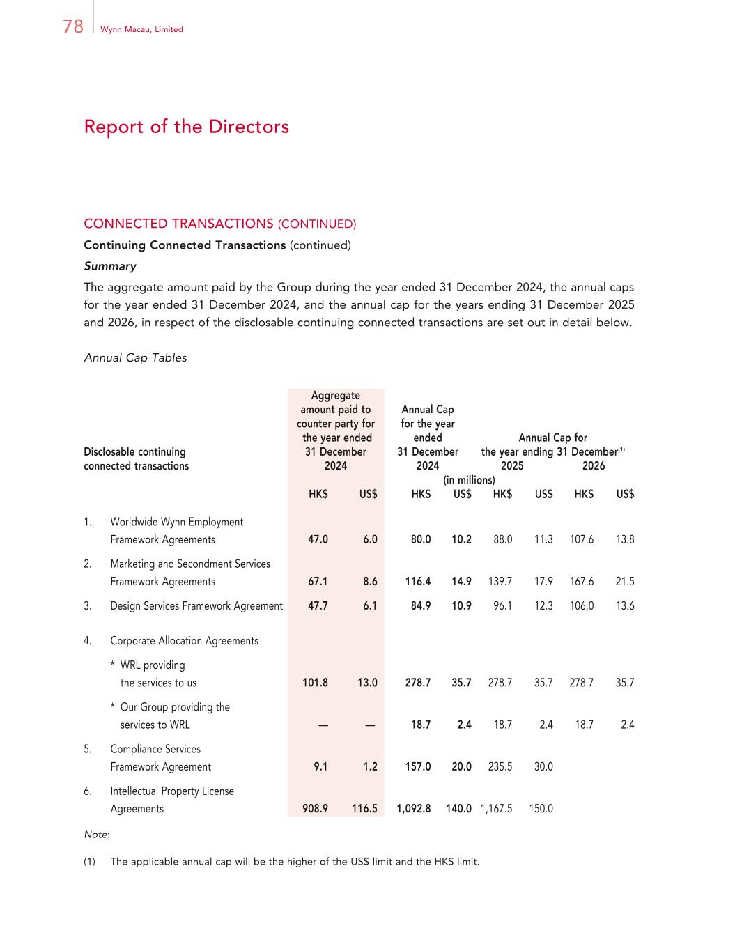 78 Wynn Macau, Limited Report of the Directors CONNECTED TRANSACTIONS (CONTINUED) Continuing Connected Transactions (continued) Summary The aggregate amount paid by the Group during the year ended 31 December 2024, the annual caps for the year ended 31 December 2024, and the annual cap for the years ending 31 December 2025 and 2026, in respect of the disclosable continuing connected transactions are set out in detail below. Annual Cap Tables Disclosable continuing connected transactions Aggregate amount paid to counter party for the year ended 31 December Annual Cap for the year ended 31 December Annual Cap for the year ending 31 December(1) 2024 2024 2025 2026 (in millions) HK$ US$ HK$ US$ HK$ US$ HK$ US$ 1. Worldwide Wynn Employment Framework Agreements 47.0 6.0 80.0 10.2 88.0 11.3 107.6 13.8 2. Marketing and Secondment Services Framework Agreements 67.1 8.6 116.4 14.9 139.7 17.9 167.6 21.5 3. Design Services Framework Agreement 47.7 6.1 84.9 10.9 96.1 12.3 106.0 13.6 4. Corporate Allocation Agreements * WRL providing the services to us 101.8 13.0 278.7 35.7 278.7 35.7 278.7 35.7 * Our Group providing the services to WRL — — 18.7 2.4 18.7 2.4 18.7 2.4 5. Compliance Services Framework Agreement 9.1 1.2 157.0 20.0 235.5 30.0 6. Intellectual Property License Agreements 908.9 116.5 1,092.8 140.0 1,167.5 150.0 Note: (1) The applicable annual cap will be the higher of the US$ limit and the HK$ limit.