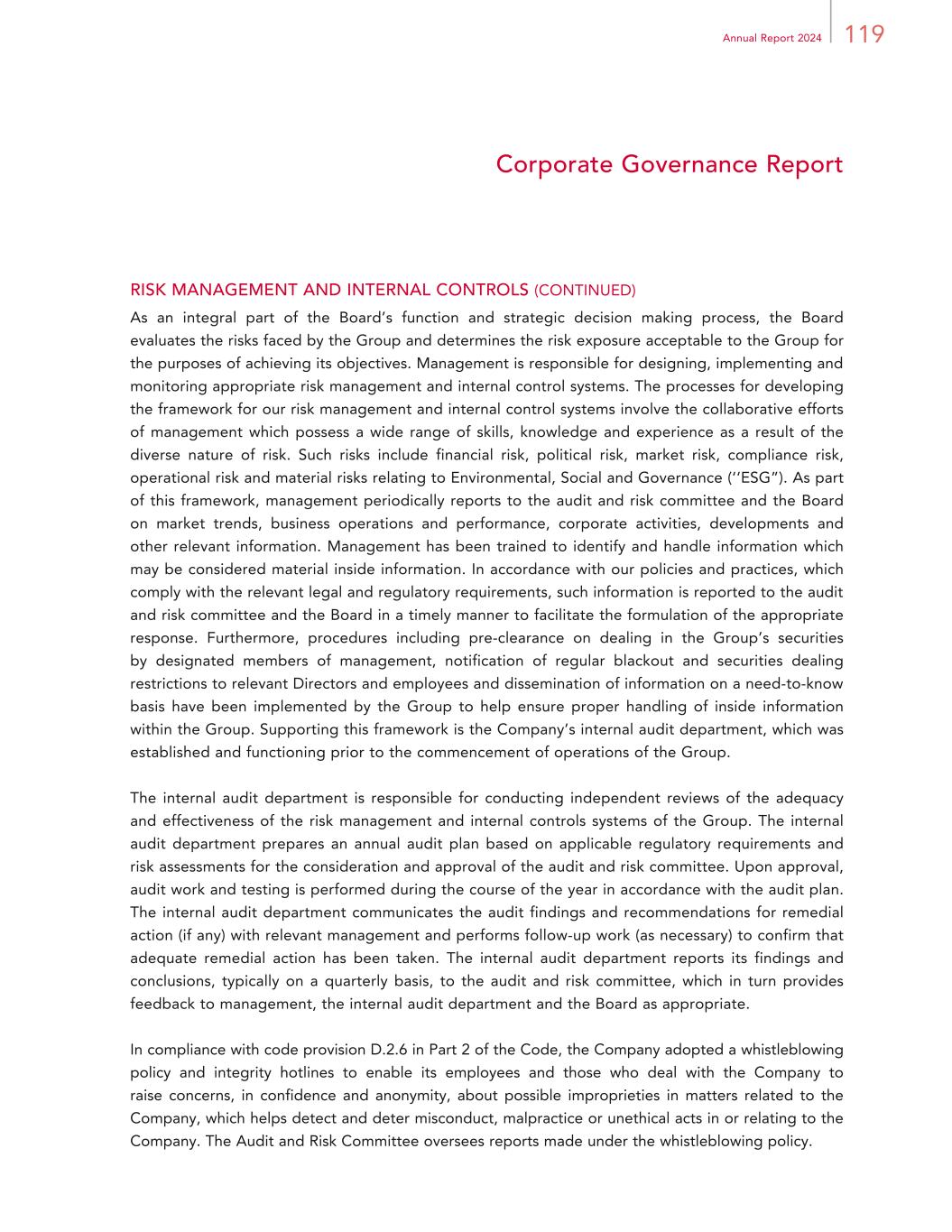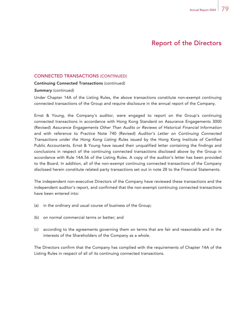 79Annual Report 2024 Report of the Directors CONNECTED TRANSACTIONS (CONTINUED) Continuing Connected Transactions (continued) Summary (continued) Under Chapter 14A of the Listing Rules, the above transactions constitute non-exempt continuing connected transactions of the Group and require disclosure in the annual report of the Company. Ernst & Young, the Company’s auditor, were engaged to report on the Group’s continuing connected transactions in accordance with Hong Kong Standard on Assurance Engagements 3000 (Revised) Assurance Engagements Other Than Audits or Reviews of Historical Financial Information and with reference to Practice Note 740 (Revised) Auditor’s Letter on Continuing Connected Transactions under the Hong Kong Listing Rules issued by the Hong Kong Institute of Certified Public Accountants. Ernst & Young have issued their unqualified letter containing the findings and conclusions in respect of the continuing connected transactions disclosed above by the Group in accordance with Rule 14A.56 of the Listing Rules. A copy of the auditor’s letter has been provided to the Board. In addition, all of the non-exempt continuing connected transactions of the Company disclosed herein constitute related party transactions set out in note 28 to the Financial Statements. The independent non-executive Directors of the Company have reviewed these transactions and the independent auditor’s report, and confirmed that the non-exempt continuing connected transactions have been entered into: (a) in the ordinary and usual course of business of the Group; (b) on normal commercial terms or better; and (c) according to the agreements governing them on terms that are fair and reasonable and in the interests of the Shareholders of the Company as a whole. The Directors confirm that the Company has complied with the requirements of Chapter 14A of the Listing Rules in respect of all of its continuing connected transactions.