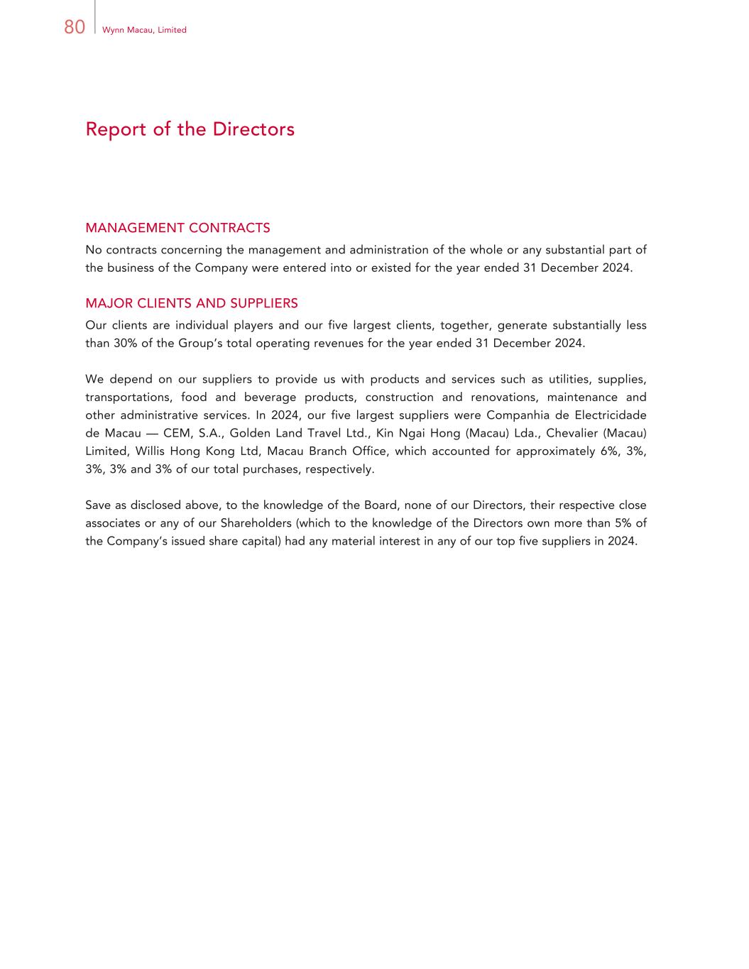 80 Wynn Macau, Limited Report of the Directors MANAGEMENT CONTRACTS No contracts concerning the management and administration of the whole or any substantial part of the business of the Company were entered into or existed for the year ended 31 December 2024. MAJOR CLIENTS AND SUPPLIERS Our clients are individual players and our five largest clients, together, generate substantially less than 30% of the Group’s total operating revenues for the year ended 31 December 2024. We depend on our suppliers to provide us with products and services such as utilities, supplies, transportations, food and beverage products, construction and renovations, maintenance and other administrative services. In 2024, our five largest suppliers were Companhia de Electricidade de Macau — CEM, S.A., Golden Land Travel Ltd., Kin Ngai Hong (Macau) Lda., Chevalier (Macau) Limited, Willis Hong Kong Ltd, Macau Branch Office, which accounted for approximately 6%, 3%, 3%, 3% and 3% of our total purchases, respectively. Save as disclosed above, to the knowledge of the Board, none of our Directors, their respective close associates or any of our Shareholders (which to the knowledge of the Directors own more than 5% of the Company’s issued share capital) had any material interest in any of our top five suppliers in 2024.