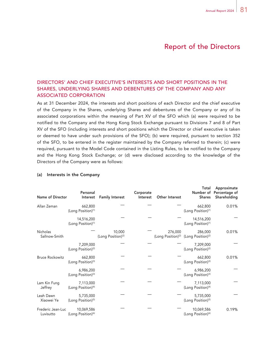 81Annual Report 2024 Report of the Directors DIRECTORS’ AND CHIEF EXECUTIVE’S INTERESTS AND SHORT POSITIONS IN THE SHARES, UNDERLYING SHARES AND DEBENTURES OF THE COMPANY AND ANY ASSOCIATED CORPORATION As at 31 December 2024, the interests and short positions of each Director and the chief executive of the Company in the Shares, underlying Shares and debentures of the Company or any of its associated corporations within the meaning of Part XV of the SFO which (a) were required to be notified to the Company and the Hong Kong Stock Exchange pursuant to Divisions 7 and 8 of Part XV of the SFO (including interests and short positions which the Director or chief executive is taken or deemed to have under such provisions of the SFO); (b) were required, pursuant to section 352 of the SFO, to be entered in the register maintained by the Company referred to therein; (c) were required, pursuant to the Model Code contained in the Listing Rules, to be notified to the Company and the Hong Kong Stock Exchange; or (d) were disclosed according to the knowledge of the Directors of the Company were as follows: (a) Interests in the Company Name of Director Personal Interest Family Interest Corporate Interest Other Interest Total Number of Shares Approximate Percentage of Shareholding Allan Zeman 662,800 (Long Position)(1) — — — 662,800 (Long Position)(1) 0.01% 14,516,200 (Long Position)(1) — — — 14,516,200 (Long Position)(1) — Nicholas Sallnow-Smith — 10,000 (Long Position)(2) — 276,000 (Long Position)(2) 286,000 (Long Position)(2) 0.01% 7,209,000 (Long Position)(2) — — — 7,209,000 (Long Position)(2) — Bruce Rockowitz 662,800 (Long Position)(3) — — — 662,800 (Long Position)(3) 0.01% 6,986,200 (Long Position)(3) — — — 6,986,200 (Long Position)(3) — Lam Kin Fung Jeffrey 7,113,000 (Long Position)(4) — — — 7,113,000 (Long Position)(4) — Leah Dawn Xiaowei Ye 5,735,000 (Long Position)(5) — — — 5,735,000 (Long Position)(5) — Frederic Jean-Luc Luvisutto 10,069,586 (Long Position)(6) — — — 10,069,586 (Long Position)(6) 0.19%