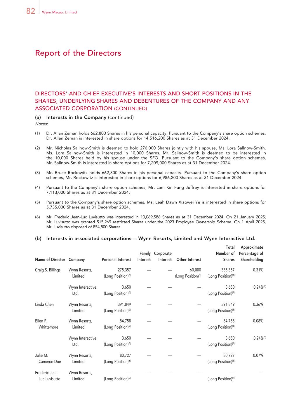 82 Wynn Macau, Limited Report of the Directors DIRECTORS’ AND CHIEF EXECUTIVE’S INTERESTS AND SHORT POSITIONS IN THE SHARES, UNDERLYING SHARES AND DEBENTURES OF THE COMPANY AND ANY ASSOCIATED CORPORATION (CONTINUED) (a) Interests in the Company (continued) Notes: (1) Dr. Allan Zeman holds 662,800 Shares in his personal capacity. Pursuant to the Company’s share option schemes, Dr. Allan Zeman is interested in share options for 14,516,200 Shares as at 31 December 2024. (2) Mr. Nicholas Sallnow-Smith is deemed to hold 276,000 Shares jointly with his spouse, Ms. Lora Sallnow-Smith. Ms. Lora Sallnow-Smith is interested in 10,000 Shares. Mr. Sallnow-Smith is deemed to be interested in the 10,000 Shares held by his spouse under the SFO. Pursuant to the Company’s share option schemes, Mr. Sallnow-Smith is interested in share options for 7,209,000 Shares as at 31 December 2024. (3) Mr. Bruce Rockowitz holds 662,800 Shares in his personal capacity. Pursuant to the Company’s share option schemes, Mr. Rockowitz is interested in share options for 6,986,200 Shares as at 31 December 2024. (4) Pursuant to the Company’s share option schemes, Mr. Lam Kin Fung Jeffrey is interested in share options for 7,113,000 Shares as at 31 December 2024. (5) Pursuant to the Company’s share option schemes, Ms. Leah Dawn Xiaowei Ye is interested in share options for 5,735,000 Shares as at 31 December 2024. (6) Mr. Frederic Jean-Luc Luvisutto was interested in 10,069,586 Shares as at 31 December 2024. On 21 January 2025, Mr. Luvisutto was granted 515,269 restricted Shares under the 2023 Employee Ownership Scheme. On 1 April 2025, Mr. Luvisutto disposed of 854,800 Shares. (b) Interests in associated corporations — Wynn Resorts, Limited and Wynn Interactive Ltd. Name of Director Company Personal Interest Family Interest Corporate Interest Other Interest Total Number of Shares Approximate Percentage of Shareholding Craig S. Billings Wynn Resorts, Limited 275,357 (Long Position)(1) — — 60,000 (Long Position)(1) 335,357 (Long Position)(1) 0.31% Wynn Interactive Ltd. 3,650 (Long Position)(2) — — — 3,650 (Long Position)(2) 0.24%(2) Linda Chen Wynn Resorts, Limited 391,849 (Long Position)(3) — — — 391,849 (Long Position)(3) 0.36% Ellen F. Whittemore Wynn Resorts, Limited 84,758 (Long Position)(4) — — — 84,758 (Long Position)(4) 0.08% Wynn Interactive Ltd. 3,650 (Long Position)(5) — — — 3,650 (Long Position)(5) 0.24%(5) Julie M. Cameron-Doe Wynn Resorts, Limited 80,727 (Long Position)(6) — — — 80,727 (Long Position)(6) 0.07% Frederic Jean- Luc Luvisutto Wynn Resorts, Limited — (Long Position)(7) — — — — (Long Position)(7) —
