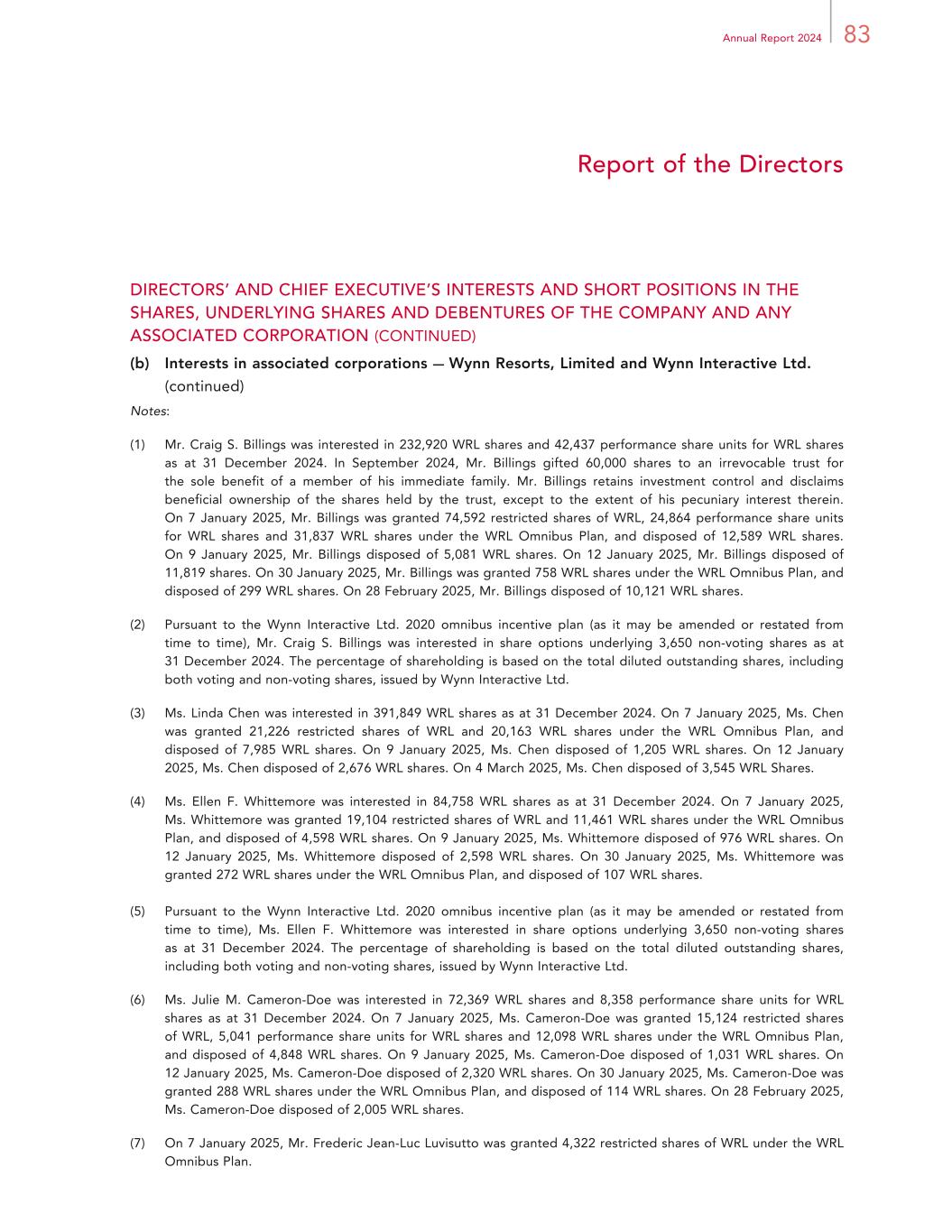83Annual Report 2024 Report of the Directors DIRECTORS’ AND CHIEF EXECUTIVE’S INTERESTS AND SHORT POSITIONS IN THE SHARES, UNDERLYING SHARES AND DEBENTURES OF THE COMPANY AND ANY ASSOCIATED CORPORATION (CONTINUED) (b) Interests in associated corporations — Wynn Resorts, Limited and Wynn Interactive Ltd. (continued) Notes: (1) Mr. Craig S. Billings was interested in 232,920 WRL shares and 42,437 performance share units for WRL shares as at 31 December 2024. In September 2024, Mr. Billings gifted 60,000 shares to an irrevocable trust for the sole benefit of a member of his immediate family. Mr. Billings retains investment control and disclaims beneficial ownership of the shares held by the trust, except to the extent of his pecuniary interest therein. On 7 January 2025, Mr. Billings was granted 74,592 restricted shares of WRL, 24,864 performance share units for WRL shares and 31,837 WRL shares under the WRL Omnibus Plan, and disposed of 12,589 WRL shares. On 9 January 2025, Mr. Billings disposed of 5,081 WRL shares. On 12 January 2025, Mr. Billings disposed of 11,819 shares. On 30 January 2025, Mr. Billings was granted 758 WRL shares under the WRL Omnibus Plan, and disposed of 299 WRL shares. On 28 February 2025, Mr. Billings disposed of 10,121 WRL shares. (2) Pursuant to the Wynn Interactive Ltd. 2020 omnibus incentive plan (as it may be amended or restated from time to time), Mr. Craig S. Billings was interested in share options underlying 3,650 non-voting shares as at 31 December 2024. The percentage of shareholding is based on the total diluted outstanding shares, including both voting and non-voting shares, issued by Wynn Interactive Ltd. (3) Ms. Linda Chen was interested in 391,849 WRL shares as at 31 December 2024. On 7 January 2025, Ms. Chen was granted 21,226 restricted shares of WRL and 20,163 WRL shares under the WRL Omnibus Plan, and disposed of 7,985 WRL shares. On 9 January 2025, Ms. Chen disposed of 1,205 WRL shares. On 12 January 2025, Ms. Chen disposed of 2,676 WRL shares. On 4 March 2025, Ms. Chen disposed of 3,545 WRL Shares. (4) Ms. Ellen F. Whittemore was interested in 84,758 WRL shares as at 31 December 2024. On 7 January 2025, Ms. Whittemore was granted 19,104 restricted shares of WRL and 11,461 WRL shares under the WRL Omnibus Plan, and disposed of 4,598 WRL shares. On 9 January 2025, Ms. Whittemore disposed of 976 WRL shares. On 12 January 2025, Ms. Whittemore disposed of 2,598 WRL shares. On 30 January 2025, Ms. Whittemore was granted 272 WRL shares under the WRL Omnibus Plan, and disposed of 107 WRL shares. (5) Pursuant to the Wynn Interactive Ltd. 2020 omnibus incentive plan (as it may be amended or restated from time to time), Ms. Ellen F. Whittemore was interested in share options underlying 3,650 non-voting shares as at 31 December 2024. The percentage of shareholding is based on the total diluted outstanding shares, including both voting and non-voting shares, issued by Wynn Interactive Ltd. (6) Ms. Julie M. Cameron-Doe was interested in 72,369 WRL shares and 8,358 performance share units for WRL shares as at 31 December 2024. On 7 January 2025, Ms. Cameron-Doe was granted 15,124 restricted shares of WRL, 5,041 performance share units for WRL shares and 12,098 WRL shares under the WRL Omnibus Plan, and disposed of 4,848 WRL shares. On 9 January 2025, Ms. Cameron-Doe disposed of 1,031 WRL shares. On 12 January 2025, Ms. Cameron-Doe disposed of 2,320 WRL shares. On 30 January 2025, Ms. Cameron-Doe was granted 288 WRL shares under the WRL Omnibus Plan, and disposed of 114 WRL shares. On 28 February 2025, Ms. Cameron-Doe disposed of 2,005 WRL shares. (7) On 7 January 2025, Mr. Frederic Jean-Luc Luvisutto was granted 4,322 restricted shares of WRL under the WRL Omnibus Plan.