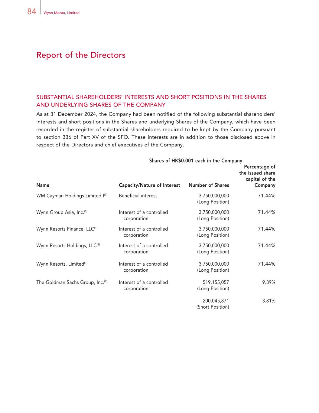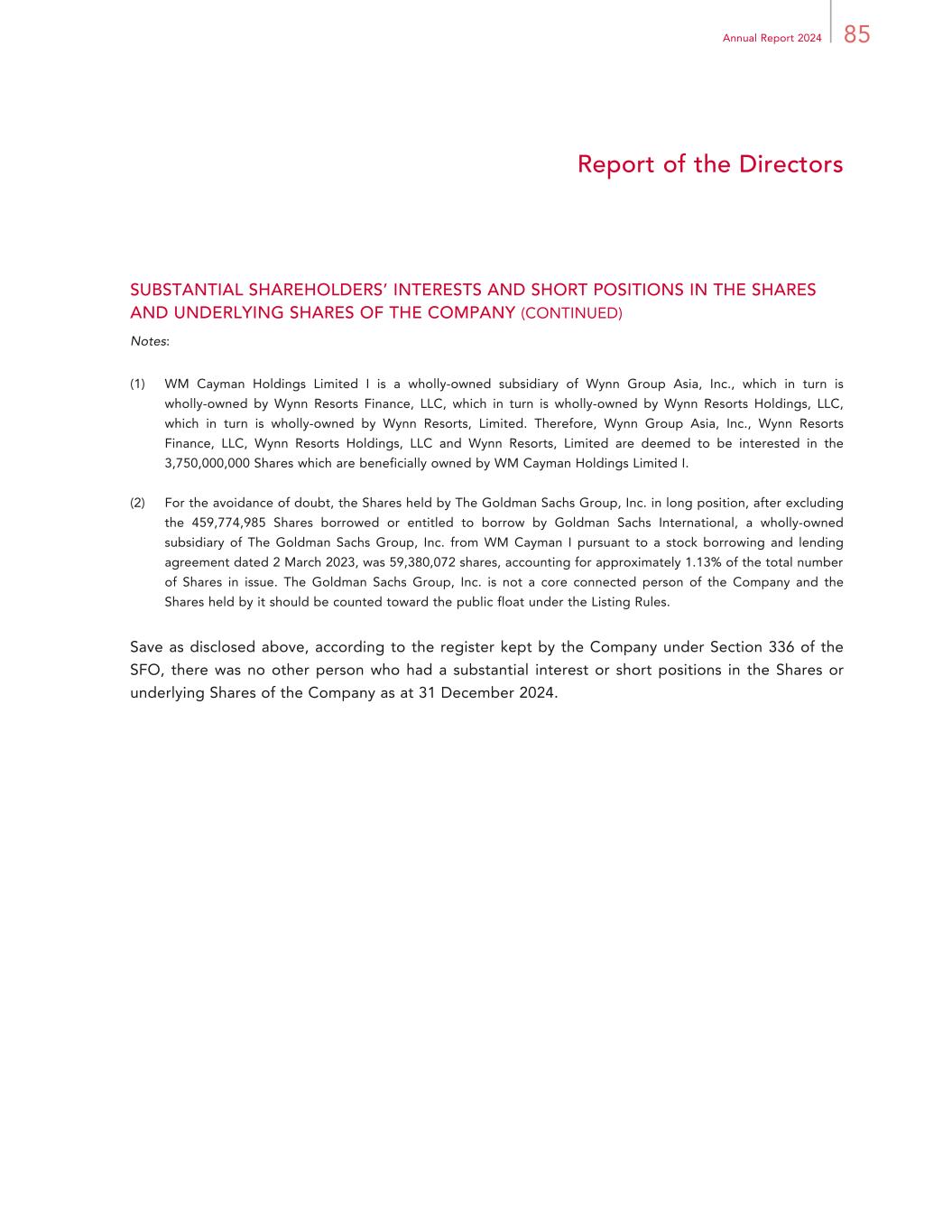 85Annual Report 2024 Report of the Directors SUBSTANTIAL SHAREHOLDERS’ INTERESTS AND SHORT POSITIONS IN THE SHARES AND UNDERLYING SHARES OF THE COMPANY (CONTINUED) Notes: (1) WM Cayman Holdings Limited I is a wholly-owned subsidiary of Wynn Group Asia, Inc., which in turn is wholly-owned by Wynn Resorts Finance, LLC, which in turn is wholly-owned by Wynn Resorts Holdings, LLC, which in turn is wholly-owned by Wynn Resorts, Limited. Therefore, Wynn Group Asia, Inc., Wynn Resorts Finance, LLC, Wynn Resorts Holdings, LLC and Wynn Resorts, Limited are deemed to be interested in the 3,750,000,000 Shares which are beneficially owned by WM Cayman Holdings Limited I. (2) For the avoidance of doubt, the Shares held by The Goldman Sachs Group, Inc. in long position, after excluding the 459,774,985 Shares borrowed or entitled to borrow by Goldman Sachs International, a wholly-owned subsidiary of The Goldman Sachs Group, Inc. from WM Cayman I pursuant to a stock borrowing and lending agreement dated 2 March 2023, was 59,380,072 shares, accounting for approximately 1.13% of the total number of Shares in issue. The Goldman Sachs Group, Inc. is not a core connected person of the Company and the Shares held by it should be counted toward the public float under the Listing Rules. Save as disclosed above, according to the register kept by the Company under Section 336 of the SFO, there was no other person who had a substantial interest or short positions in the Shares or underlying Shares of the Company as at 31 December 2024.