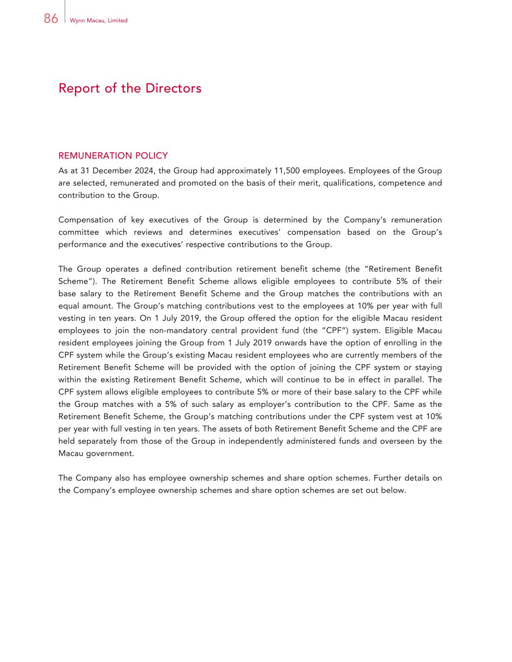 86 Wynn Macau, Limited Report of the Directors REMUNERATION POLICY As at 31 December 2024, the Group had approximately 11,500 employees. Employees of the Group are selected, remunerated and promoted on the basis of their merit, qualifications, competence and contribution to the Group. Compensation of key executives of the Group is determined by the Company’s remuneration committee which reviews and determines executives’ compensation based on the Group’s performance and the executives’ respective contributions to the Group. The Group operates a defined contribution retirement benefit scheme (the “Retirement Benefit Scheme”). The Retirement Benefit Scheme allows eligible employees to contribute 5% of their base salary to the Retirement Benefit Scheme and the Group matches the contributions with an equal amount. The Group’s matching contributions vest to the employees at 10% per year with full vesting in ten years. On 1 July 2019, the Group offered the option for the eligible Macau resident employees to join the non-mandatory central provident fund (the “CPF”) system. Eligible Macau resident employees joining the Group from 1 July 2019 onwards have the option of enrolling in the CPF system while the Group’s existing Macau resident employees who are currently members of the Retirement Benefit Scheme will be provided with the option of joining the CPF system or staying within the existing Retirement Benefit Scheme, which will continue to be in effect in parallel. The CPF system allows eligible employees to contribute 5% or more of their base salary to the CPF while the Group matches with a 5% of such salary as employer’s contribution to the CPF. Same as the Retirement Benefit Scheme, the Group’s matching contributions under the CPF system vest at 10% per year with full vesting in ten years. The assets of both Retirement Benefit Scheme and the CPF are held separately from those of the Group in independently administered funds and overseen by the Macau government. The Company also has employee ownership schemes and share option schemes. Further details on the Company’s employee ownership schemes and share option schemes are set out below.