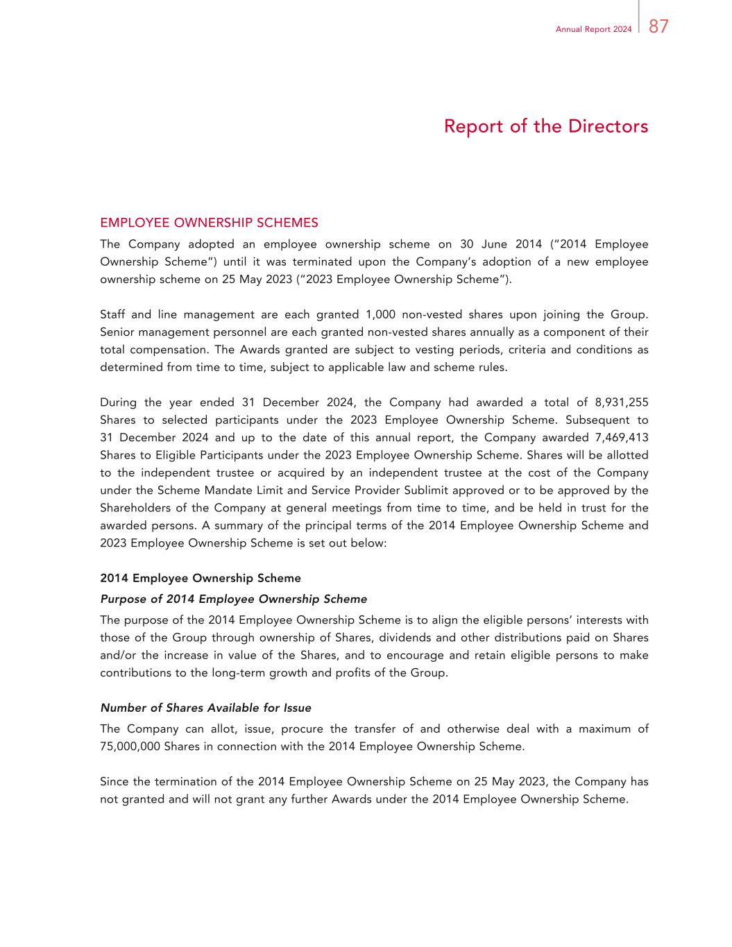 87Annual Report 2024 Report of the Directors EMPLOYEE OWNERSHIP SCHEMES The Company adopted an employee ownership scheme on 30 June 2014 (“2014 Employee Ownership Scheme”) until it was terminated upon the Company’s adoption of a new employee ownership scheme on 25 May 2023 (“2023 Employee Ownership Scheme”). Staff and line management are each granted 1,000 non-vested shares upon joining the Group. Senior management personnel are each granted non-vested shares annually as a component of their total compensation. The Awards granted are subject to vesting periods, criteria and conditions as determined from time to time, subject to applicable law and scheme rules. During the year ended 31 December 2024, the Company had awarded a total of 8,931,255 Shares to selected participants under the 2023 Employee Ownership Scheme. Subsequent to 31 December 2024 and up to the date of this annual report, the Company awarded 7,469,413 Shares to Eligible Participants under the 2023 Employee Ownership Scheme. Shares will be allotted to the independent trustee or acquired by an independent trustee at the cost of the Company under the Scheme Mandate Limit and Service Provider Sublimit approved or to be approved by the Shareholders of the Company at general meetings from time to time, and be held in trust for the awarded persons. A summary of the principal terms of the 2014 Employee Ownership Scheme and 2023 Employee Ownership Scheme is set out below: 2014 Employee Ownership Scheme Purpose of 2014 Employee Ownership Scheme The purpose of the 2014 Employee Ownership Scheme is to align the eligible persons’ interests with those of the Group through ownership of Shares, dividends and other distributions paid on Shares and/or the increase in value of the Shares, and to encourage and retain eligible persons to make contributions to the long-term growth and profits of the Group. Number of Shares Available for Issue The Company can allot, issue, procure the transfer of and otherwise deal with a maximum of 75,000,000 Shares in connection with the 2014 Employee Ownership Scheme. Since the termination of the 2014 Employee Ownership Scheme on 25 May 2023, the Company has not granted and will not grant any further Awards under the 2014 Employee Ownership Scheme.