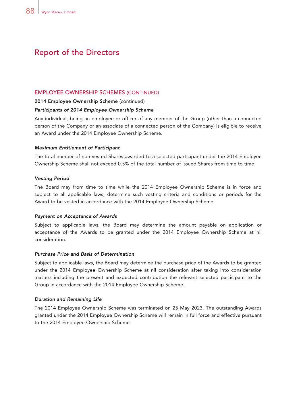88 Wynn Macau, Limited Report of the Directors EMPLOYEE OWNERSHIP SCHEMES (CONTINUED) 2014 Employee Ownership Scheme (continued) Participants of 2014 Employee Ownership Scheme Any individual, being an employee or officer of any member of the Group (other than a connected person of the Company or an associate of a connected person of the Company) is eligible to receive an Award under the 2014 Employee Ownership Scheme. Maximum Entitlement of Participant The total number of non-vested Shares awarded to a selected participant under the 2014 Employee Ownership Scheme shall not exceed 0.5% of the total number of issued Shares from time to time. Vesting Period The Board may from time to time while the 2014 Employee Ownership Scheme is in force and subject to all applicable laws, determine such vesting criteria and conditions or periods for the Award to be vested in accordance with the 2014 Employee Ownership Scheme. Payment on Acceptance of Awards Subject to applicable laws, the Board may determine the amount payable on application or acceptance of the Awards to be granted under the 2014 Employee Ownership Scheme at nil consideration. Purchase Price and Basis of Determination Subject to applicable laws, the Board may determine the purchase price of the Awards to be granted under the 2014 Employee Ownership Scheme at nil consideration after taking into consideration matters including the present and expected contribution the relevant selected participant to the Group in accordance with the 2014 Employee Ownership Scheme. Duration and Remaining Life The 2014 Employee Ownership Scheme was terminated on 25 May 2023. The outstanding Awards granted under the 2014 Employee Ownership Scheme will remain in full force and effective pursuant to the 2014 Employee Ownership Scheme.