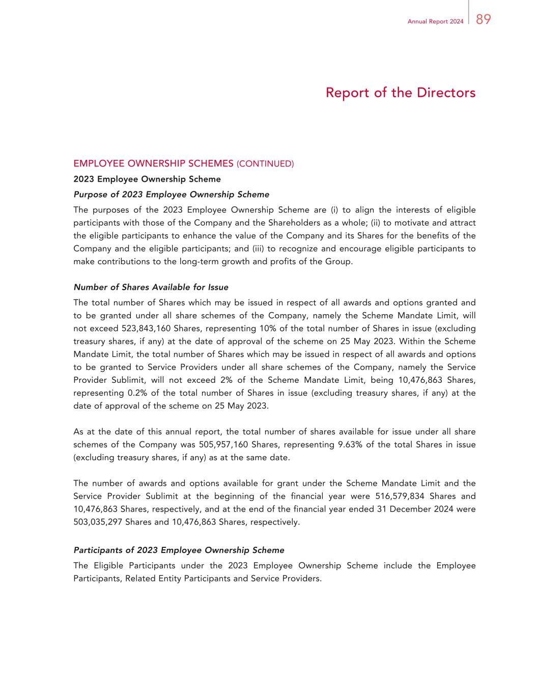 89Annual Report 2024 Report of the Directors EMPLOYEE OWNERSHIP SCHEMES (CONTINUED) 2023 Employee Ownership Scheme Purpose of 2023 Employee Ownership Scheme The purposes of the 2023 Employee Ownership Scheme are (i) to align the interests of eligible participants with those of the Company and the Shareholders as a whole; (ii) to motivate and attract the eligible participants to enhance the value of the Company and its Shares for the benefits of the Company and the eligible participants; and (iii) to recognize and encourage eligible participants to make contributions to the long-term growth and profits of the Group. Number of Shares Available for Issue The total number of Shares which may be issued in respect of all awards and options granted and to be granted under all share schemes of the Company, namely the Scheme Mandate Limit, will not exceed 523,843,160 Shares, representing 10% of the total number of Shares in issue (excluding treasury shares, if any) at the date of approval of the scheme on 25 May 2023. Within the Scheme Mandate Limit, the total number of Shares which may be issued in respect of all awards and options to be granted to Service Providers under all share schemes of the Company, namely the Service Provider Sublimit, will not exceed 2% of the Scheme Mandate Limit, being 10,476,863 Shares, representing 0.2% of the total number of Shares in issue (excluding treasury shares, if any) at the date of approval of the scheme on 25 May 2023. As at the date of this annual report, the total number of shares available for issue under all share schemes of the Company was 505,957,160 Shares, representing 9.63% of the total Shares in issue (excluding treasury shares, if any) as at the same date. The number of awards and options available for grant under the Scheme Mandate Limit and the Service Provider Sublimit at the beginning of the financial year were 516,579,834 Shares and 10,476,863 Shares, respectively, and at the end of the financial year ended 31 December 2024 were 503,035,297 Shares and 10,476,863 Shares, respectively. Participants of 2023 Employee Ownership Scheme The Eligible Participants under the 2023 Employee Ownership Scheme include the Employee Participants, Related Entity Participants and Service Providers.