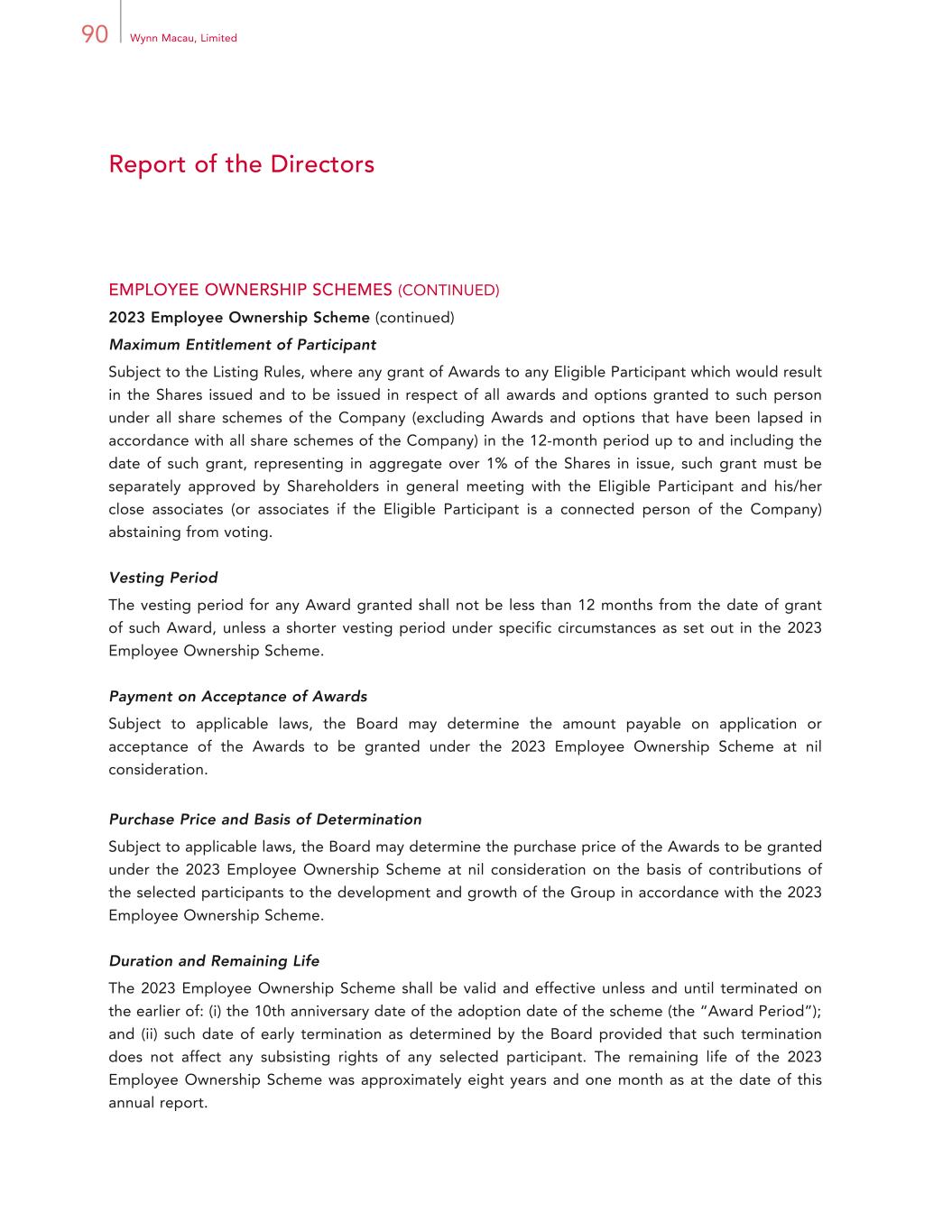 90 Wynn Macau, Limited Report of the Directors EMPLOYEE OWNERSHIP SCHEMES (CONTINUED) 2023 Employee Ownership Scheme (continued) Maximum Entitlement of Participant Subject to the Listing Rules, where any grant of Awards to any Eligible Participant which would result in the Shares issued and to be issued in respect of all awards and options granted to such person under all share schemes of the Company (excluding Awards and options that have been lapsed in accordance with all share schemes of the Company) in the 12-month period up to and including the date of such grant, representing in aggregate over 1% of the Shares in issue, such grant must be separately approved by Shareholders in general meeting with the Eligible Participant and his/her close associates (or associates if the Eligible Participant is a connected person of the Company) abstaining from voting. Vesting Period The vesting period for any Award granted shall not be less than 12 months from the date of grant of such Award, unless a shorter vesting period under specific circumstances as set out in the 2023 Employee Ownership Scheme. Payment on Acceptance of Awards Subject to applicable laws, the Board may determine the amount payable on application or acceptance of the Awards to be granted under the 2023 Employee Ownership Scheme at nil consideration. Purchase Price and Basis of Determination Subject to applicable laws, the Board may determine the purchase price of the Awards to be granted under the 2023 Employee Ownership Scheme at nil consideration on the basis of contributions of the selected participants to the development and growth of the Group in accordance with the 2023 Employee Ownership Scheme. Duration and Remaining Life The 2023 Employee Ownership Scheme shall be valid and effective unless and until terminated on the earlier of: (i) the 10th anniversary date of the adoption date of the scheme (the “Award Period”); and (ii) such date of early termination as determined by the Board provided that such termination does not affect any subsisting rights of any selected participant. The remaining life of the 2023 Employee Ownership Scheme was approximately eight years and one month as at the date of this annual report.