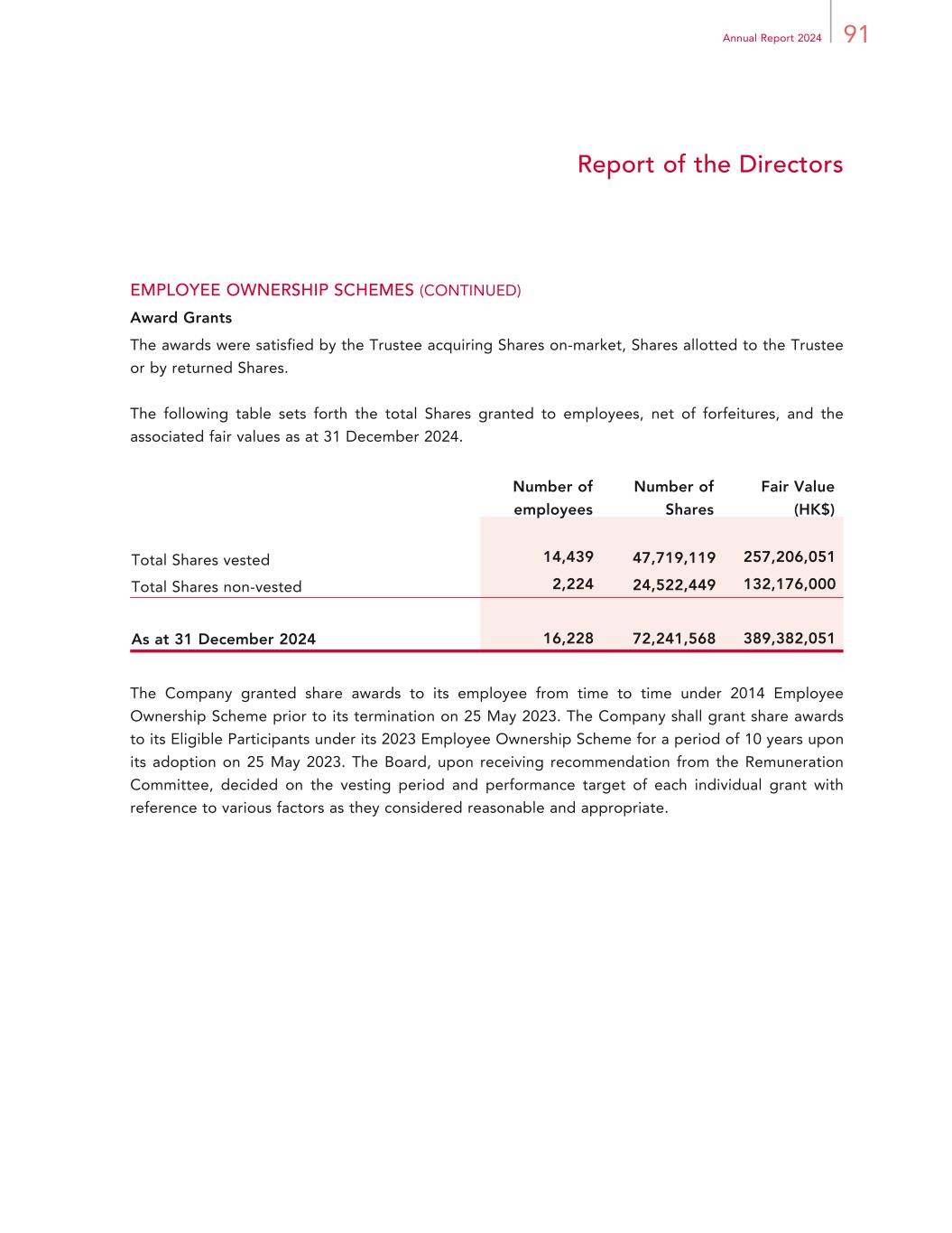 91Annual Report 2024 Report of the Directors EMPLOYEE OWNERSHIP SCHEMES (CONTINUED) Award Grants The awards were satisfied by the Trustee acquiring Shares on-market, Shares allotted to the Trustee or by returned Shares. The following table sets forth the total Shares granted to employees, net of forfeitures, and the associated fair values as at 31 December 2024. Number of employees Number of Shares Fair Value (HK$) Total Shares vested 14,439 47,719,119 257,206,051 Total Shares non-vested 2,224 24,522,449 132,176,000 As at 31 December 2024 16,228 72,241,568 389,382,051 The Company granted share awards to its employee from time to time under 2014 Employee Ownership Scheme prior to its termination on 25 May 2023. The Company shall grant share awards to its Eligible Participants under its 2023 Employee Ownership Scheme for a period of 10 years upon its adoption on 25 May 2023. The Board, upon receiving recommendation from the Remuneration Committee, decided on the vesting period and performance target of each individual grant with reference to various factors as they considered reasonable and appropriate.