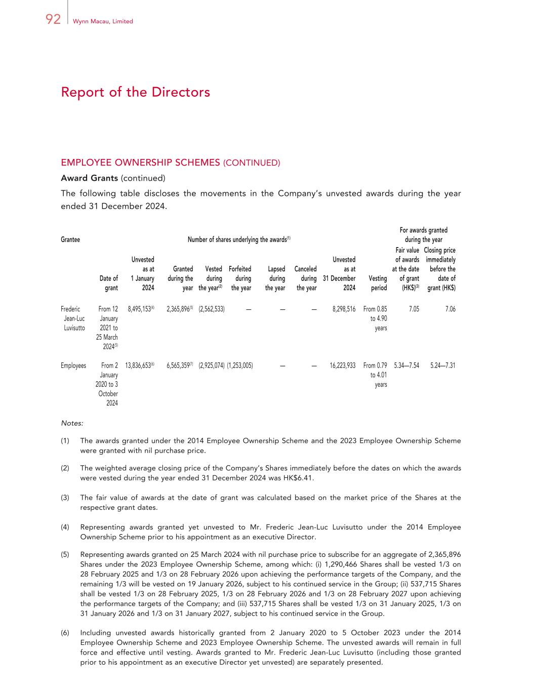 92 Wynn Macau, Limited Report of the Directors EMPLOYEE OWNERSHIP SCHEMES (CONTINUED) Award Grants (continued) The following table discloses the movements in the Company’s unvested awards during the year ended 31 December 2024. Grantee Number of shares underlying the awards(1) For awards granted during the year Date of grant Unvested as at 1 January 2024 Granted during the year Vested during the year(2) Forfeited during the year Lapsed during the year Canceled during the year Unvested as at 31 December 2024 Vesting period Fair value of awards at the date of grant (HK$)(3) Closing price immediately before the date of grant (HK$) Frederic Jean-Luc Luvisutto From 12 January 2021 to 25 March 2024(5) 8,495,153(4) 2,365,896(5) (2,562,533) — — — 8,298,516 From 0.85 to 4.90 years 7.05 7.06 Employees From 2 January 2020 to 3 October 2024 13,836,653(6) 6,565,359(7) (2,925,074) (1,253,005) — — 16,223,933 From 0.79 to 4.01 years 5.34—7.54 5.24—7.31 Notes: (1) The awards granted under the 2014 Employee Ownership Scheme and the 2023 Employee Ownership Scheme were granted with nil purchase price. (2) The weighted average closing price of the Company’s Shares immediately before the dates on which the awards were vested during the year ended 31 December 2024 was HK$6.41. (3) The fair value of awards at the date of grant was calculated based on the market price of the Shares at the respective grant dates. (4) Representing awards granted yet unvested to Mr. Frederic Jean-Luc Luvisutto under the 2014 Employee Ownership Scheme prior to his appointment as an executive Director. (5) Representing awards granted on 25 March 2024 with nil purchase price to subscribe for an aggregate of 2,365,896 Shares under the 2023 Employee Ownership Scheme, among which: (i) 1,290,466 Shares shall be vested 1/3 on 28 February 2025 and 1/3 on 28 February 2026 upon achieving the performance targets of the Company, and the remaining 1/3 will be vested on 19 January 2026, subject to his continued service in the Group; (ii) 537,715 Shares shall be vested 1/3 on 28 February 2025, 1/3 on 28 February 2026 and 1/3 on 28 February 2027 upon achieving the performance targets of the Company; and (iii) 537,715 Shares shall be vested 1/3 on 31 January 2025, 1/3 on 31 January 2026 and 1/3 on 31 January 2027, subject to his continued service in the Group. (6) Including unvested awards historically granted from 2 January 2020 to 5 October 2023 under the 2014 Employee Ownership Scheme and 2023 Employee Ownership Scheme. The unvested awards will remain in full force and effective until vesting. Awards granted to Mr. Frederic Jean-Luc Luvisutto (including those granted prior to his appointment as an executive Director yet unvested) are separately presented.