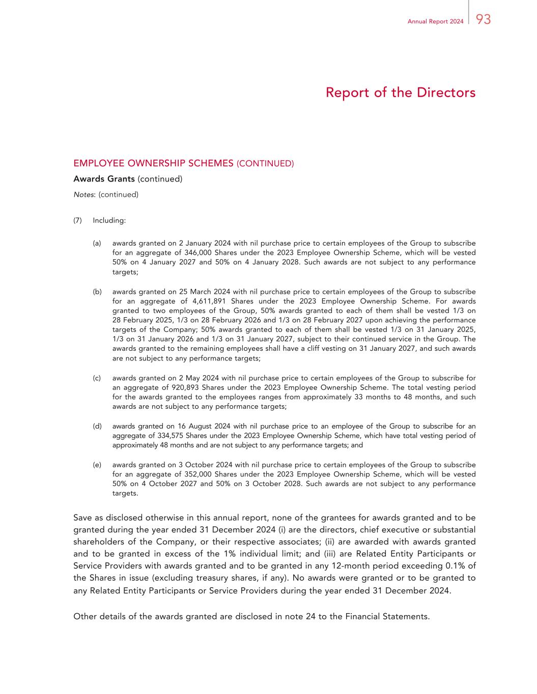93Annual Report 2024 Report of the Directors EMPLOYEE OWNERSHIP SCHEMES (CONTINUED) Awards Grants (continued) Notes: (continued) (7) Including: (a) awards granted on 2 January 2024 with nil purchase price to certain employees of the Group to subscribe for an aggregate of 346,000 Shares under the 2023 Employee Ownership Scheme, which will be vested 50% on 4 January 2027 and 50% on 4 January 2028. Such awards are not subject to any performance targets; (b) awards granted on 25 March 2024 with nil purchase price to certain employees of the Group to subscribe for an aggregate of 4,611,891 Shares under the 2023 Employee Ownership Scheme. For awards granted to two employees of the Group, 50% awards granted to each of them shall be vested 1/3 on 28 February 2025, 1/3 on 28 February 2026 and 1/3 on 28 February 2027 upon achieving the performance targets of the Company; 50% awards granted to each of them shall be vested 1/3 on 31 January 2025, 1/3 on 31 January 2026 and 1/3 on 31 January 2027, subject to their continued service in the Group. The awards granted to the remaining employees shall have a cliff vesting on 31 January 2027, and such awards are not subject to any performance targets; (c) awards granted on 2 May 2024 with nil purchase price to certain employees of the Group to subscribe for an aggregate of 920,893 Shares under the 2023 Employee Ownership Scheme. The total vesting period for the awards granted to the employees ranges from approximately 33 months to 48 months, and such awards are not subject to any performance targets; (d) awards granted on 16 August 2024 with nil purchase price to an employee of the Group to subscribe for an aggregate of 334,575 Shares under the 2023 Employee Ownership Scheme, which have total vesting period of approximately 48 months and are not subject to any performance targets; and (e) awards granted on 3 October 2024 with nil purchase price to certain employees of the Group to subscribe for an aggregate of 352,000 Shares under the 2023 Employee Ownership Scheme, which will be vested 50% on 4 October 2027 and 50% on 3 October 2028. Such awards are not subject to any performance targets. Save as disclosed otherwise in this annual report, none of the grantees for awards granted and to be granted during the year ended 31 December 2024 (i) are the directors, chief executive or substantial shareholders of the Company, or their respective associates; (ii) are awarded with awards granted and to be granted in excess of the 1% individual limit; and (iii) are Related Entity Participants or Service Providers with awards granted and to be granted in any 12-month period exceeding 0.1% of the Shares in issue (excluding treasury shares, if any). No awards were granted or to be granted to any Related Entity Participants or Service Providers during the year ended 31 December 2024. Other details of the awards granted are disclosed in note 24 to the Financial Statements.