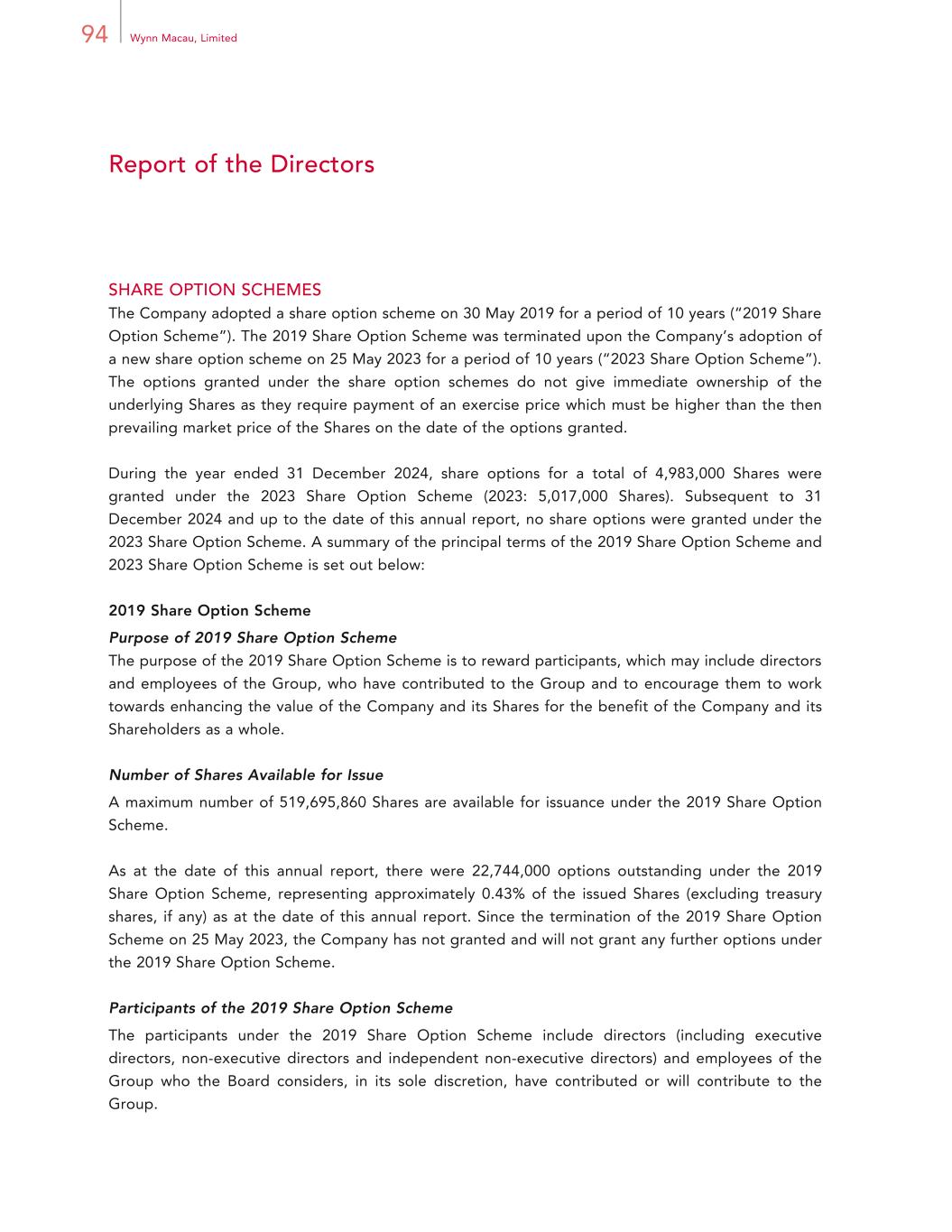 94 Wynn Macau, Limited Report of the Directors SHARE OPTION SCHEMES The Company adopted a share option scheme on 30 May 2019 for a period of 10 years (“2019 Share Option Scheme”). The 2019 Share Option Scheme was terminated upon the Company’s adoption of a new share option scheme on 25 May 2023 for a period of 10 years (“2023 Share Option Scheme”). The options granted under the share option schemes do not give immediate ownership of the underlying Shares as they require payment of an exercise price which must be higher than the then prevailing market price of the Shares on the date of the options granted. During the year ended 31 December 2024, share options for a total of 4,983,000 Shares were granted under the 2023 Share Option Scheme (2023: 5,017,000 Shares). Subsequent to 31 December 2024 and up to the date of this annual report, no share options were granted under the 2023 Share Option Scheme. A summary of the principal terms of the 2019 Share Option Scheme and 2023 Share Option Scheme is set out below: 2019 Share Option Scheme Purpose of 2019 Share Option Scheme The purpose of the 2019 Share Option Scheme is to reward participants, which may include directors and employees of the Group, who have contributed to the Group and to encourage them to work towards enhancing the value of the Company and its Shares for the benefit of the Company and its Shareholders as a whole. Number of Shares Available for Issue A maximum number of 519,695,860 Shares are available for issuance under the 2019 Share Option Scheme. As at the date of this annual report, there were 22,744,000 options outstanding under the 2019 Share Option Scheme, representing approximately 0.43% of the issued Shares (excluding treasury shares, if any) as at the date of this annual report. Since the termination of the 2019 Share Option Scheme on 25 May 2023, the Company has not granted and will not grant any further options under the 2019 Share Option Scheme. Participants of the 2019 Share Option Scheme The participants under the 2019 Share Option Scheme include directors (including executive directors, non-executive directors and independent non-executive directors) and employees of the Group who the Board considers, in its sole discretion, have contributed or will contribute to the Group.