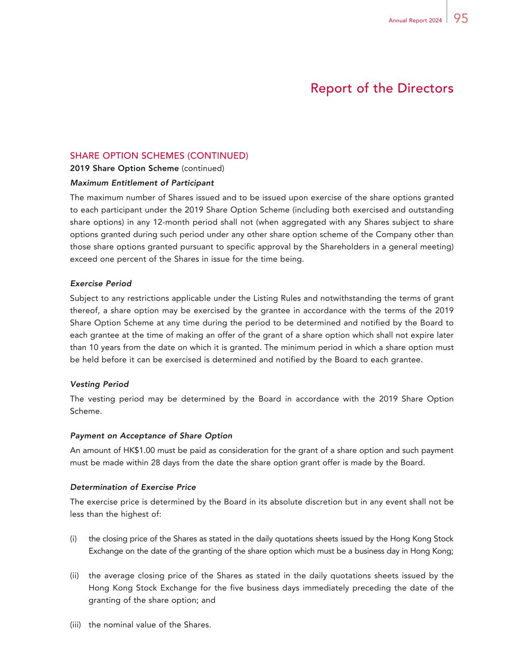 95Annual Report 2024 Report of the Directors SHARE OPTION SCHEMES (CONTINUED) 2019 Share Option Scheme (continued) Maximum Entitlement of Participant The maximum number of Shares issued and to be issued upon exercise of the share options granted to each participant under the 2019 Share Option Scheme (including both exercised and outstanding share options) in any 12-month period shall not (when aggregated with any Shares subject to share options granted during such period under any other share option scheme of the Company other than those share options granted pursuant to specific approval by the Shareholders in a general meeting) exceed one percent of the Shares in issue for the time being. Exercise Period Subject to any restrictions applicable under the Listing Rules and notwithstanding the terms of grant thereof, a share option may be exercised by the grantee in accordance with the terms of the 2019 Share Option Scheme at any time during the period to be determined and notified by the Board to each grantee at the time of making an offer of the grant of a share option which shall not expire later than 10 years from the date on which it is granted. The minimum period in which a share option must be held before it can be exercised is determined and notified by the Board to each grantee. Vesting Period The vesting period may be determined by the Board in accordance with the 2019 Share Option Scheme. Payment on Acceptance of Share Option An amount of HK$1.00 must be paid as consideration for the grant of a share option and such payment must be made within 28 days from the date the share option grant offer is made by the Board. Determination of Exercise Price The exercise price is determined by the Board in its absolute discretion but in any event shall not be less than the highest of: (i) the closing price of the Shares as stated in the daily quotations sheets issued by the Hong Kong Stock Exchange on the date of the granting of the share option which must be a business day in Hong Kong; (ii) the average closing price of the Shares as stated in the daily quotations sheets issued by the Hong Kong Stock Exchange for the five business days immediately preceding the date of the granting of the share option; and (iii) the nominal value of the Shares.