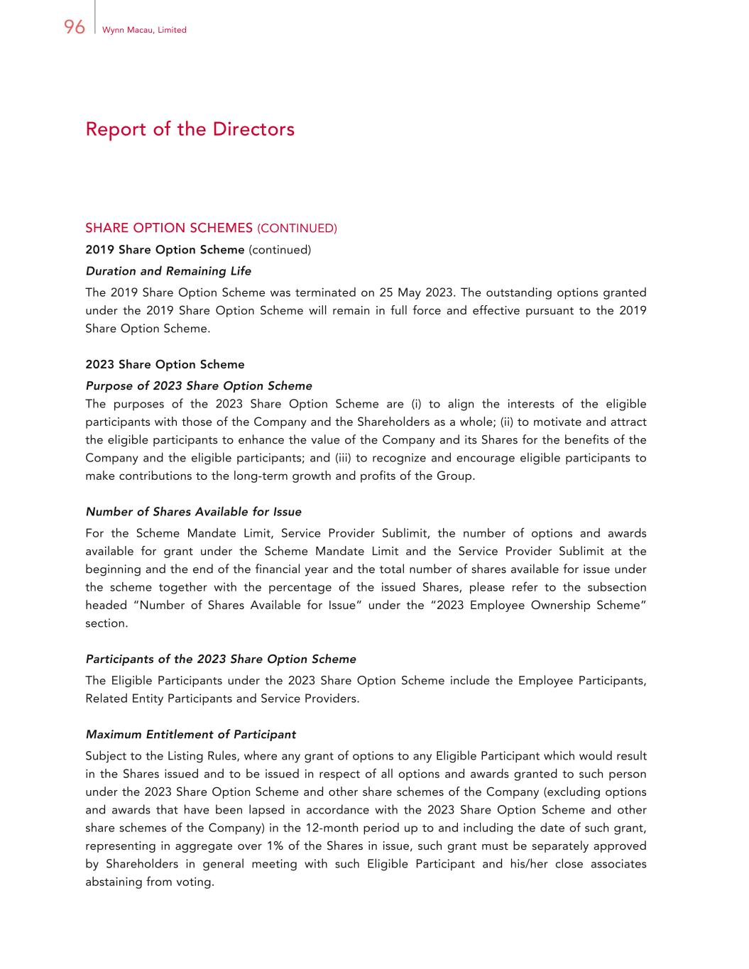 96 Wynn Macau, Limited Report of the Directors SHARE OPTION SCHEMES (CONTINUED) 2019 Share Option Scheme (continued) Duration and Remaining Life The 2019 Share Option Scheme was terminated on 25 May 2023. The outstanding options granted under the 2019 Share Option Scheme will remain in full force and effective pursuant to the 2019 Share Option Scheme. 2023 Share Option Scheme Purpose of 2023 Share Option Scheme The purposes of the 2023 Share Option Scheme are (i) to align the interests of the eligible participants with those of the Company and the Shareholders as a whole; (ii) to motivate and attract the eligible participants to enhance the value of the Company and its Shares for the benefits of the Company and the eligible participants; and (iii) to recognize and encourage eligible participants to make contributions to the long-term growth and profits of the Group. Number of Shares Available for Issue For the Scheme Mandate Limit, Service Provider Sublimit, the number of options and awards available for grant under the Scheme Mandate Limit and the Service Provider Sublimit at the beginning and the end of the financial year and the total number of shares available for issue under the scheme together with the percentage of the issued Shares, please refer to the subsection headed “Number of Shares Available for Issue” under the “2023 Employee Ownership Scheme” section. Participants of the 2023 Share Option Scheme The Eligible Participants under the 2023 Share Option Scheme include the Employee Participants, Related Entity Participants and Service Providers. Maximum Entitlement of Participant Subject to the Listing Rules, where any grant of options to any Eligible Participant which would result in the Shares issued and to be issued in respect of all options and awards granted to such person under the 2023 Share Option Scheme and other share schemes of the Company (excluding options and awards that have been lapsed in accordance with the 2023 Share Option Scheme and other share schemes of the Company) in the 12-month period up to and including the date of such grant, representing in aggregate over 1% of the Shares in issue, such grant must be separately approved by Shareholders in general meeting with such Eligible Participant and his/her close associates abstaining from voting.