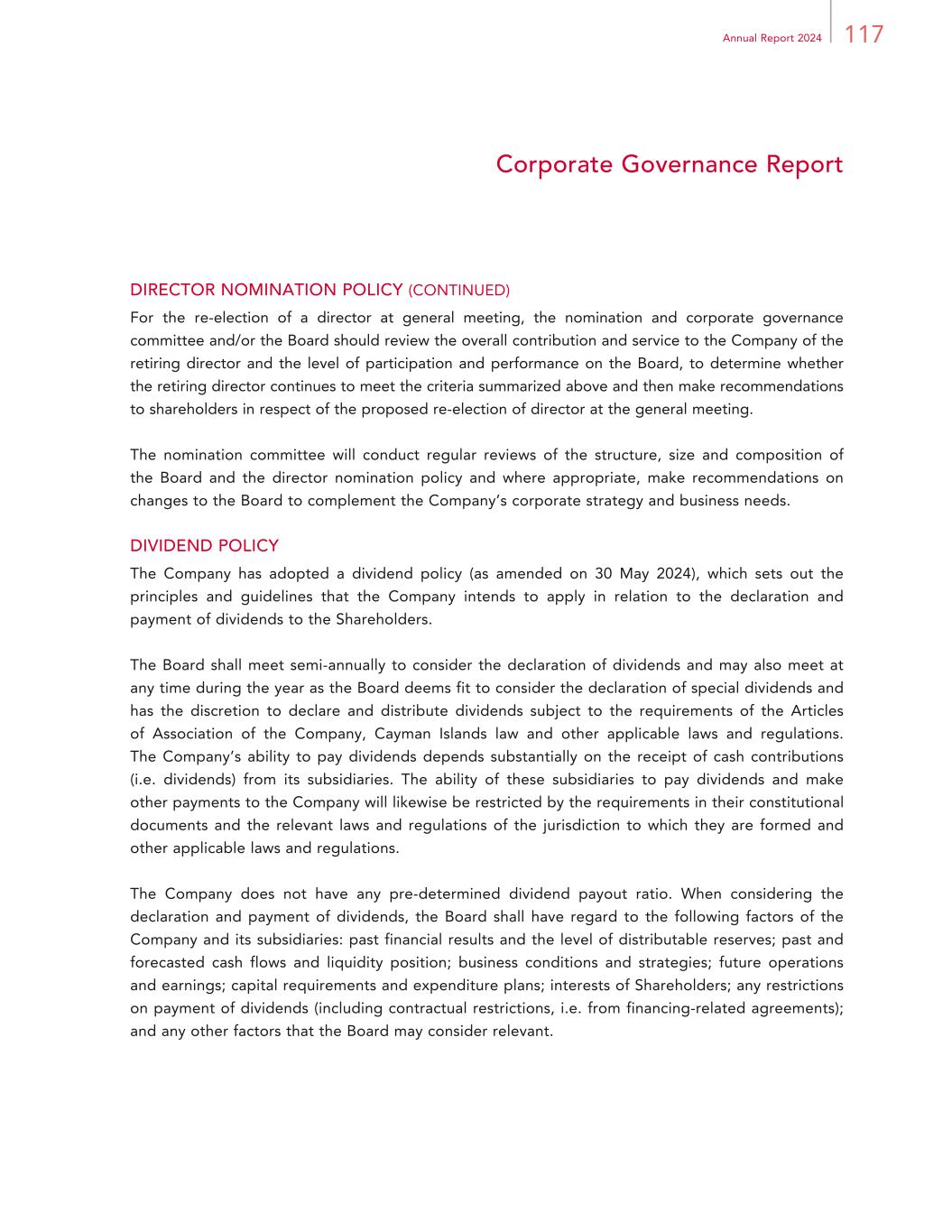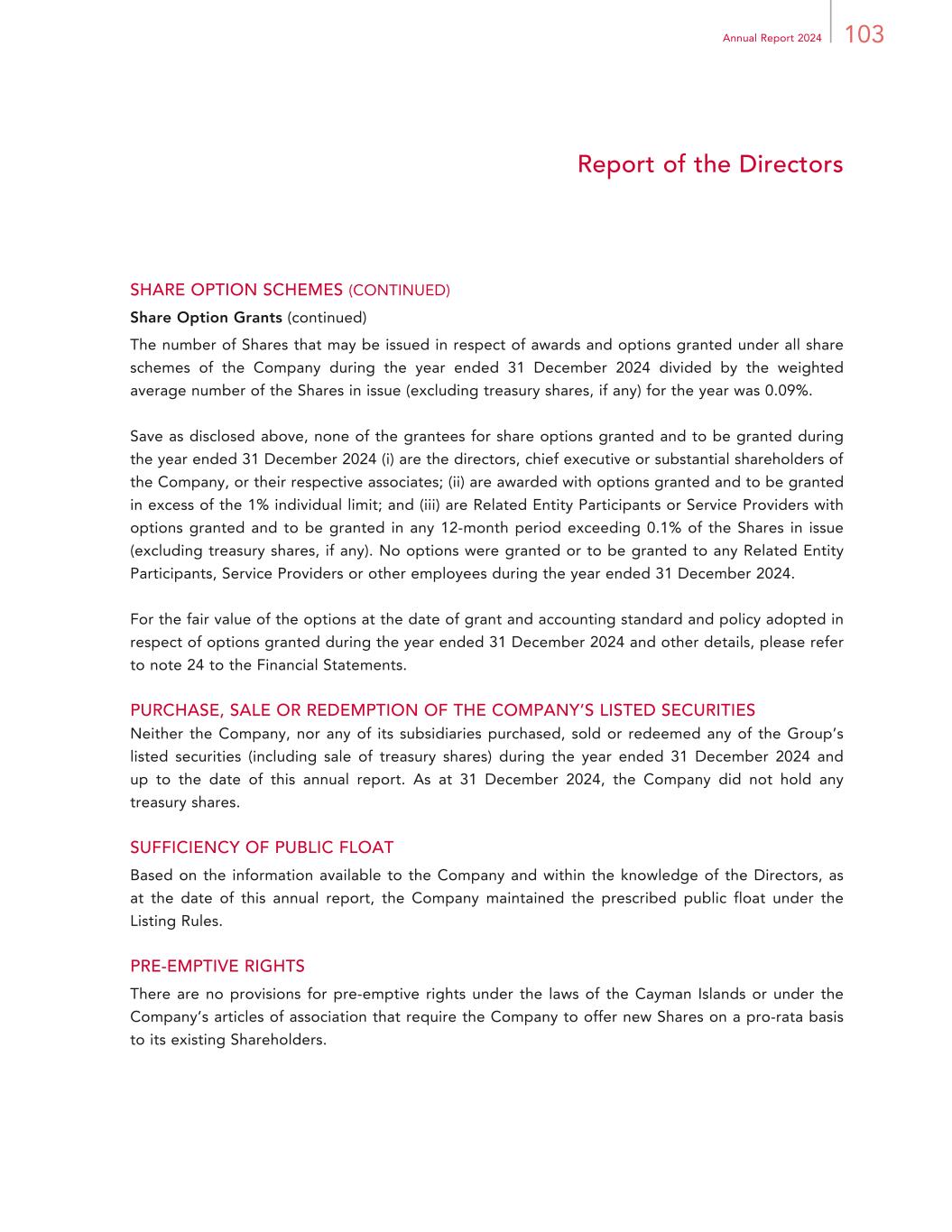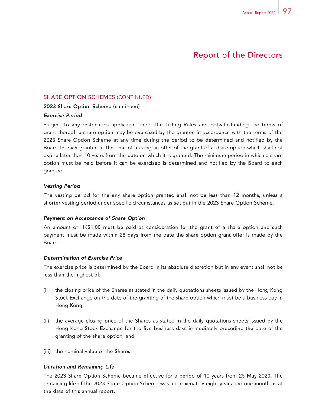 97Annual Report 2024 Report of the Directors SHARE OPTION SCHEMES (CONTINUED) 2023 Share Option Scheme (continued) Exercise Period Subject to any restrictions applicable under the Listing Rules and notwithstanding the terms of grant thereof, a share option may be exercised by the grantee in accordance with the terms of the 2023 Share Option Scheme at any time during the period to be determined and notified by the Board to each grantee at the time of making an offer of the grant of a share option which shall not expire later than 10 years from the date on which it is granted. The minimum period in which a share option must be held before it can be exercised is determined and notified by the Board to each grantee. Vesting Period The vesting period for the any share option granted shall not be less than 12 months, unless a shorter vesting period under specific circumstances as set out in the 2023 Share Option Scheme. Payment on Acceptance of Share Option An amount of HK$1.00 must be paid as consideration for the grant of a share option and such payment must be made within 28 days from the date the share option grant offer is made by the Board. Determination of Exercise Price The exercise price is determined by the Board in its absolute discretion but in any event shall not be less than the highest of: (i) the closing price of the Shares as stated in the daily quotations sheets issued by the Hong Kong Stock Exchange on the date of the granting of the share option which must be a business day in Hong Kong; (ii) the average closing price of the Shares as stated in the daily quotations sheets issued by the Hong Kong Stock Exchange for the five business days immediately preceding the date of the granting of the share option; and (iii) the nominal value of the Shares. Duration and Remaining Life The 2023 Share Option Scheme became effective for a period of 10 years from 25 May 2023. The remaining life of the 2023 Share Option Scheme was approximately eight years and one month as at the date of this annual report.