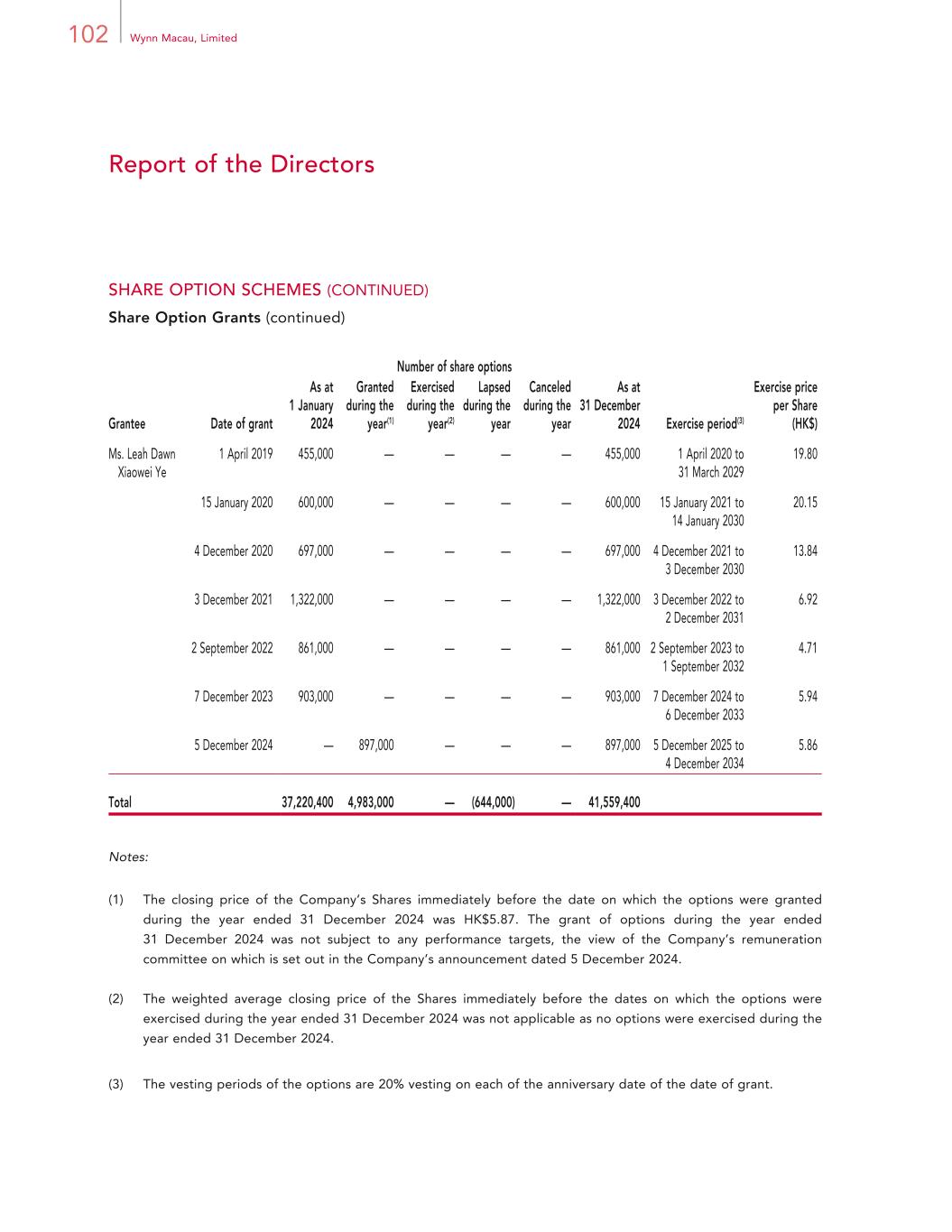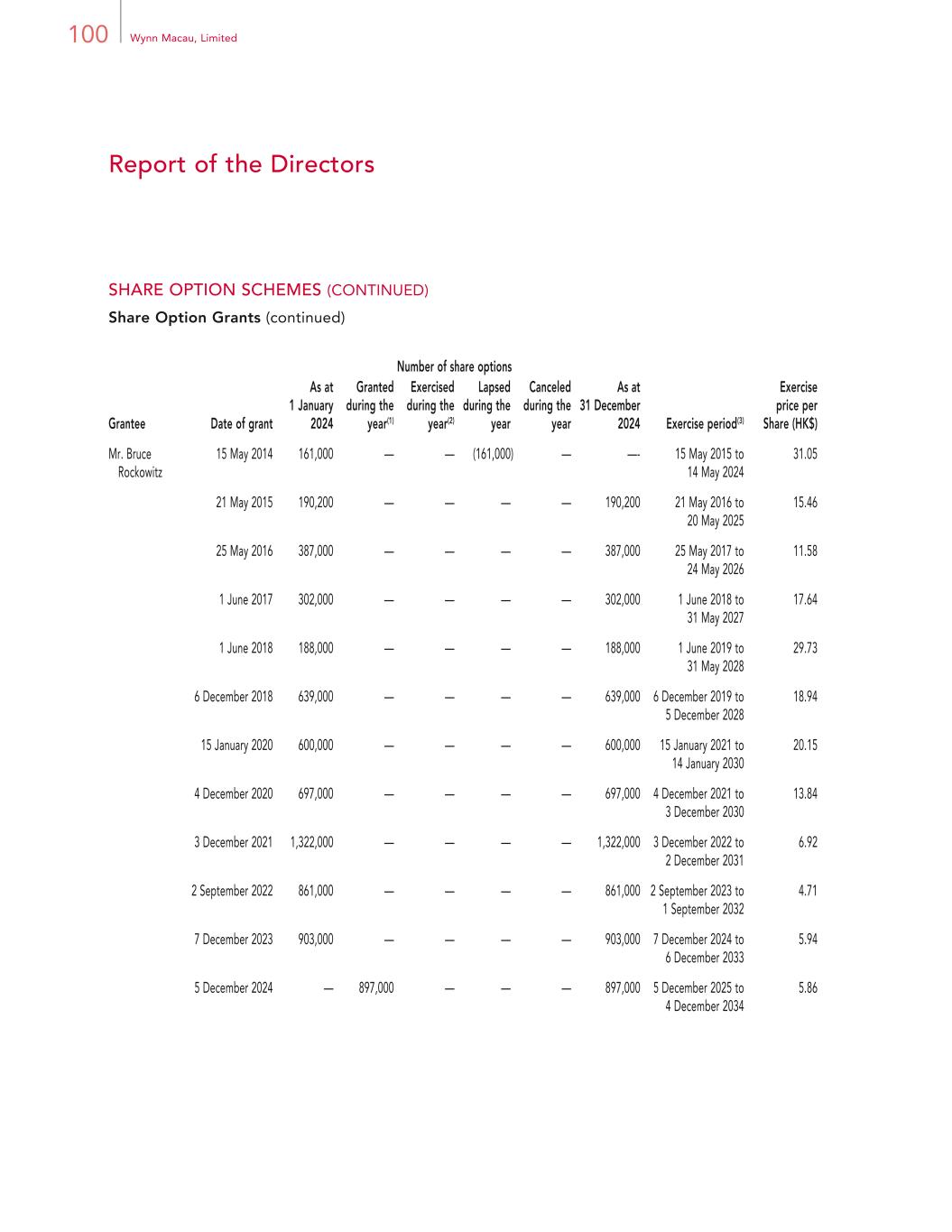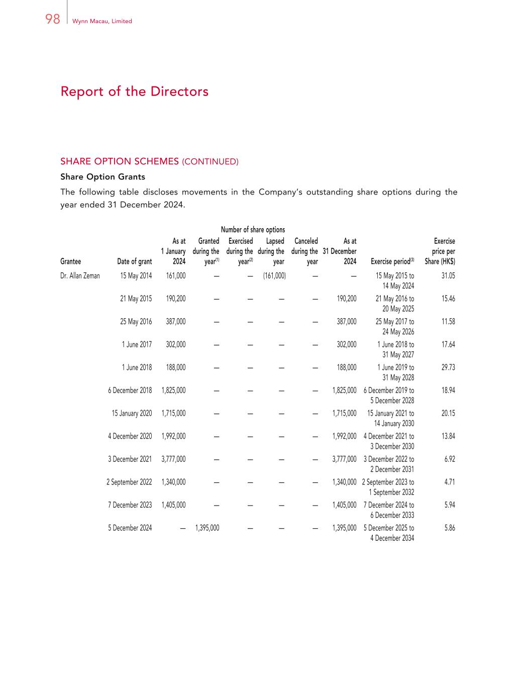 98 Wynn Macau, Limited Report of the Directors SHARE OPTION SCHEMES (CONTINUED) Share Option Grants The following table discloses movements in the Company’s outstanding share options during the year ended 31 December 2024. Number of share options Grantee Date of grant As at 1 January 2024 Granted during the year(1) Exercised during the year(2) Lapsed during the year Canceled during the year As at 31 December 2024 Exercise period(3) Exercise price per Share (HK$) Dr. Allan Zeman 15 May 2014 161,000 — — (161,000) — — 15 May 2015 to 14 May 2024 31.05 21 May 2015 190,200 — — — — 190,200 21 May 2016 to 20 May 2025 15.46 25 May 2016 387,000 — — — — 387,000 25 May 2017 to 24 May 2026 11.58 1 June 2017 302,000 — — — — 302,000 1 June 2018 to 31 May 2027 17.64 1 June 2018 188,000 — — — — 188,000 1 June 2019 to 31 May 2028 29.73 6 December 2018 1,825,000 — — — — 1,825,000 6 December 2019 to 5 December 2028 18.94 15 January 2020 1,715,000 — — — — 1,715,000 15 January 2021 to 14 January 2030 20.15 4 December 2020 1,992,000 — — — — 1,992,000 4 December 2021 to 3 December 2030 13.84 3 December 2021 3,777,000 — — — — 3,777,000 3 December 2022 to 2 December 2031 6.92 2 September 2022 1,340,000 — — — — 1,340,000 2 September 2023 to 1 September 2032 4.71 7 December 2023 1,405,000 — — — — 1,405,000 7 December 2024 to 6 December 2033 5.94 5 December 2024 — 1,395,000 — — — 1,395,000 5 December 2025 to 4 December 2034 5.86