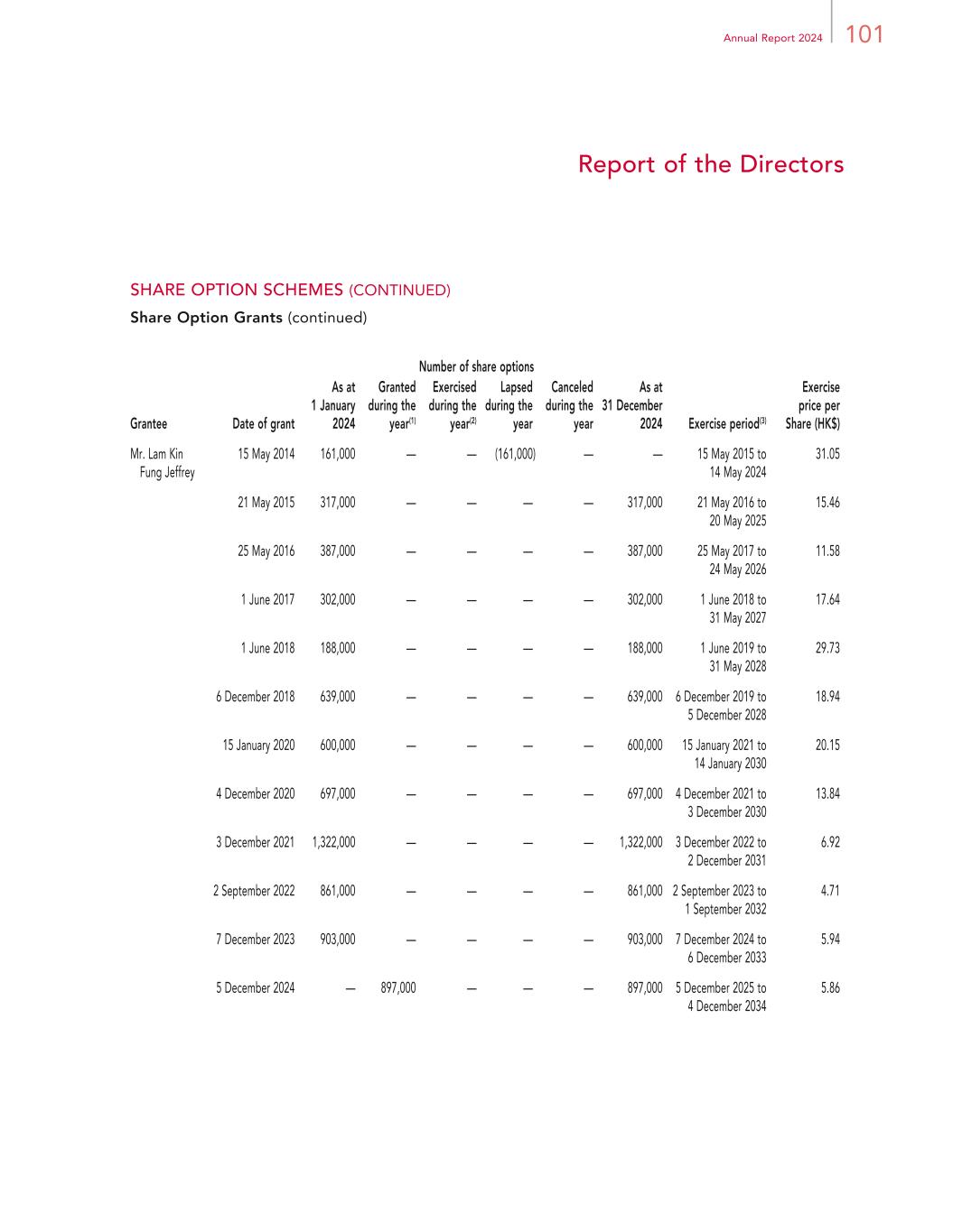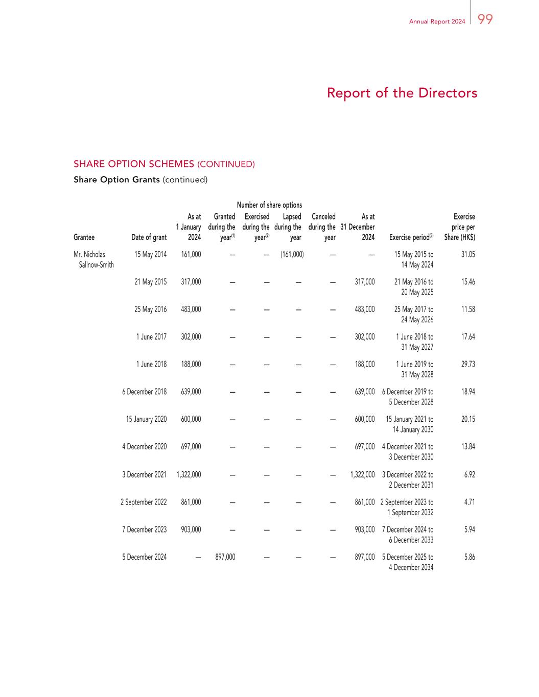 99Annual Report 2024 Report of the Directors SHARE OPTION SCHEMES (CONTINUED) Share Option Grants (continued) Number of share options Grantee Date of grant As at 1 January 2024 Granted during the year(1) Exercised during the year(2) Lapsed during the year Canceled during the year As at 31 December 2024 Exercise period(3) Exercise price per Share (HK$) Mr. Nicholas Sallnow-Smith 15 May 2014 161,000 — — (161,000) — — 15 May 2015 to 14 May 2024 31.05 21 May 2015 317,000 — — — — 317,000 21 May 2016 to 20 May 2025 15.46 25 May 2016 483,000 — — — — 483,000 25 May 2017 to 24 May 2026 11.58 1 June 2017 302,000 — — — — 302,000 1 June 2018 to 31 May 2027 17.64 1 June 2018 188,000 — — — — 188,000 1 June 2019 to 31 May 2028 29.73 6 December 2018 639,000 — — — — 639,000 6 December 2019 to 5 December 2028 18.94 15 January 2020 600,000 — — — — 600,000 15 January 2021 to 14 January 2030 20.15 4 December 2020 697,000 — — — — 697,000 4 December 2021 to 3 December 2030 13.84 3 December 2021 1,322,000 — — — — 1,322,000 3 December 2022 to 2 December 2031 6.92 2 September 2022 861,000 — — — — 861,000 2 September 2023 to 1 September 2032 4.71 7 December 2023 903,000 — — — — 903,000 7 December 2024 to 6 December 2033 5.94 5 December 2024 — 897,000 — — — 897,000 5 December 2025 to 4 December 2034 5.86