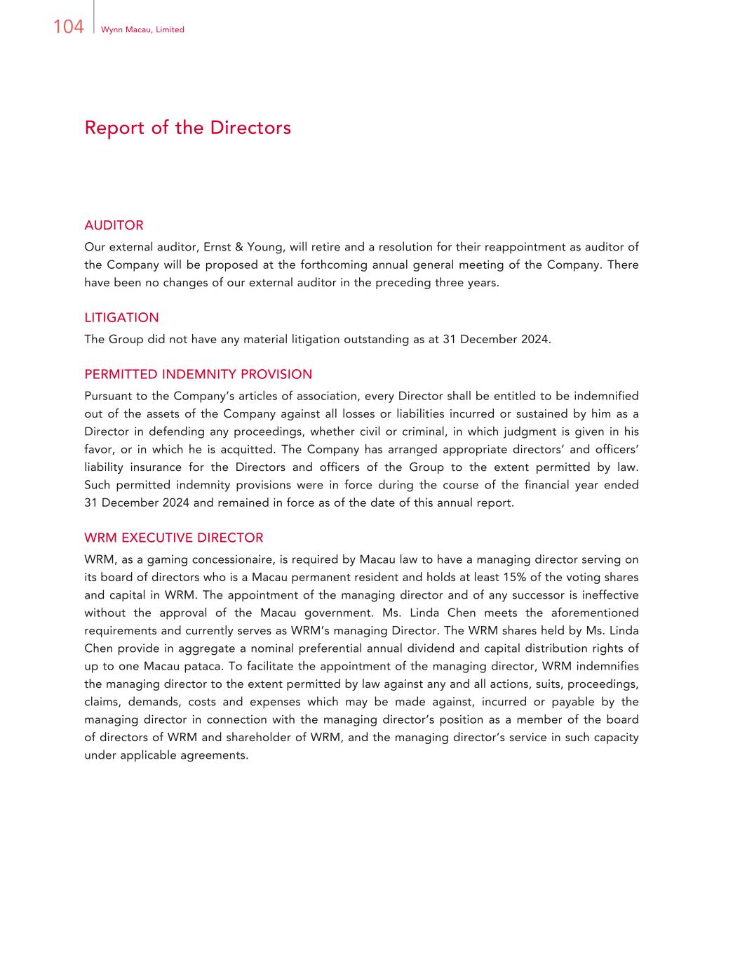 75Annual Report 2024 Report of the Directors CONNECTED TRANSACTIONS (CONTINUED) Continuing Connected Transactions (continued) Compliance Services Framework Agreement (continued) Nature and purpose of transaction. The Company and WRM agreed to engage WRL Group to assist the Group in compliance with the obligations under the Gaming Concession Contract. The services to be provided by WRL Group include, without limitation, financial planning and strategy related to payment obligations and certain commitments under the Gaming Concession Contract; project design, planning, coordination and management; government communication, notification, reporting, filing and approval; strategy and coordination related to potential capital market transactions; brand consultancy and marketing; public relations and media relations; business opportunities identification and collaboration; campaign activations; and retail marketing (collectively, the “Services”). Pricing. The Company and WRM agreed to pay WRL Group for costs and expenses incurred by WRL Group in the performance of the Services to the Group. Approximately HK$9.1 million was charged to WRM by WRL Group under this agreement during the year ended 31 December 2024. Term. The term of the compliance services framework agreement commenced on 30 March 2023 and will expire on 31 December 2025. Unless otherwise terminated in accordance with the provisions therein, the compliance services framework agreement will be automatically renewed for a three-year term (or such other period as may be permitted under the Listing Rules) subject to compliance with Listing Rules requirements or, alternatively, any waivers obtained from strict compliance with such requirements. In compliance with the Listing Rules, the Company announced on 30 March 2023 the annual caps under the compliance services framework agreement set for the years ended 31 December 2023 and 2024 and the year ending 31 December 2025. Intellectual Property License Agreements Nature and purpose of transaction. On 19 September 2009, the Company and WRM entered into an intellectual property license agreement and an amended and restated intellectual property license agreement, respectively, with Wynn Resorts, Limited and Wynn Resorts Holdings, LLC, a subsidiary of Wynn Resorts, Limited (the “Old Intellectual Property License Agreements”). Under the respective agreements, Wynn Resorts, Limited and Wynn Resorts Holdings, LLC grant the Company and WRM the license to use certain intellectual property (the “WRL’s IPs”), including certain trademarks, domain names, “WYNN” related trademarks, copyrights and service marks in connection with a variety of goods and services. These marks include “WYNN MACAU”, “ENCORE” and “WYNN PALACE” as well as trademarks of the Chinese characters representing “WYNN”.