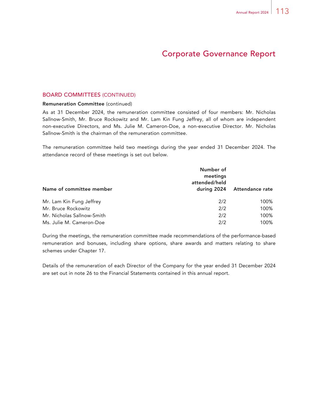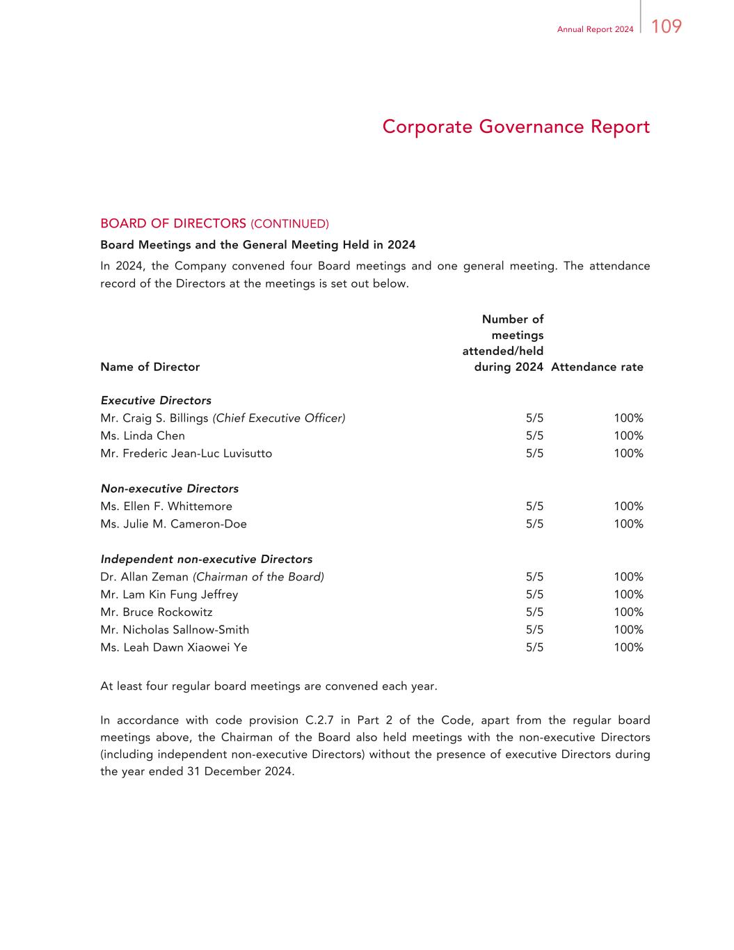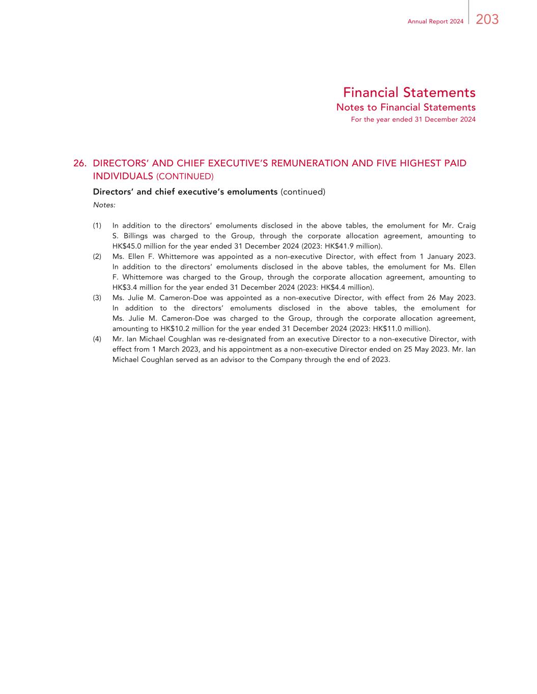 203Annual Report 2024 Financial Statements Notes to Financial Statements For the year ended 31 December 2024 26. DIRECTORS’ AND CHIEF EXECUTIVE’S REMUNERATION AND FIVE HIGHEST PAID INDIVIDUALS (CONTINUED) Directors’ and chief executive’s emoluments (continued) Notes: (1) In addition to the directors’ emoluments disclosed in the above tables, the emolument for Mr. Craig S. Billings was charged to the Group, through the corporate allocation agreement, amounting to HK$45.0 million for the year ended 31 December 2024 (2023: HK$41.9 million). (2) Ms. Ellen F. Whittemore was appointed as a non-executive Director, with effect from 1 January 2023. In addition to the directors’ emoluments disclosed in the above tables, the emolument for Ms. Ellen F. Whittemore was charged to the Group, through the corporate allocation agreement, amounting to HK$3.4 million for the year ended 31 December 2024 (2023: HK$4.4 million). (3) Ms. Julie M. Cameron-Doe was appointed as a non-executive Director, with effect from 26 May 2023. In addition to the directors’ emoluments disclosed in the above tables, the emolument for Ms. Julie M. Cameron-Doe was charged to the Group, through the corporate allocation agreement, amounting to HK$10.2 million for the year ended 31 December 2024 (2023: HK$11.0 million). (4) Mr. Ian Michael Coughlan was re-designated from an executive Director to a non-executive Director, with effect from 1 March 2023, and his appointment as a non-executive Director ended on 25 May 2023. Mr. Ian Michael Coughlan served as an advisor to the Company through the end of 2023.
