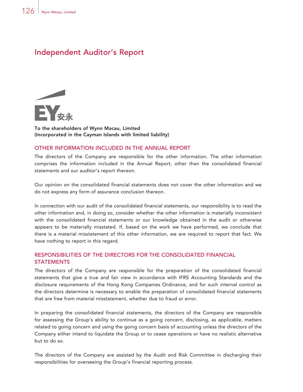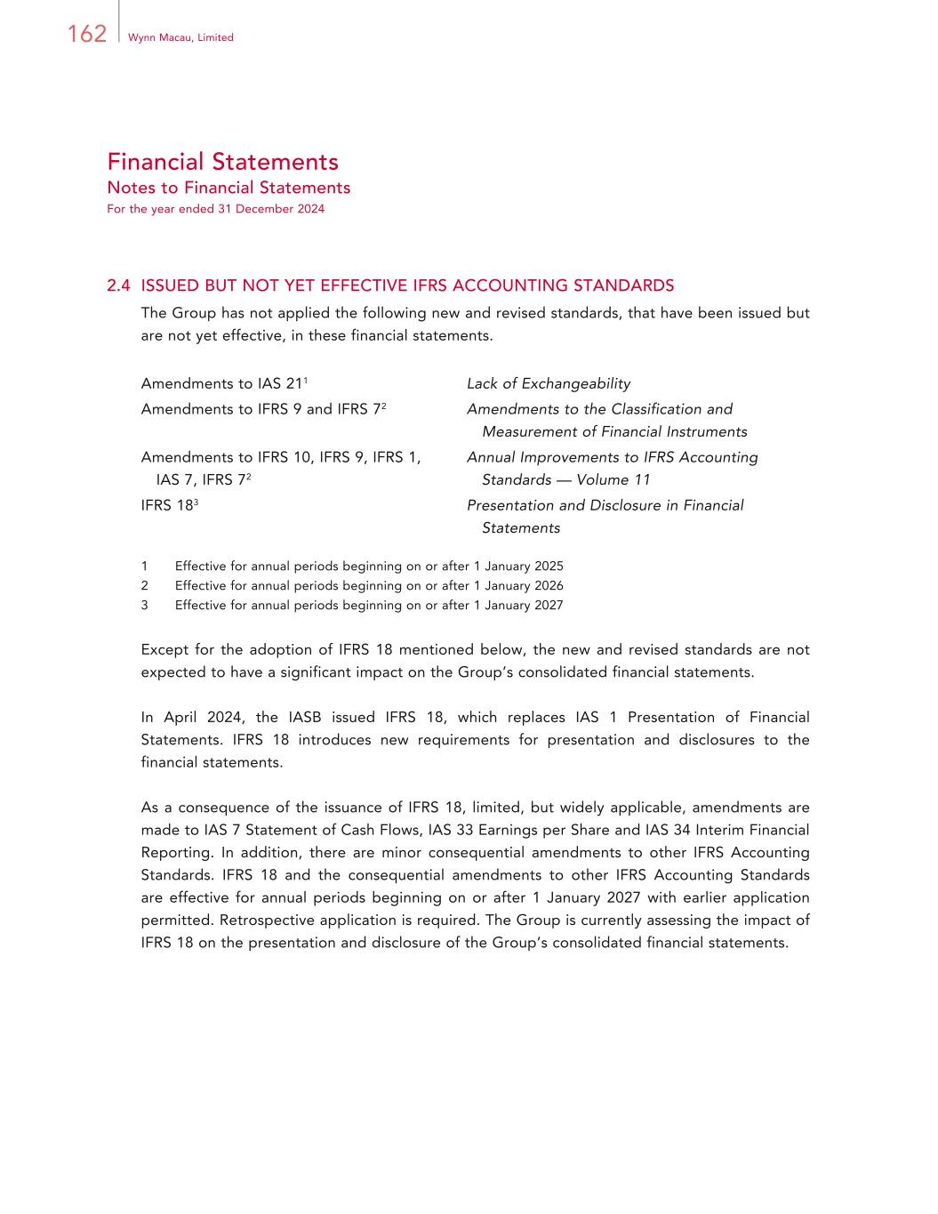 162 Wynn Macau, Limited Financial Statements Notes to Financial Statements For the year ended 31 December 2024 2.4 ISSUED BUT NOT YET EFFECTIVE IFRS ACCOUNTING STANDARDS The Group has not applied the following new and revised standards, that have been issued but are not yet effective, in these financial statements. Amendments to IAS 211 Lack of Exchangeability Amendments to IFRS 9 and IFRS 72 Amendments to the Classification and Measurement of Financial Instruments Amendments to IFRS 10, IFRS 9, IFRS 1, IAS 7, IFRS 72 Annual Improvements to IFRS Accounting Standards — Volume 11 IFRS 183 Presentation and Disclosure in Financial Statements 1 Effective for annual periods beginning on or after 1 January 2025 2 Effective for annual periods beginning on or after 1 January 2026 3 Effective for annual periods beginning on or after 1 January 2027 Except for the adoption of IFRS 18 mentioned below, the new and revised standards are not expected to have a significant impact on the Group’s consolidated financial statements. In April 2024, the IASB issued IFRS 18, which replaces IAS 1 Presentation of Financial Statements. IFRS 18 introduces new requirements for presentation and disclosures to the financial statements. As a consequence of the issuance of IFRS 18, limited, but widely applicable, amendments are made to IAS 7 Statement of Cash Flows, IAS 33 Earnings per Share and IAS 34 Interim Financial Reporting. In addition, there are minor consequential amendments to other IFRS Accounting Standards. IFRS 18 and the consequential amendments to other IFRS Accounting Standards are effective for annual periods beginning on or after 1 January 2027 with earlier application permitted. Retrospective application is required. The Group is currently assessing the impact of IFRS 18 on the presentation and disclosure of the Group’s consolidated financial statements.