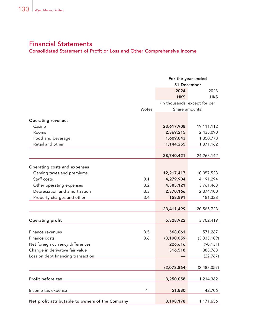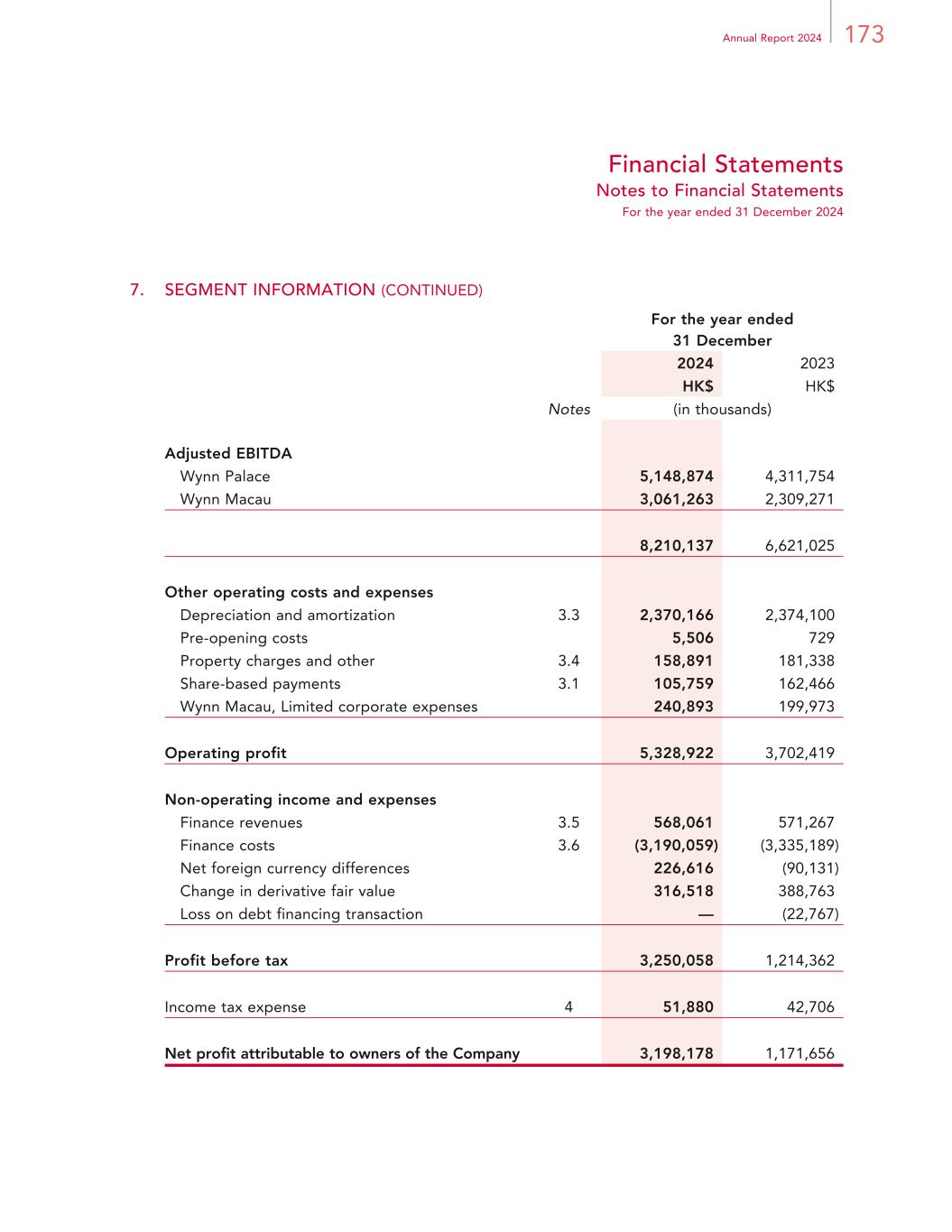 173Annual Report 2024 Financial Statements Notes to Financial Statements For the year ended 31 December 2024 7. SEGMENT INFORMATION (CONTINUED) For the year ended 31 December 2024 2023 HK$ HK$ Notes (in thousands) Adjusted EBITDA Wynn Palace 5,148,874 4,311,754 Wynn Macau 3,061,263 2,309,271 8,210,137 6,621,025 Other operating costs and expenses Depreciation and amortization 3.3 2,370,166 2,374,100 Pre-opening costs 5,506 729 Property charges and other 3.4 158,891 181,338 Share-based payments 3.1 105,759 162,466 Wynn Macau, Limited corporate expenses 240,893 199,973 Operating profit 5,328,922 3,702,419 Non-operating income and expenses Finance revenues 3.5 568,061 571,267 Finance costs 3.6 (3,190,059) (3,335,189) Net foreign currency differences 226,616 (90,131) Change in derivative fair value 316,518 388,763 Loss on debt financing transaction — (22,767) Profit before tax 3,250,058 1,214,362 Income tax expense 4 51,880 42,706 Net profit attributable to owners of the Company 3,198,178 1,171,656